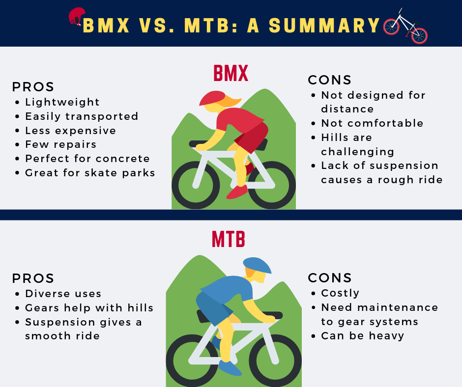 BMX and MTB share a couple of things in common. First, they both have two wheels, and second, like most bicycles, they come with a seat and handlebars.