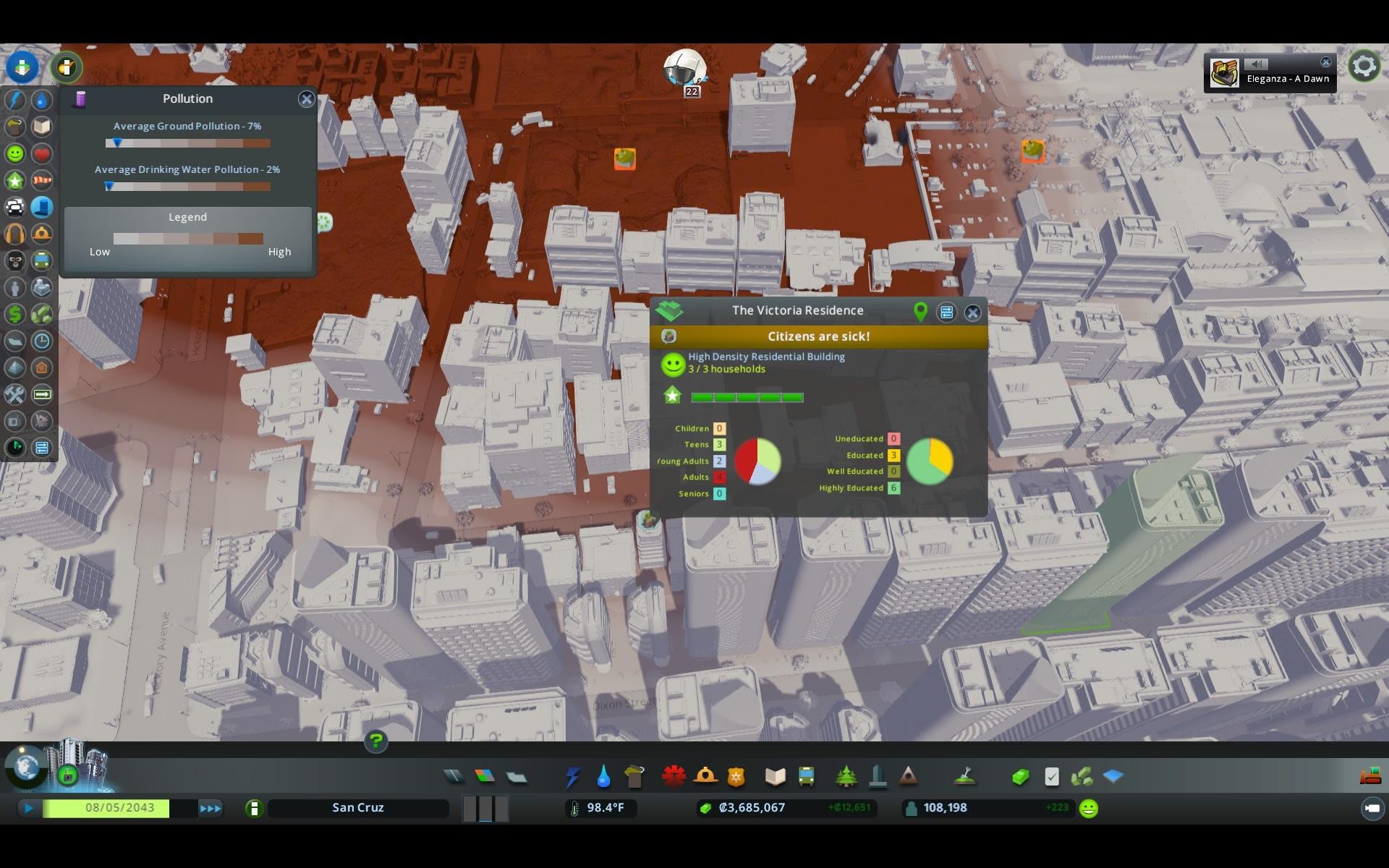 Pollution is rarely used as a selling point in real estate brochures so should be avoided at all costs. Pollution is simulated in Cities: Skylines and there are a few ways to make sure it does not disturb the city. There are two types – noise and ground / water pollution. Ground pollution is mainly created by industrial areas, but can also be created from sewage outlets, fossil-fuel power stations and garbage disposals. Keep these away from residential areas to avoid sickness and unhappiness.