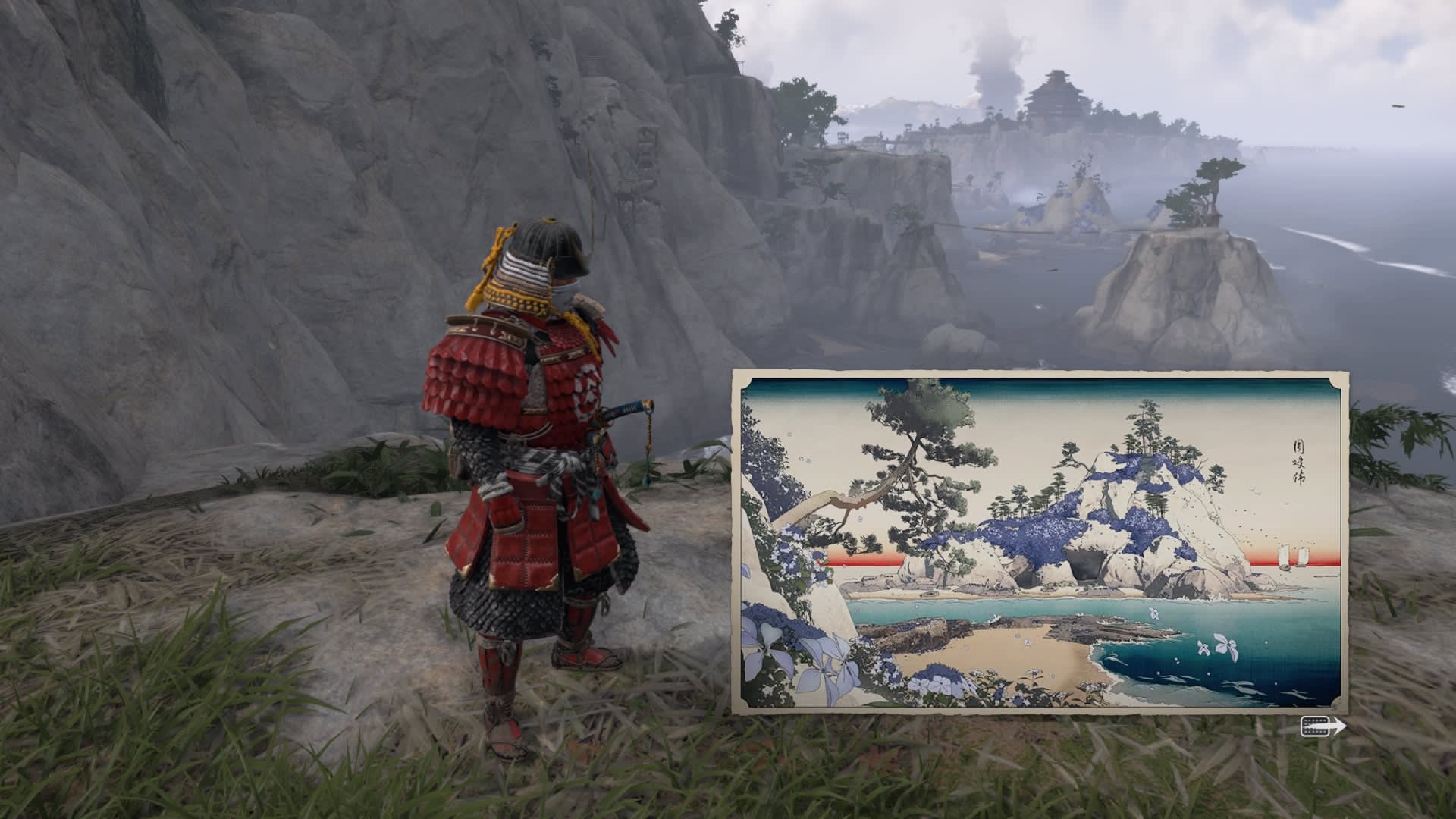 As you exit the cave, someone in a Tengu Demon mask will fire a warning shot at you and warn you to abandon your quest. Of course, you're not going to listen to them. The peninsula can be found near the top of the map’s search area, with a path of blue flowers leading you safely down the coast. Inside the peninsula’s tomb, you’ll find another painting, and you will exit to another Tengu Demon warning.