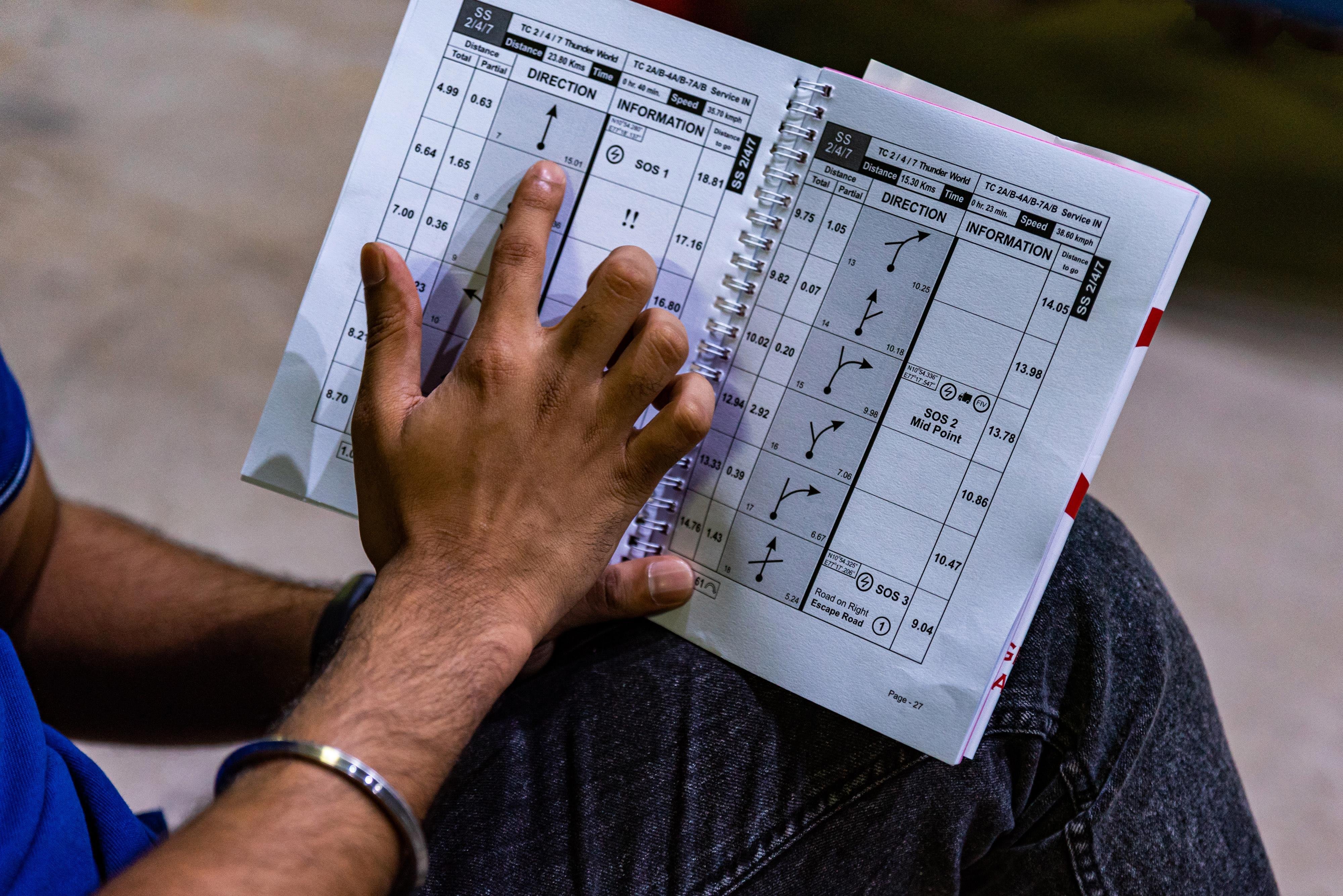 The road book helps Dean and his co-driver navigate through the stages on the race weekend. The road book contains details on direction, kilometre readings, markings on course, etc. It will specify the turns, bumps on the terrain, speed breakers if any, signboards to look out for, etc.