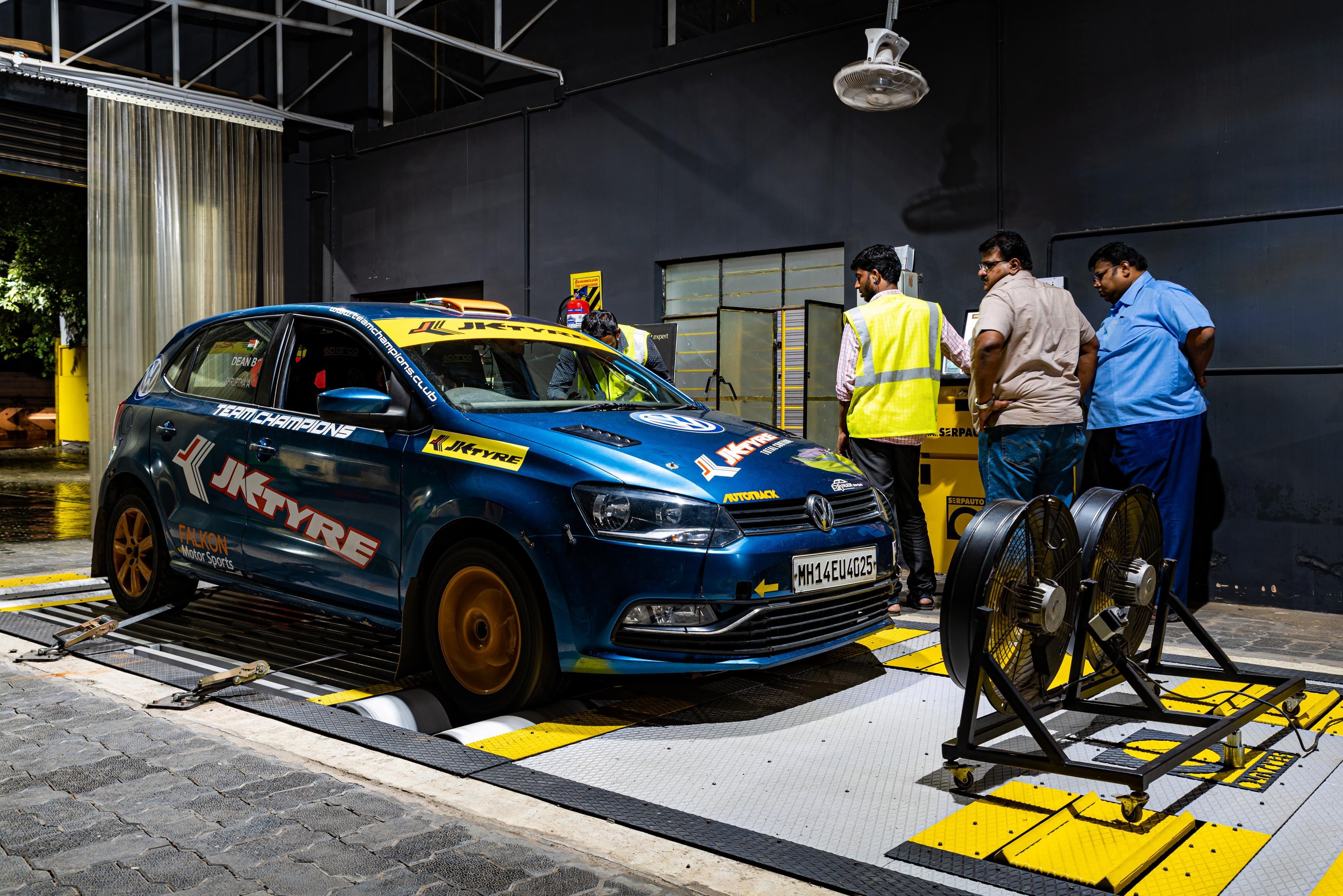 These checks are conducted on the seats, seat belts, helmets, helmet nets, fire extinguisher, impact guards, and other safety equipment. The interior of the car has a permanent welding of a roll cage to add to the safety in case of an accident.
