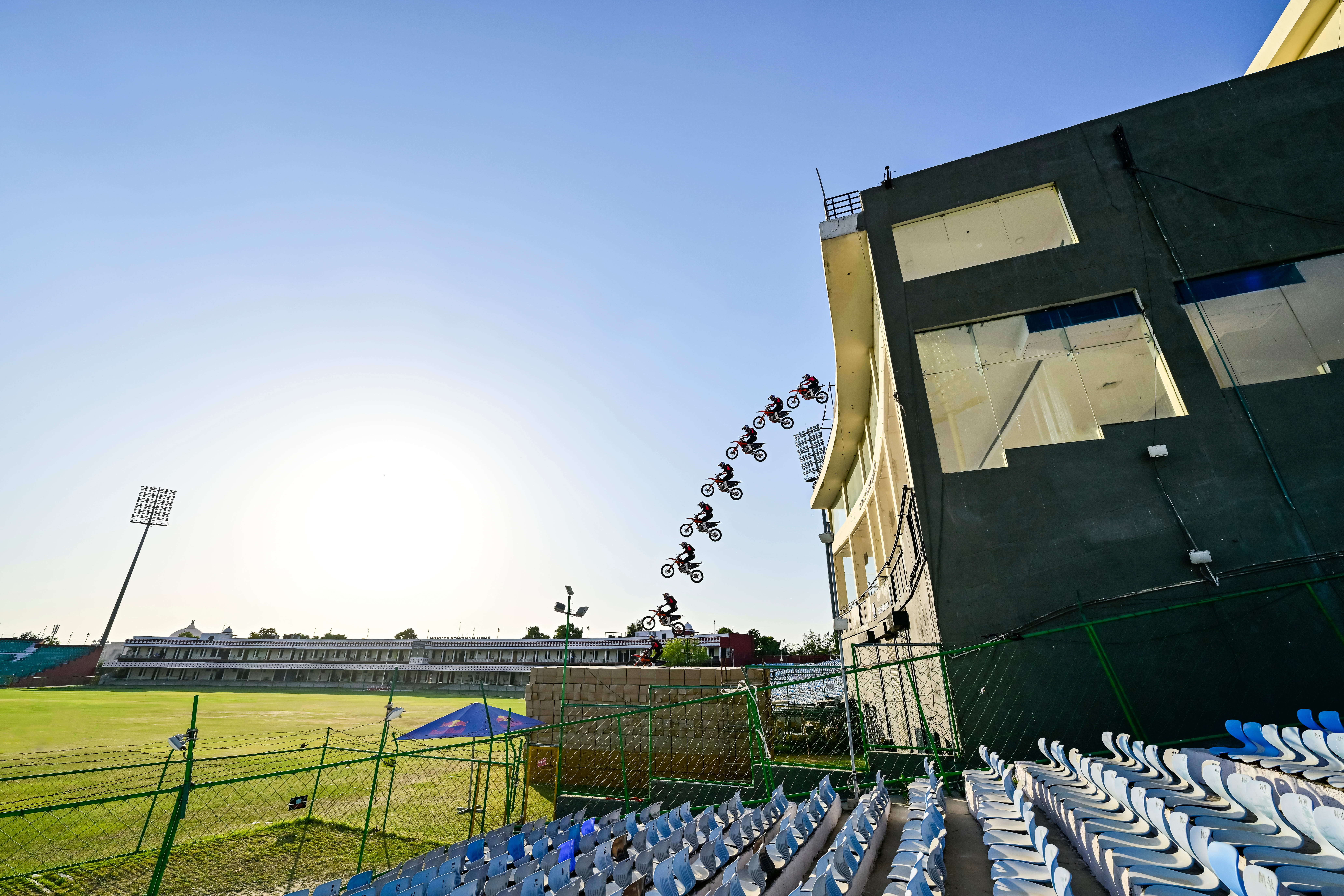 He rode up the five-storey administration building at the Sawai Mansingh Stadium, took a deep breath and performed what he described as “a world first” – he launched his bike off the building and onto the cricket field, where he successfully delivered the package to the Rajasthan Royals players.