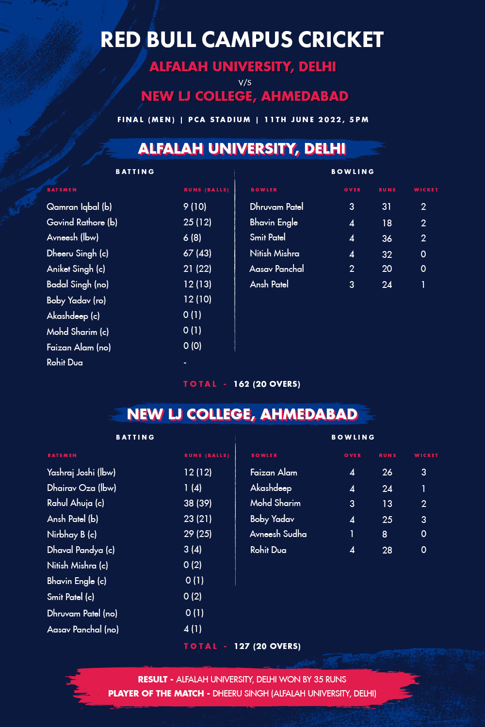 Alfalah University, Delhi, won the toss and decided to bat first. They put up a score of 162 for the loss of eight wickets in their 20 overs. In reply, New LJ College, Ahmedabad, only amanged to score 127 runs in 20 overs, losing nine wickets in the process. Dheeru Singh of Alfalah University, Delhi, was the player of the match for his innings of 67 runs in 43 balls that included five maximums and five boundaries.