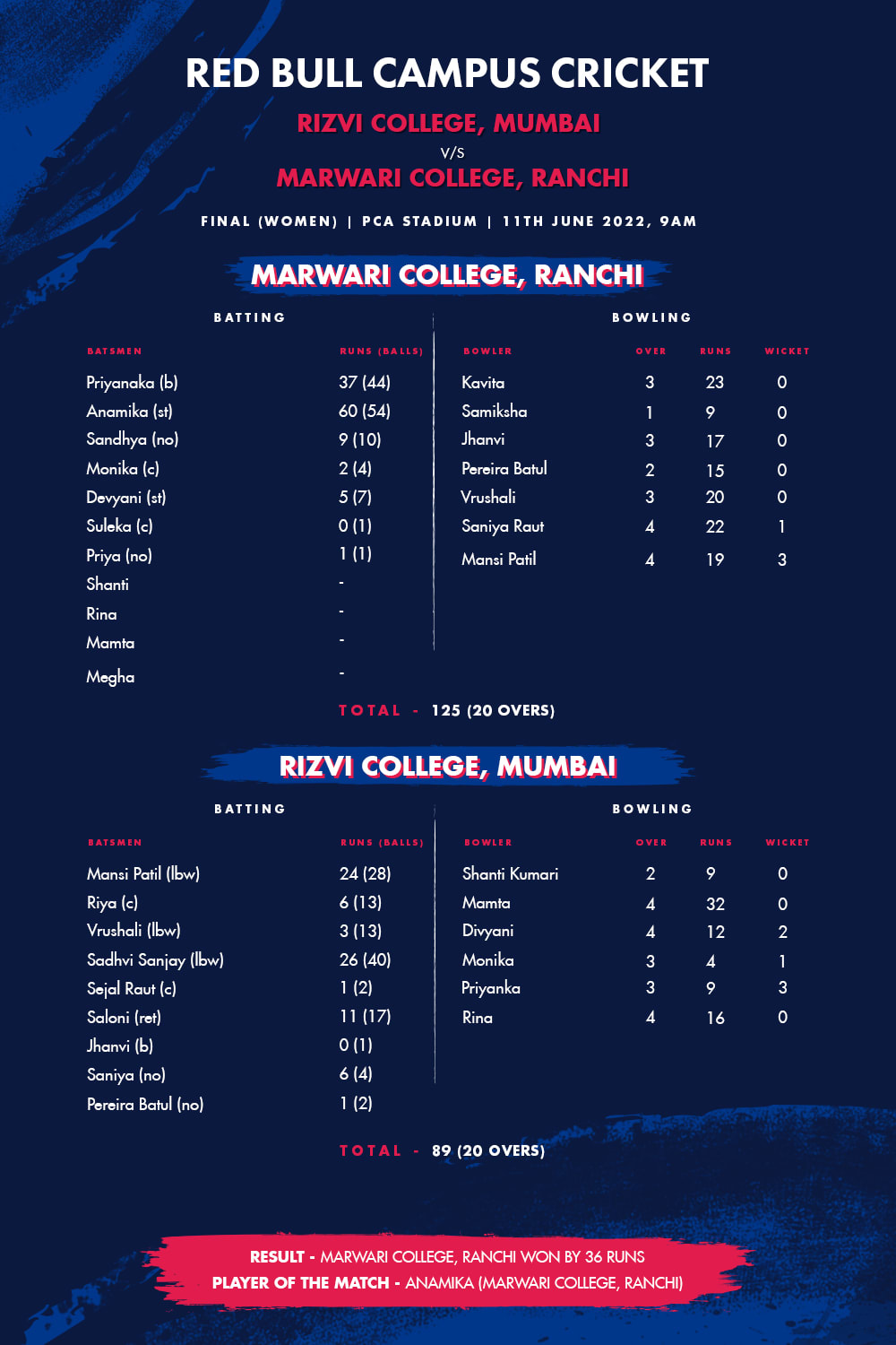 Marwari College, Ranchi, won the toss and decided they would bat first. The batters of the Ranchi team managed a score of 125 runs for the loss of five wickets in 20 overs. Rizvi College, Mumbai, took the stumps and managed 89 runs for six wickets in 20 overs. Anamika of Marwari College, Ranchi, won the player of the match award for her 60 runs in 54 balls, which included eight boundaries.