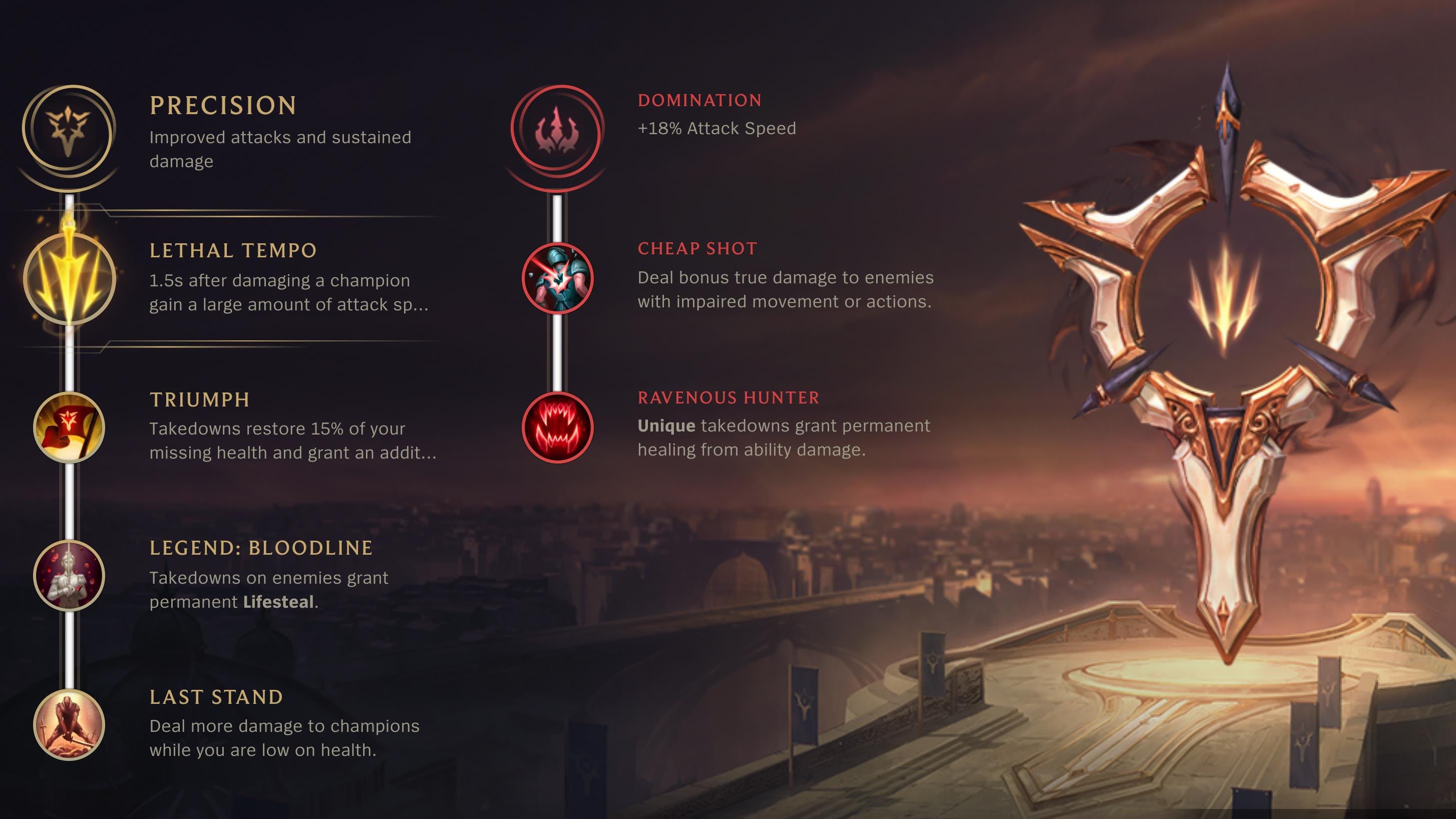 Alternatively Domination could be used as a replacement, where Cheap Shot synergises with Xayah’s E, as well as Ravenous Hunter being a useful asset, yet again contributing to the possibility of a tight situation.