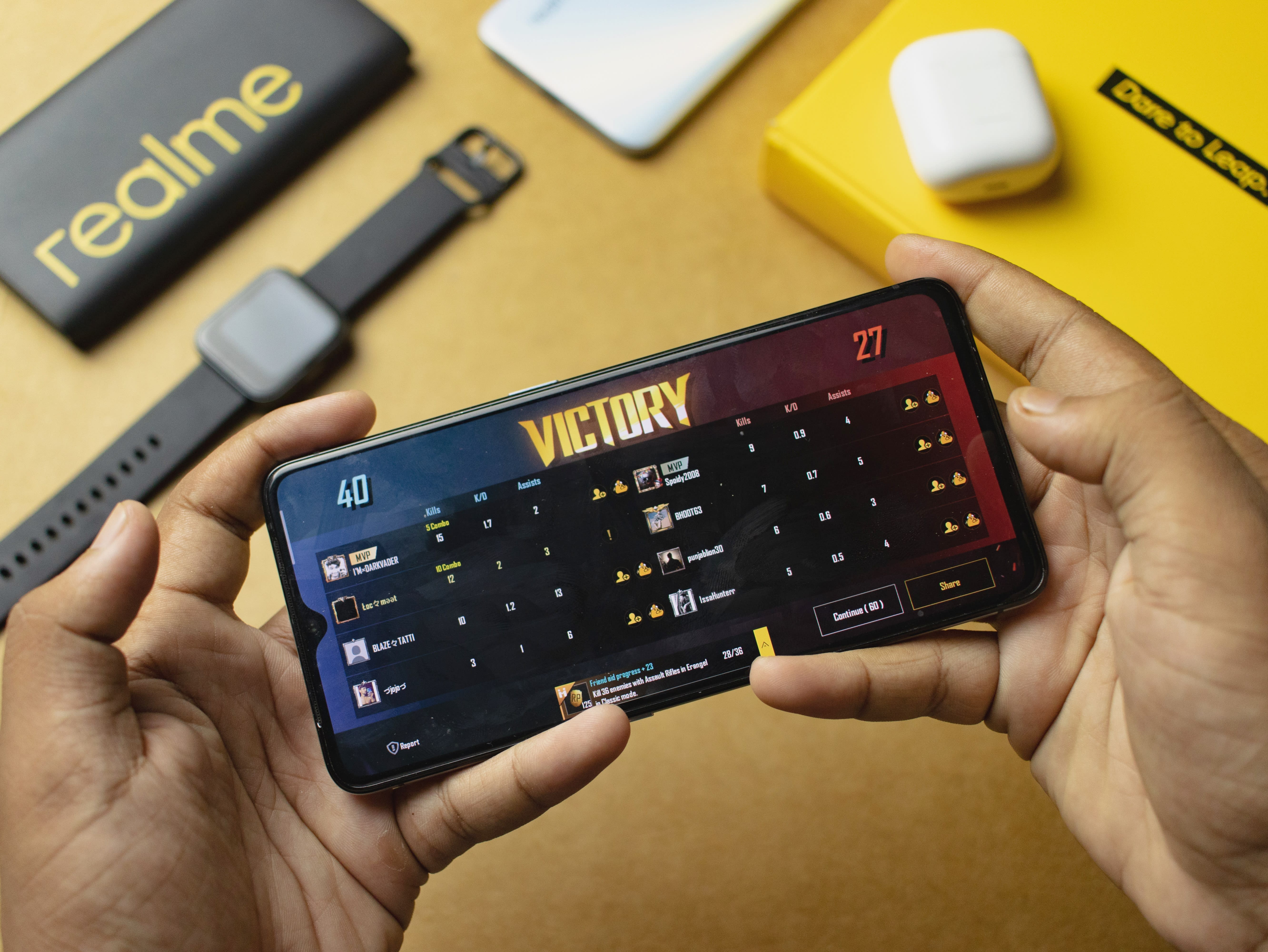 अपने realme फोन पर पबजी मोबाइल खेल रहे गेमर की तस्वीर.