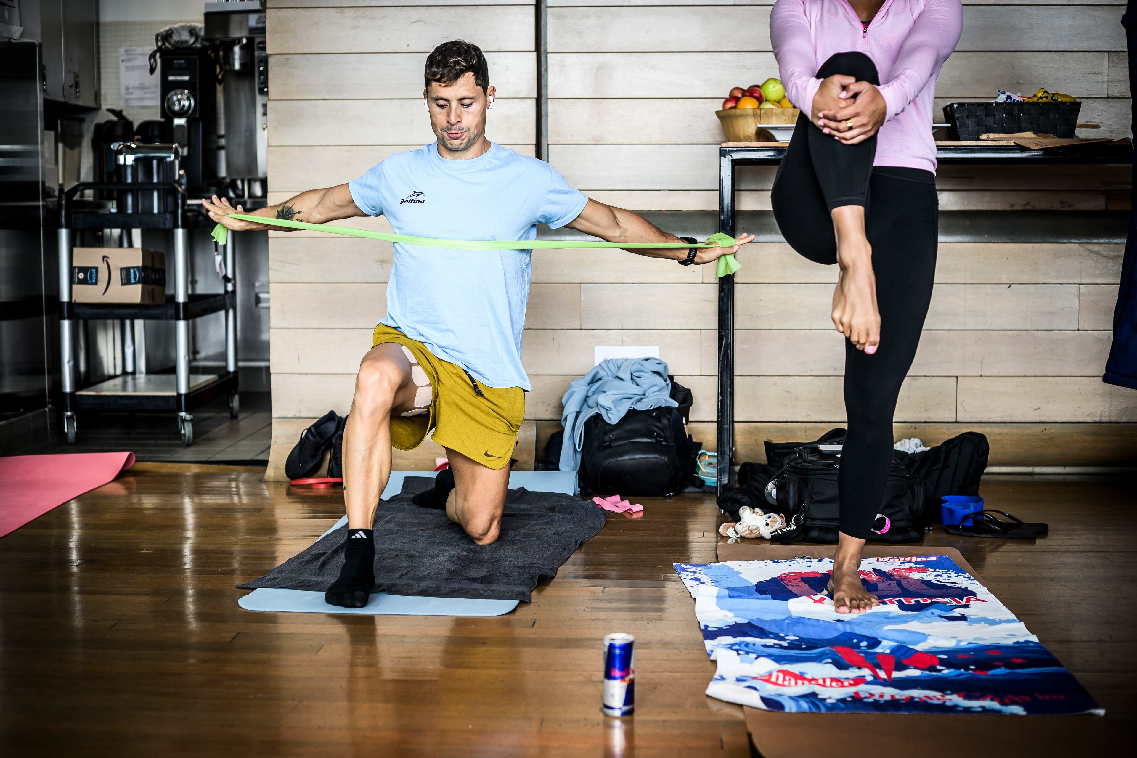 Constantin Popovici of Romania stretches at the athletes' area during the training day of the final stop of the Red Bull Cliff Diving World Series in Boston, USA, on September 18, 2025.