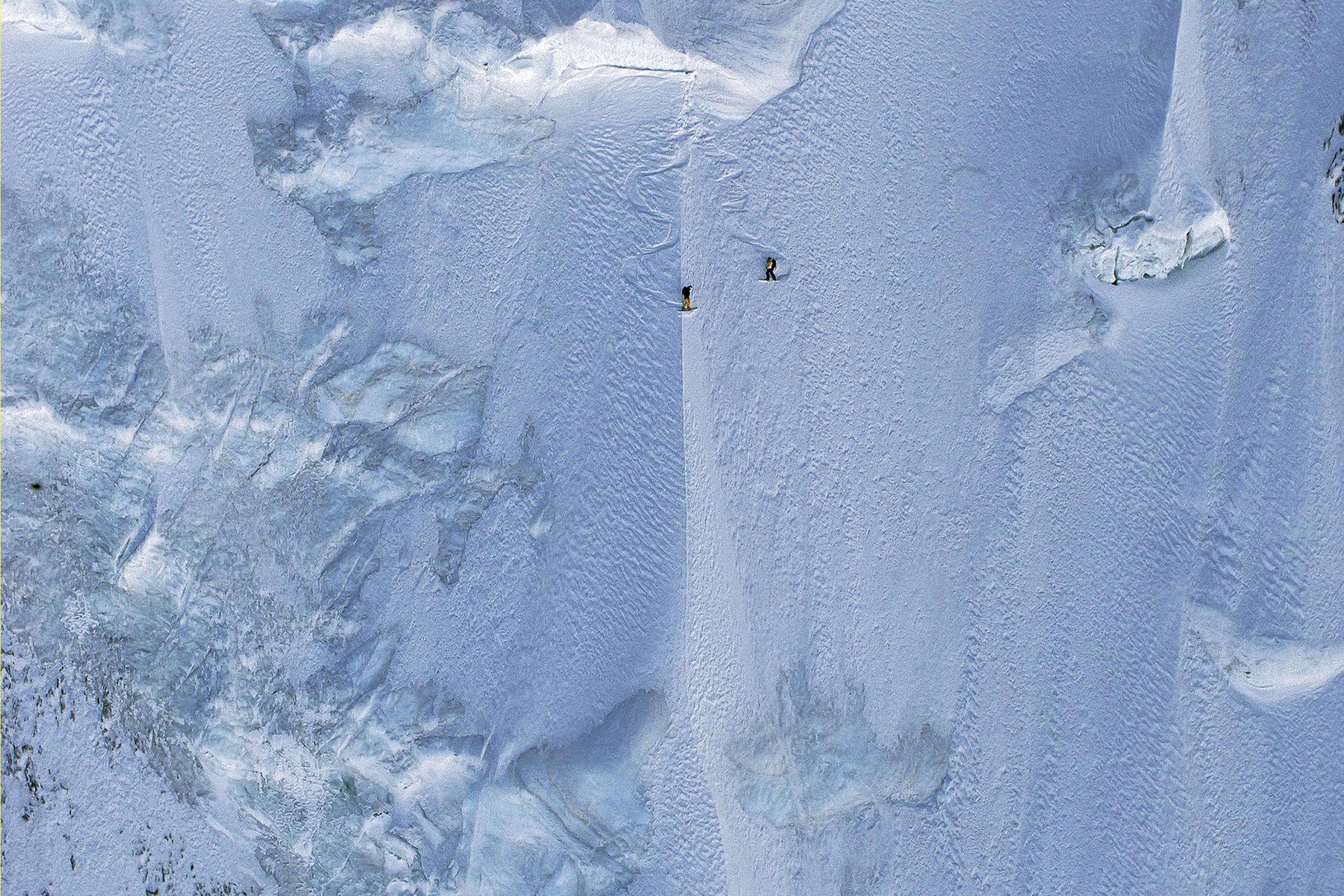 There's moments like when guides tested the snow stability of the face and accidentally triggered a massive avalanche that almost buried Kaj Zackrisson, who was on face inspection just at the bottom of the hill. "I got super scared, turned around and skied away, and traversed up from that avalanche. But then, in the next chute, over came an even bigger avalanche," he recalls.