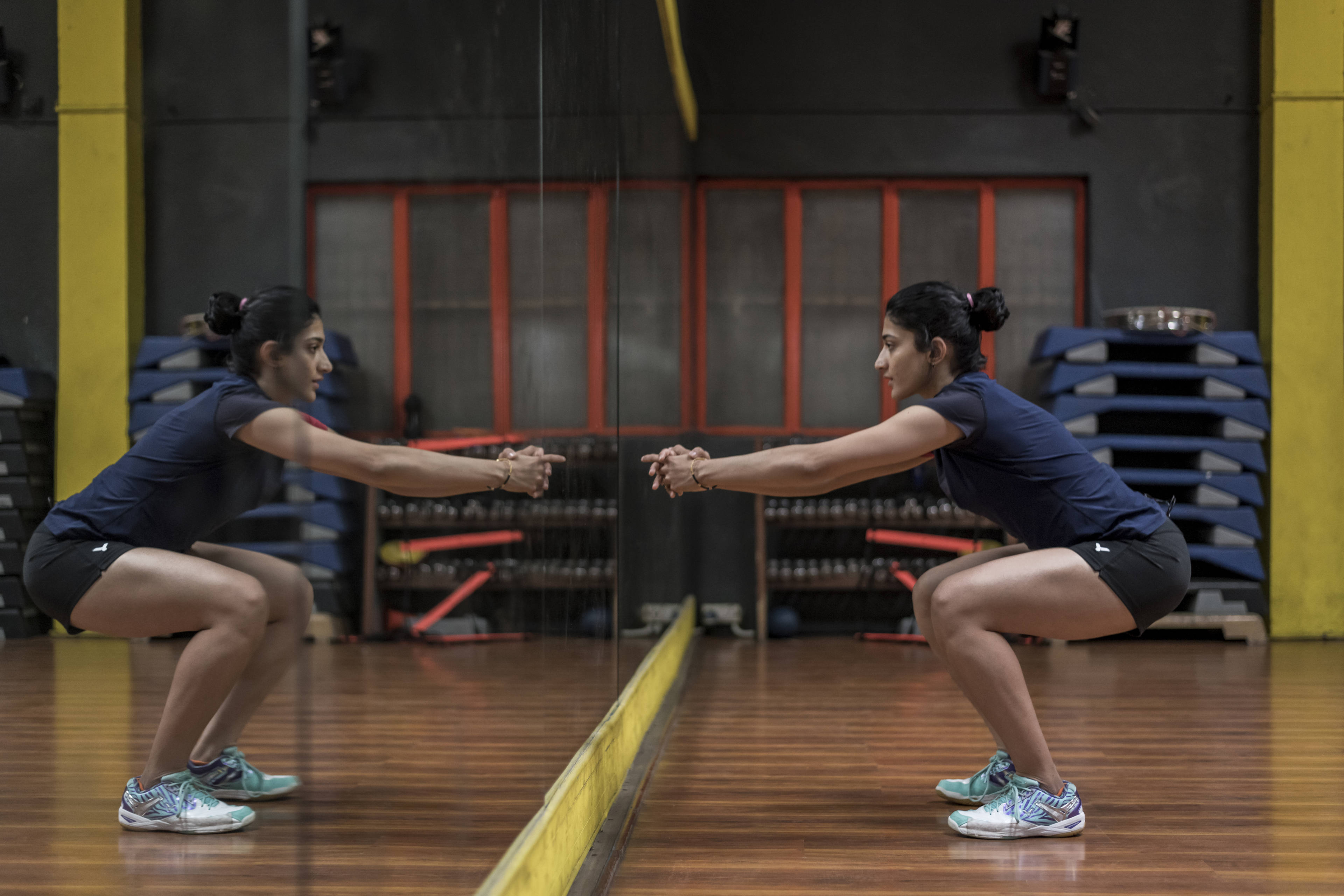 Ashwini Ponnappa squats in front of a mirror to master her movement