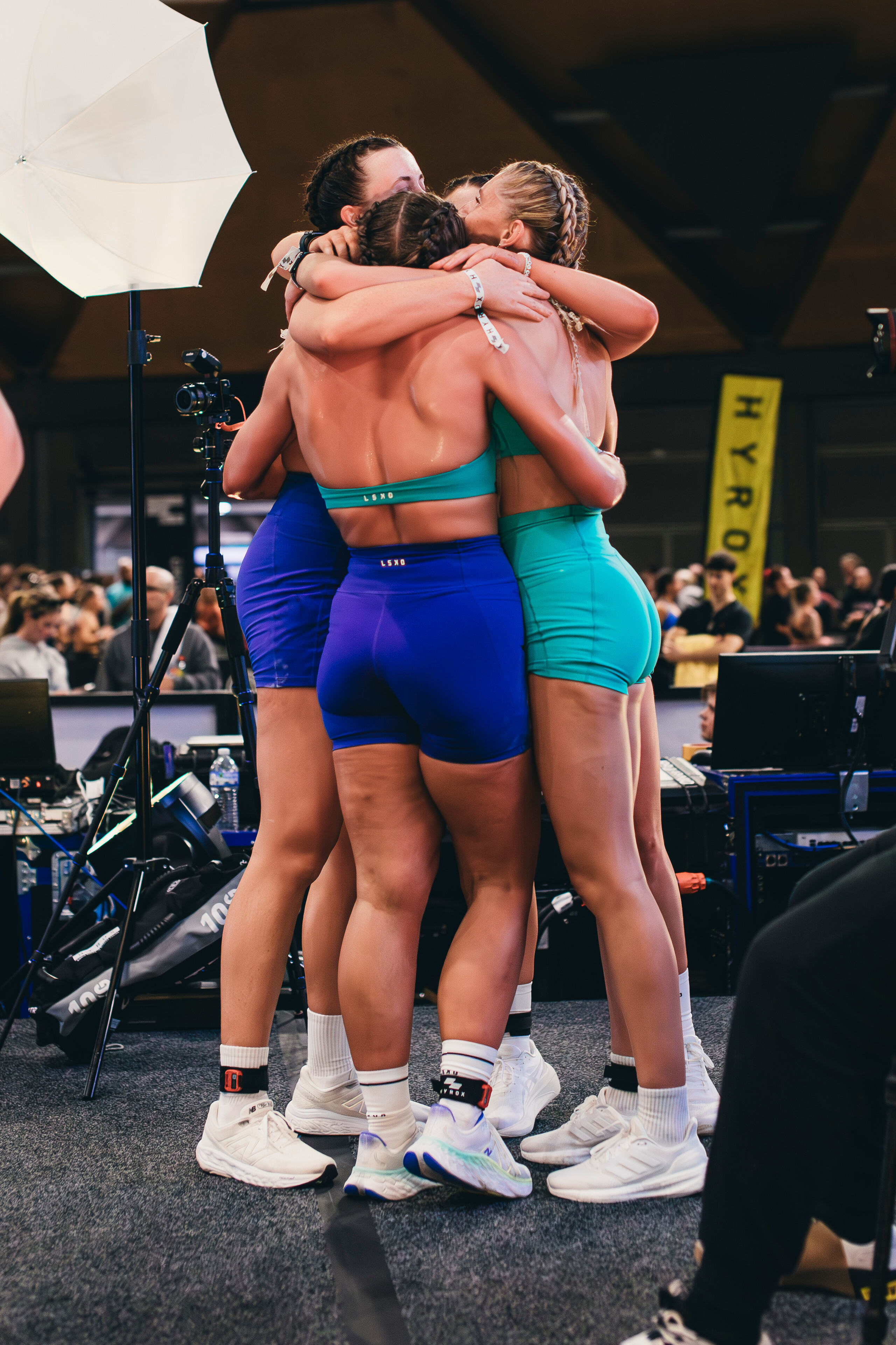 In 2024, two Hyrox Sydney participants embrace after completing the fitness challenge, wearing vibrant blue and teal athletic outfits