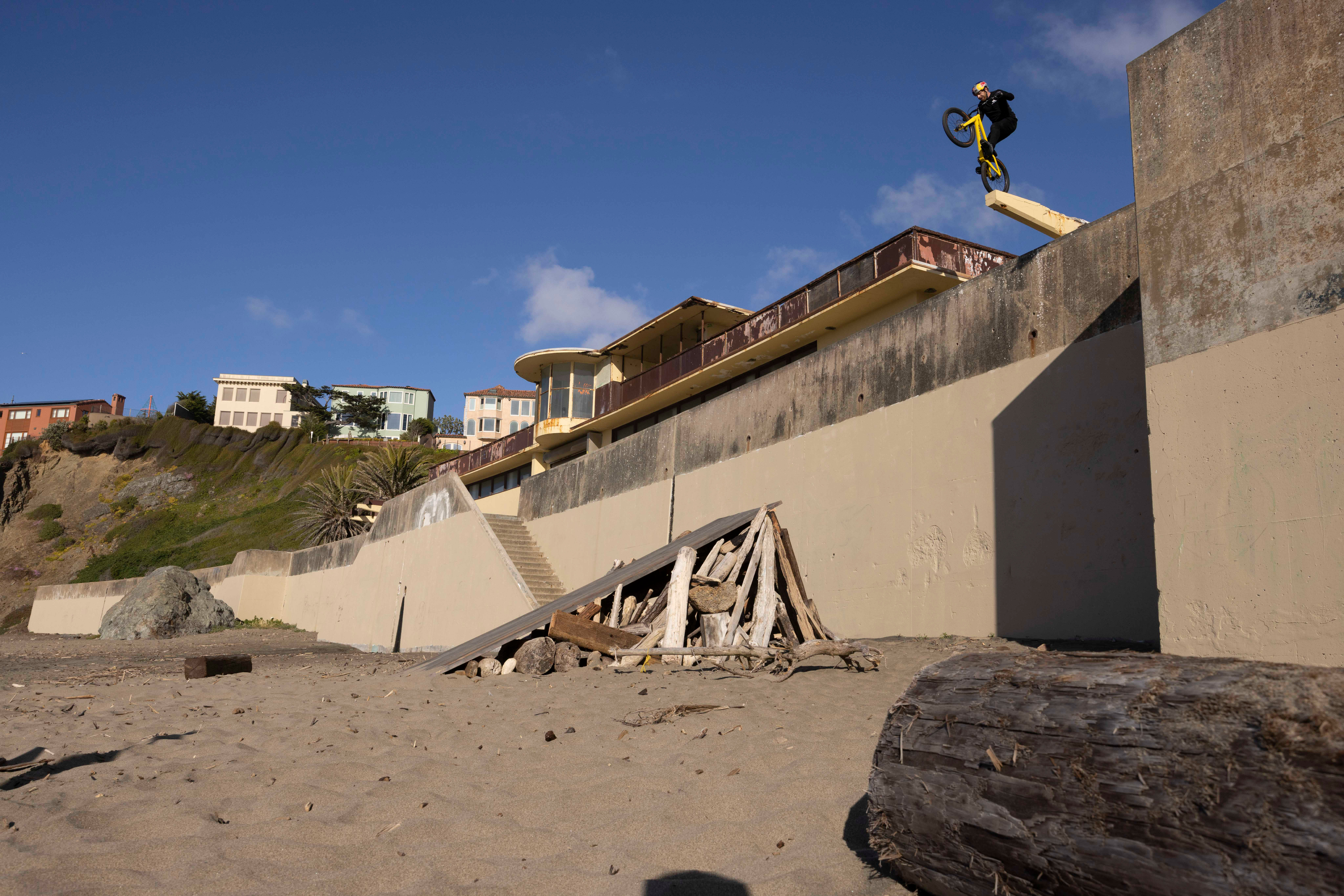 The double drop down onto China Beach was another line that had been heavily scouted and had this really cool vista back to the Golden Gate Bridge. Back in 2017, I planned to jump down onto a rock, but when we returned, some wooden structure had broken and left this sketchy, concrete ledge. Old, slightly crumbling reinforced concrete is one of my favourite things to ride in the world, so it had to be included. Originally, I had aspirations of trying to front flip off the second drop onto the beach, but in practise in winter, I realised it wasn't going to be on, so I planned to ride it straight, which ended up pretty damn scary.
