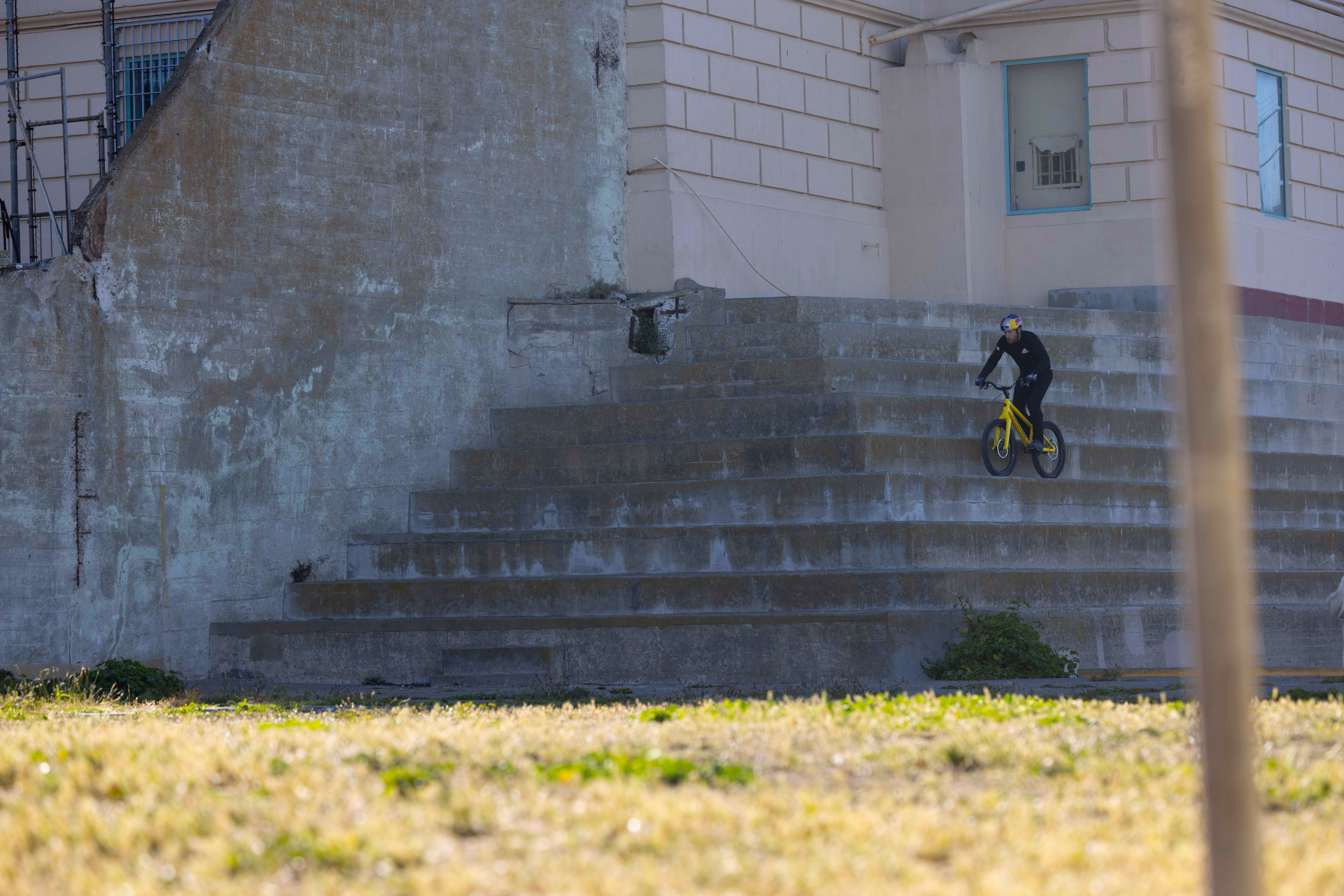 Normally, I do most things on my feet first. I don't do parkour, necessarily, but I have to be quite comfortable on my feet to then do it on the bike. I did jump down it on my feet eventually, but it was on the limit of what I was comfortable doing.
