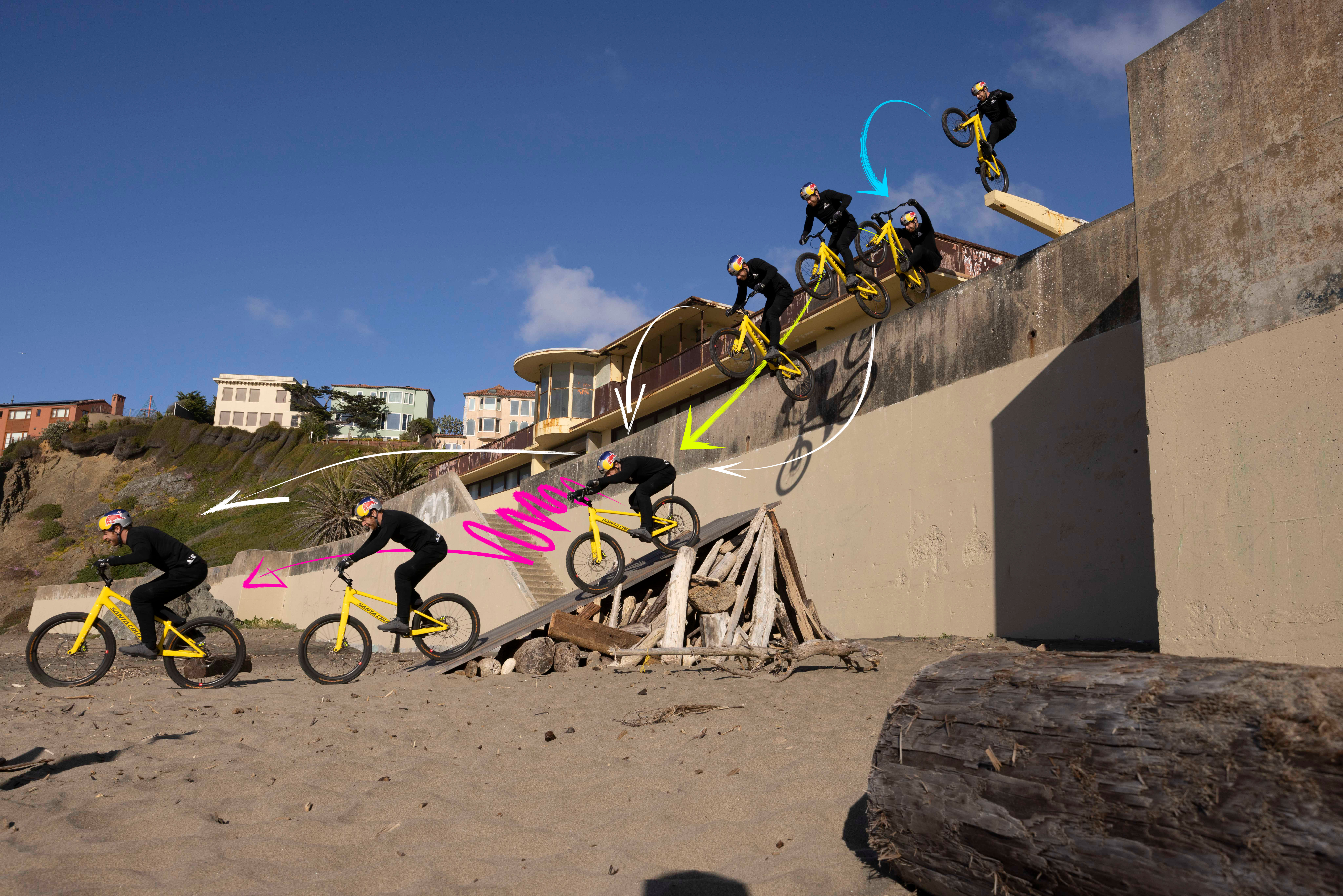 To land the Beach Drop, I had to start balancing, hop on the back wheel, and then drop about seven feet [2.1m] onto a wall that itself is only six inches [15cm] wide. If I was to fall backward, the fall was about four feet [1.2m] . If I was to fall forward, the drop to the beach was around 16 feet [4.9m], and I’d also go head-first into the landing that I’d fashioned out of a bunch of driftwood.