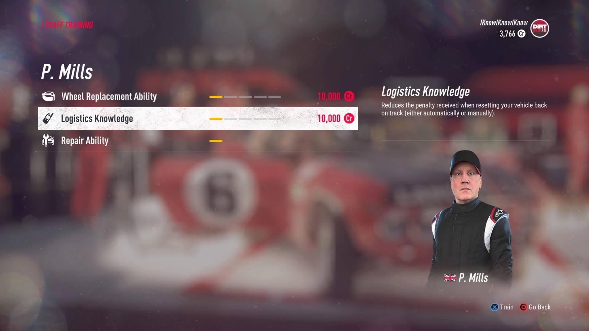 Your co-driver can upgrade his Logistics Knowledge, which reduces the penalty you receive by falling off the track. Your Chief Engineer can upgrade his Research Knowledge, which will result in quicker engine upgrades. And upgrading your Engineers' Chassis Repair Ability can help you get a full fix before the next race.
