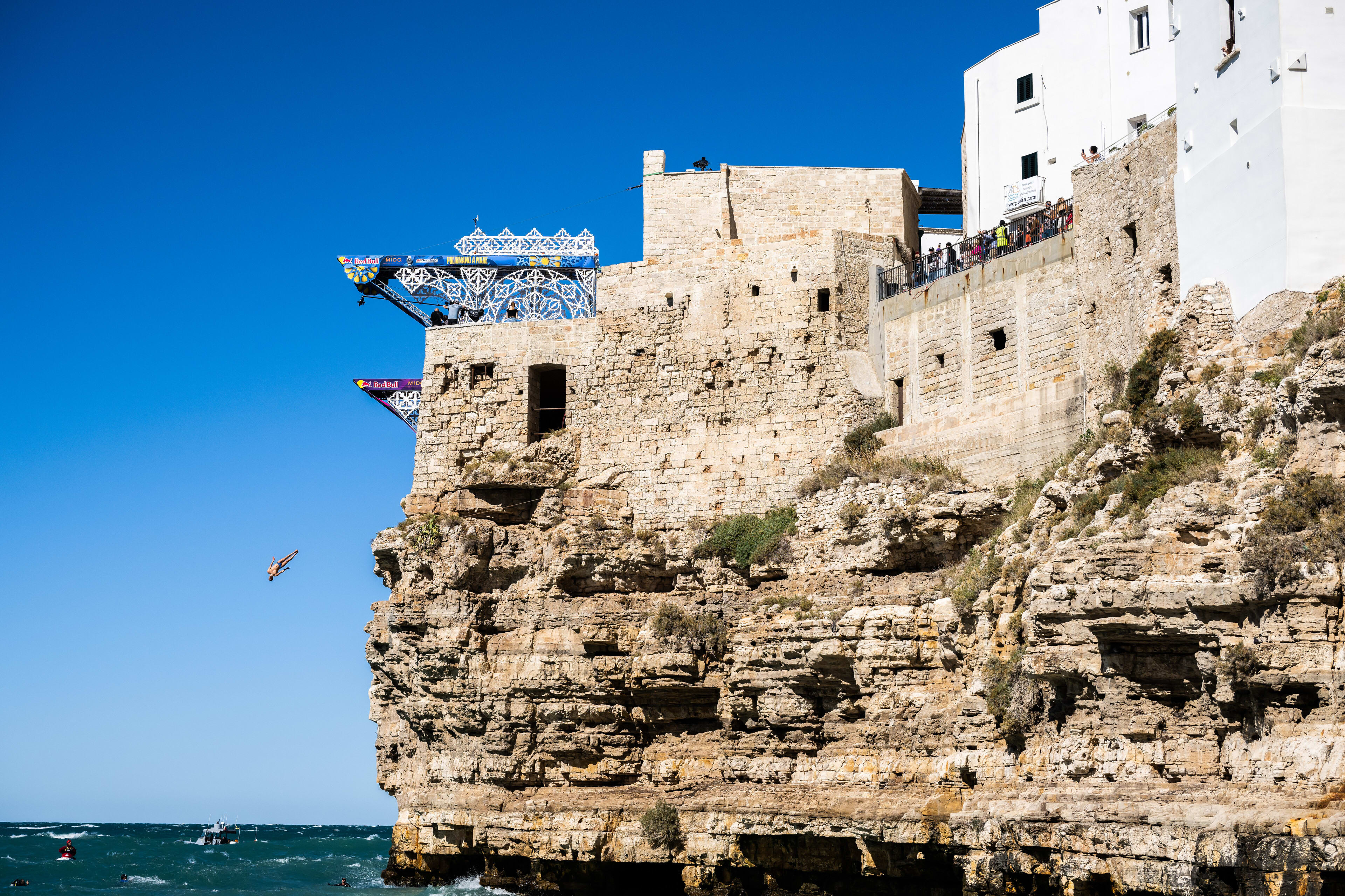 For most of the year, the picturesque Puglia town of Polignano a Mare – famous for its incredible scenic coastline and crystal clear waters – has a super chilled, cosy vibe. But once a year, the Red Bull Cliff Diving World Series rolls into town, a weekend-long adrenaline rush of awe-inspiring aerial action above the cliffs of this stunning location.