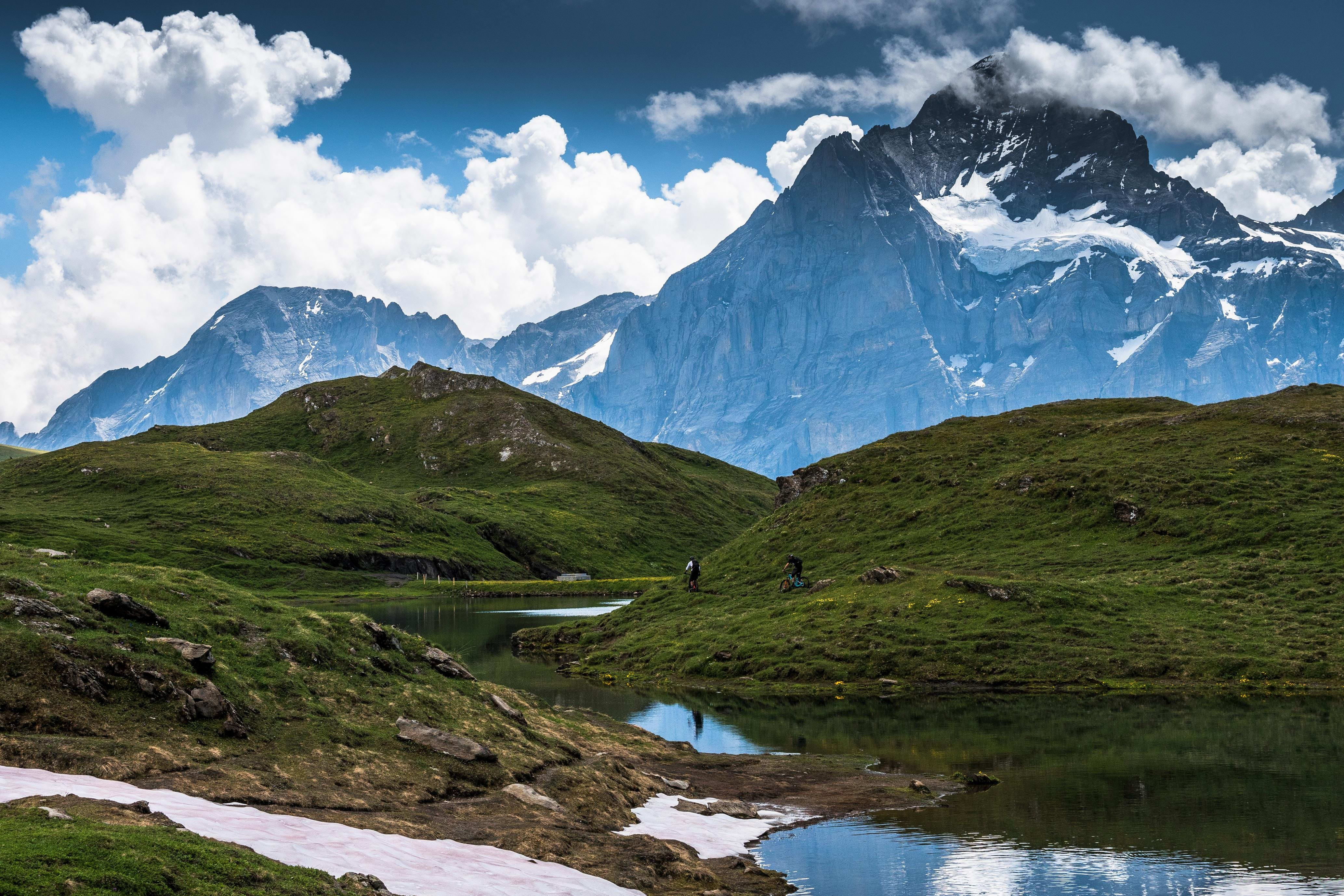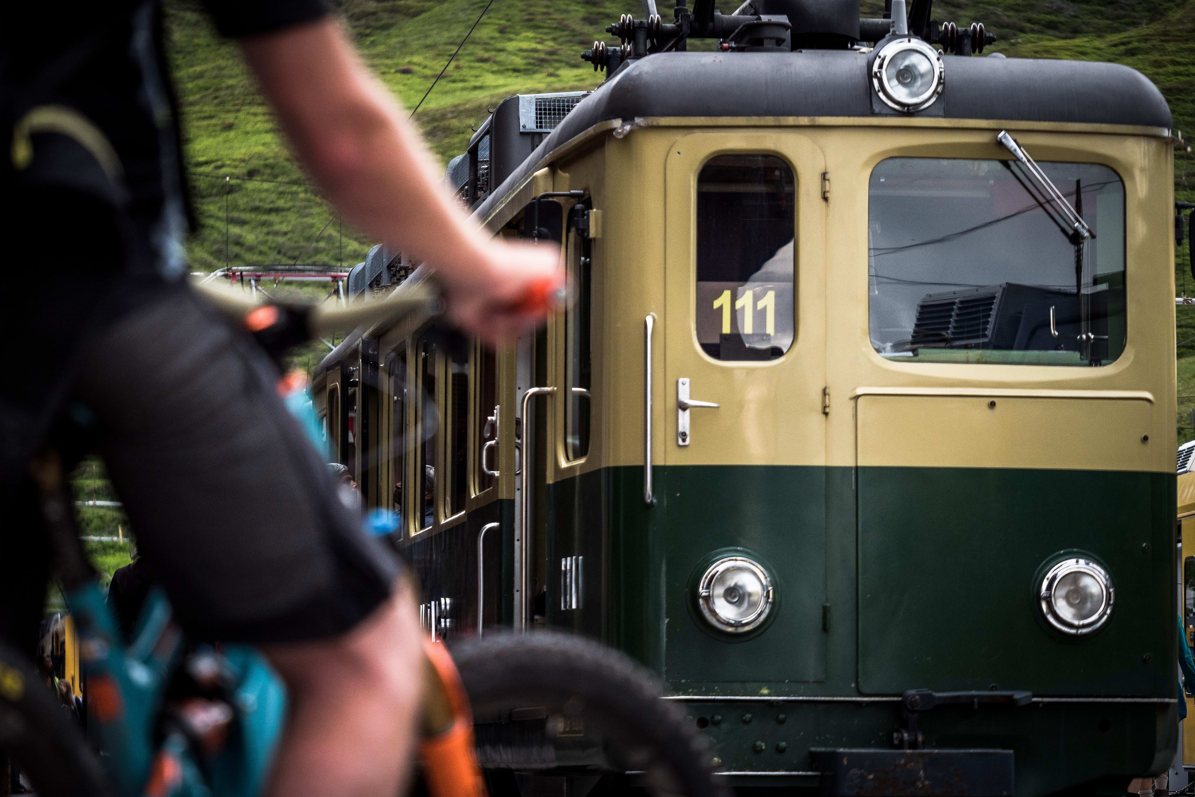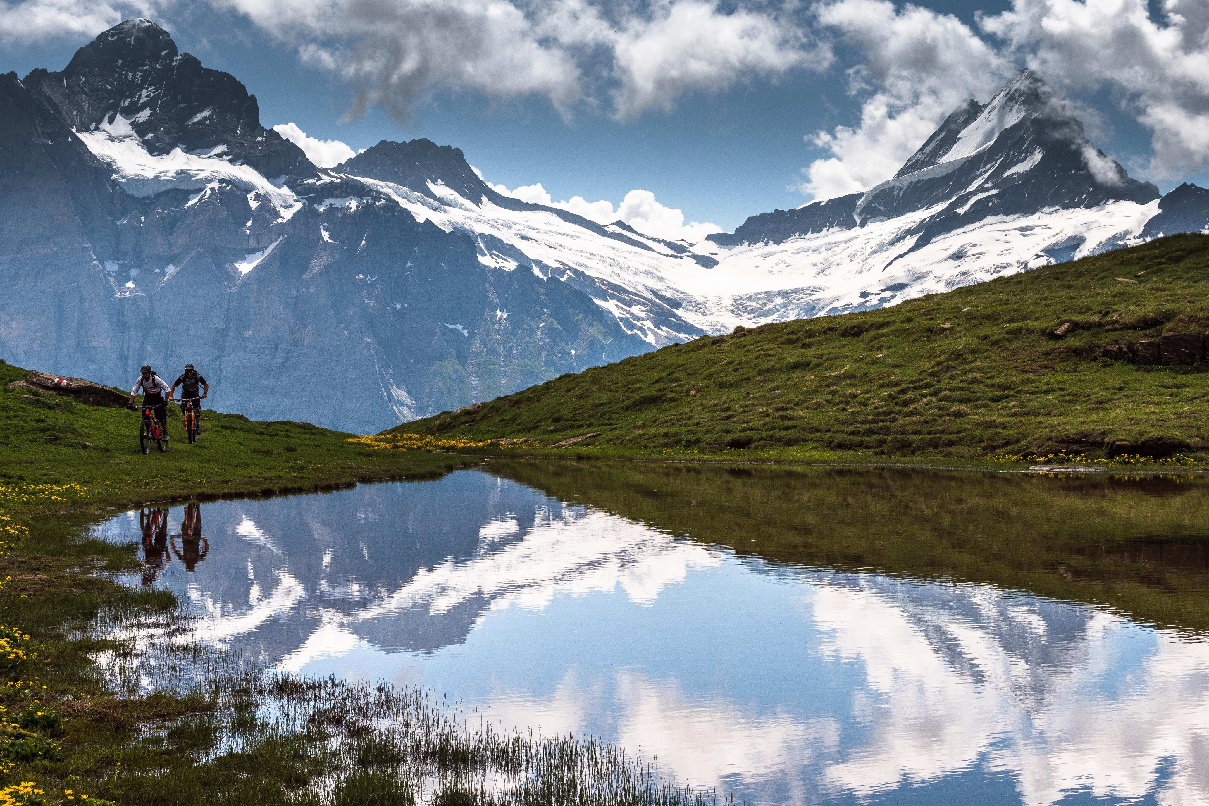 A good warm-up is the Bachalpsee loop (signed trail number one), reached by a 1,000m road climb or taking the bus from Grindelwald to the Grosse Scheidegg pass (bus runs hourly May to October, 32CHF/€27 including bike, max six bikes per bus so a reservation is recommended, free bike transport on last bus of the day).
