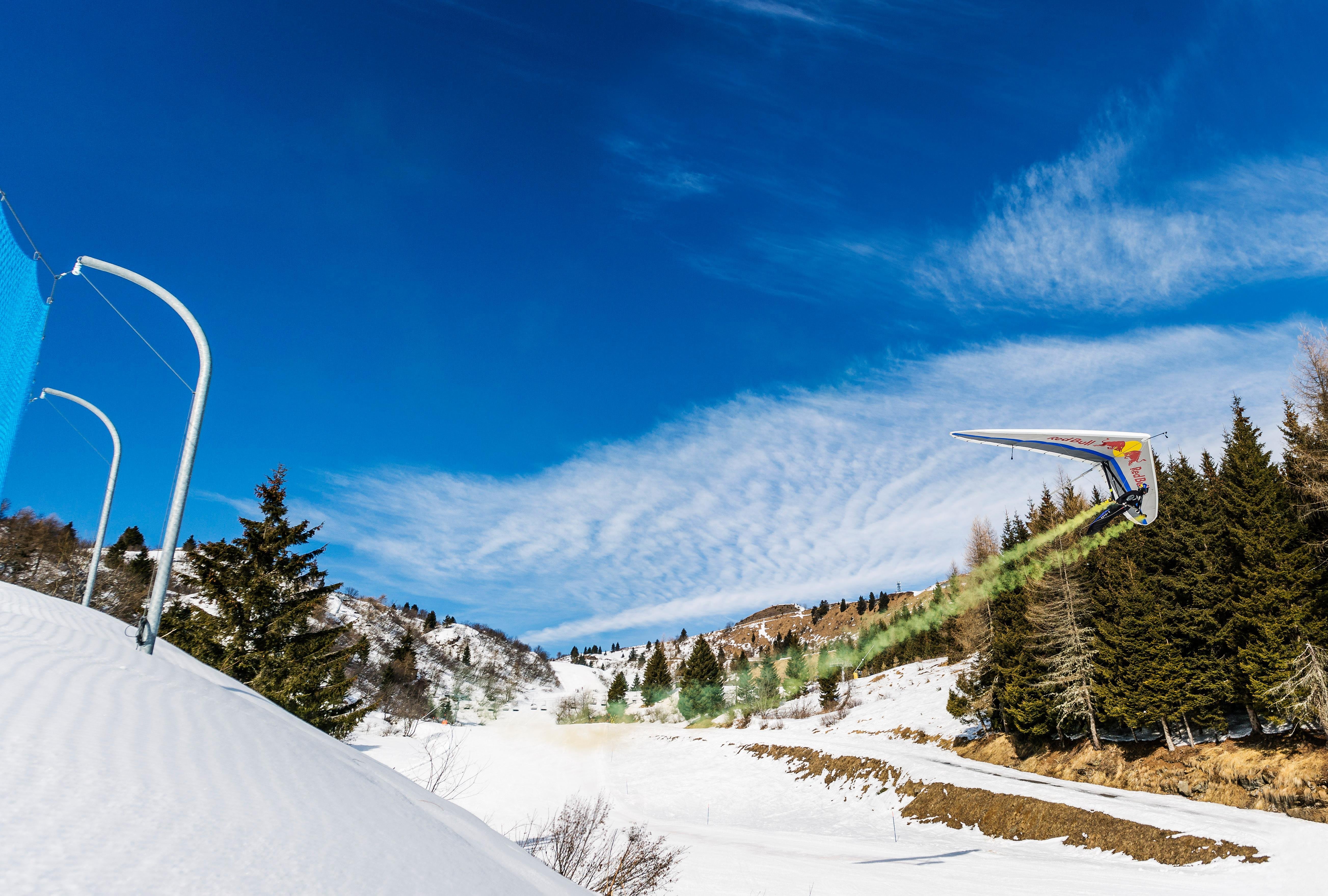Arriving at the Italian resort of Zoncolan, the trio swopped their skis for hang gliders and carved down the ski slope, reaching speeds of 100kph and a mere one metre from the ground.