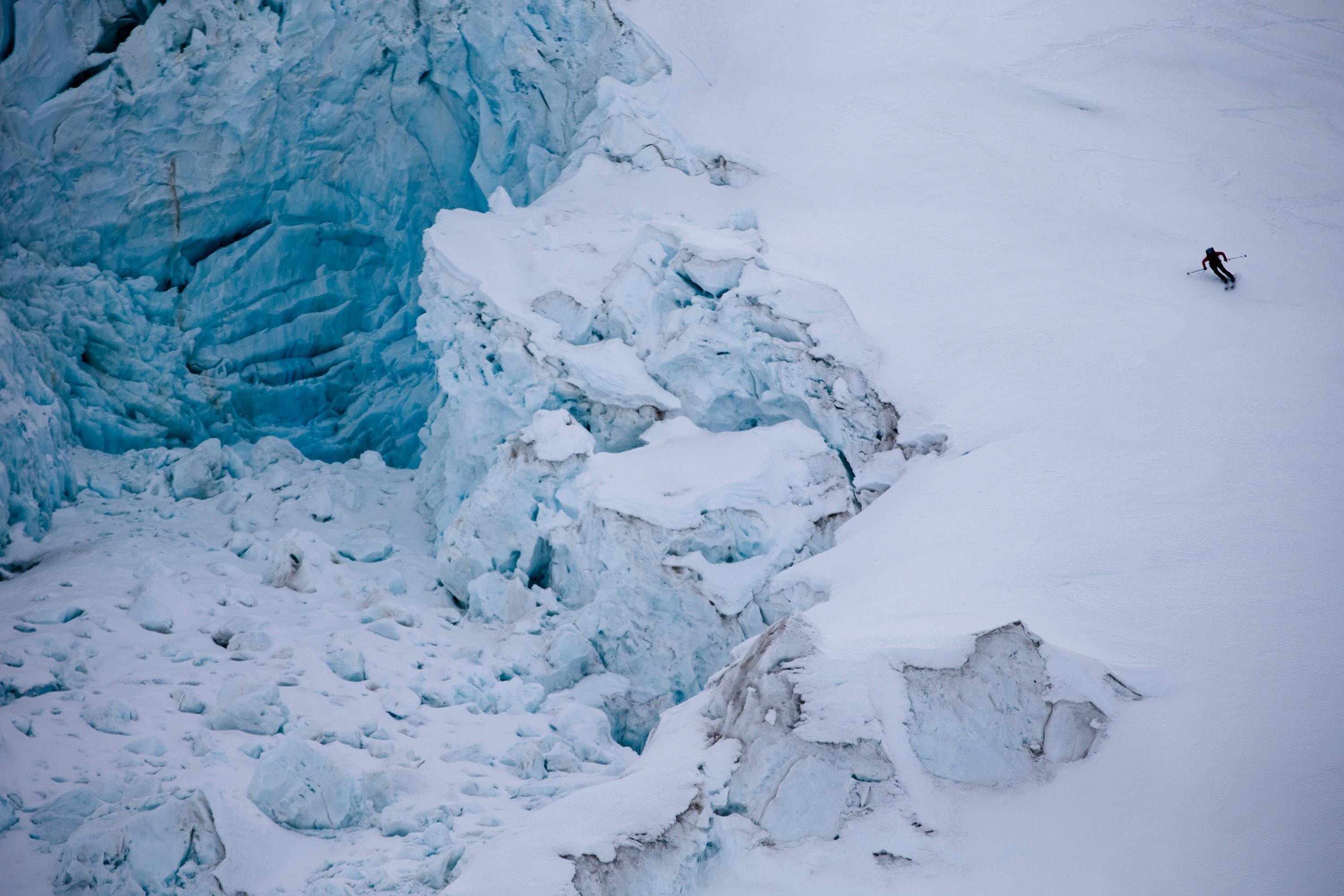 Sheldon Kerr skis past a glacier above the Barnard Glacier, Wrangell St Elias Mountains, Alaska. "Our original goal during this expedition was to attempt a first female ski descent of University Peak, although as we flew around it, only rocks and ice were to be seen thanks to the lowest snow year in 20 years," says Krystle.
