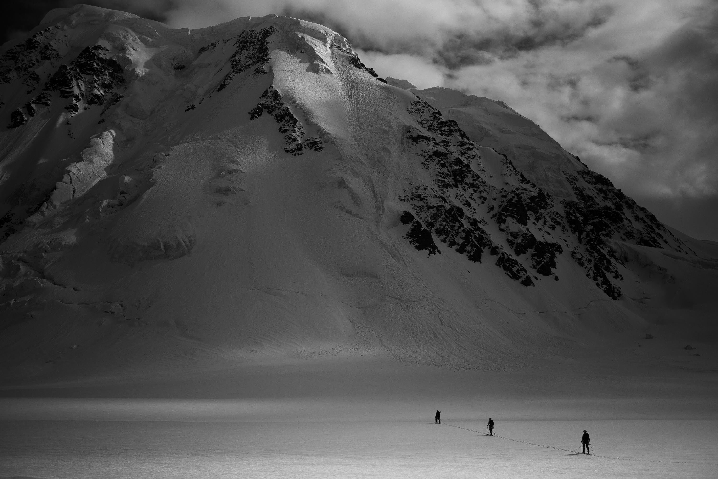 Sheldon Kerr, Lindsay Mann and Erin Smart head out over the Barnard Glacier to explore new terrain in the Wrangell St Elias Mountains, Alaska.