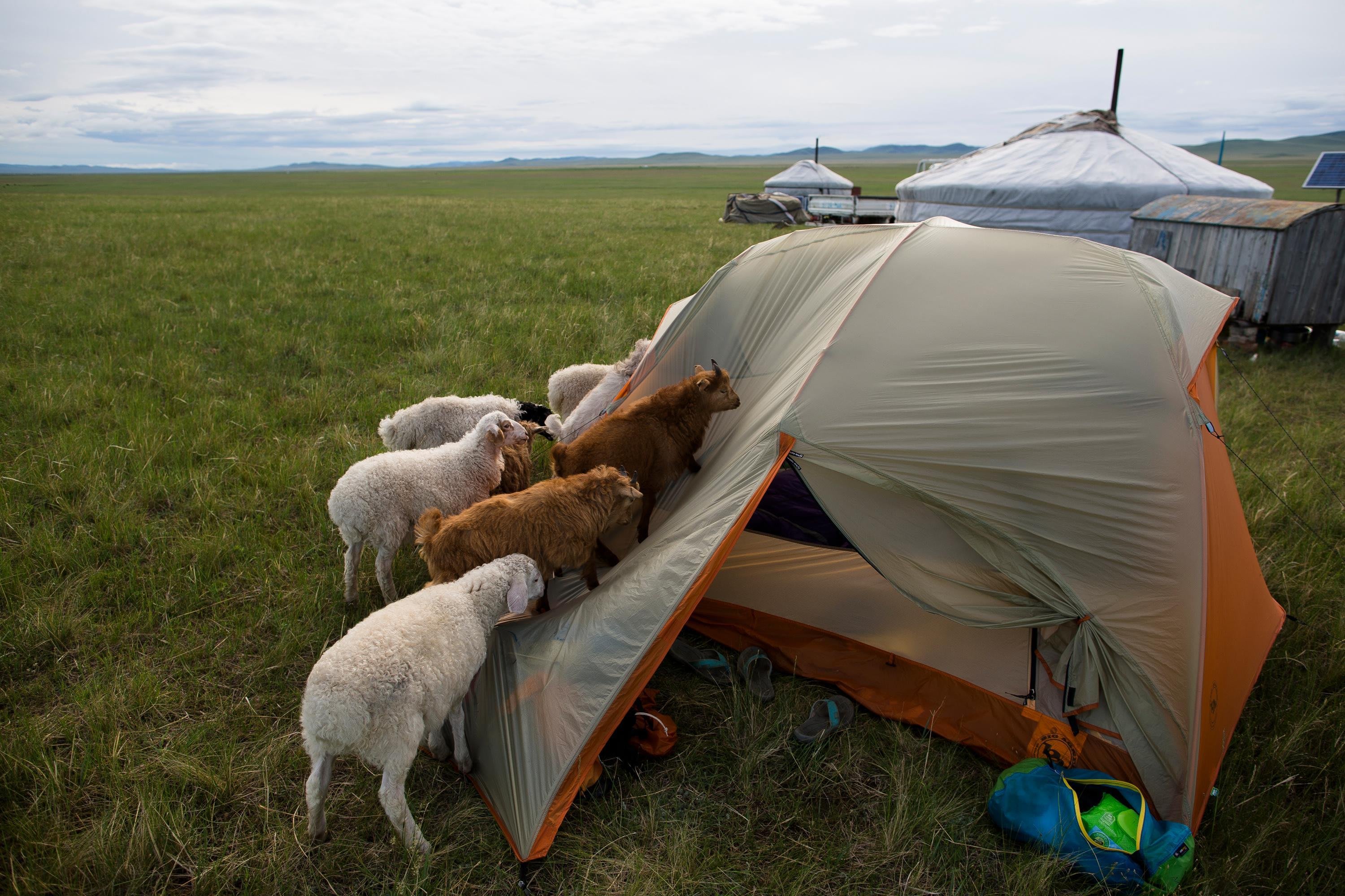 Whilst camping outside a Ger on The Steppe in Mongolia, a herd of baby goat and sheep test out a tent in new ways.