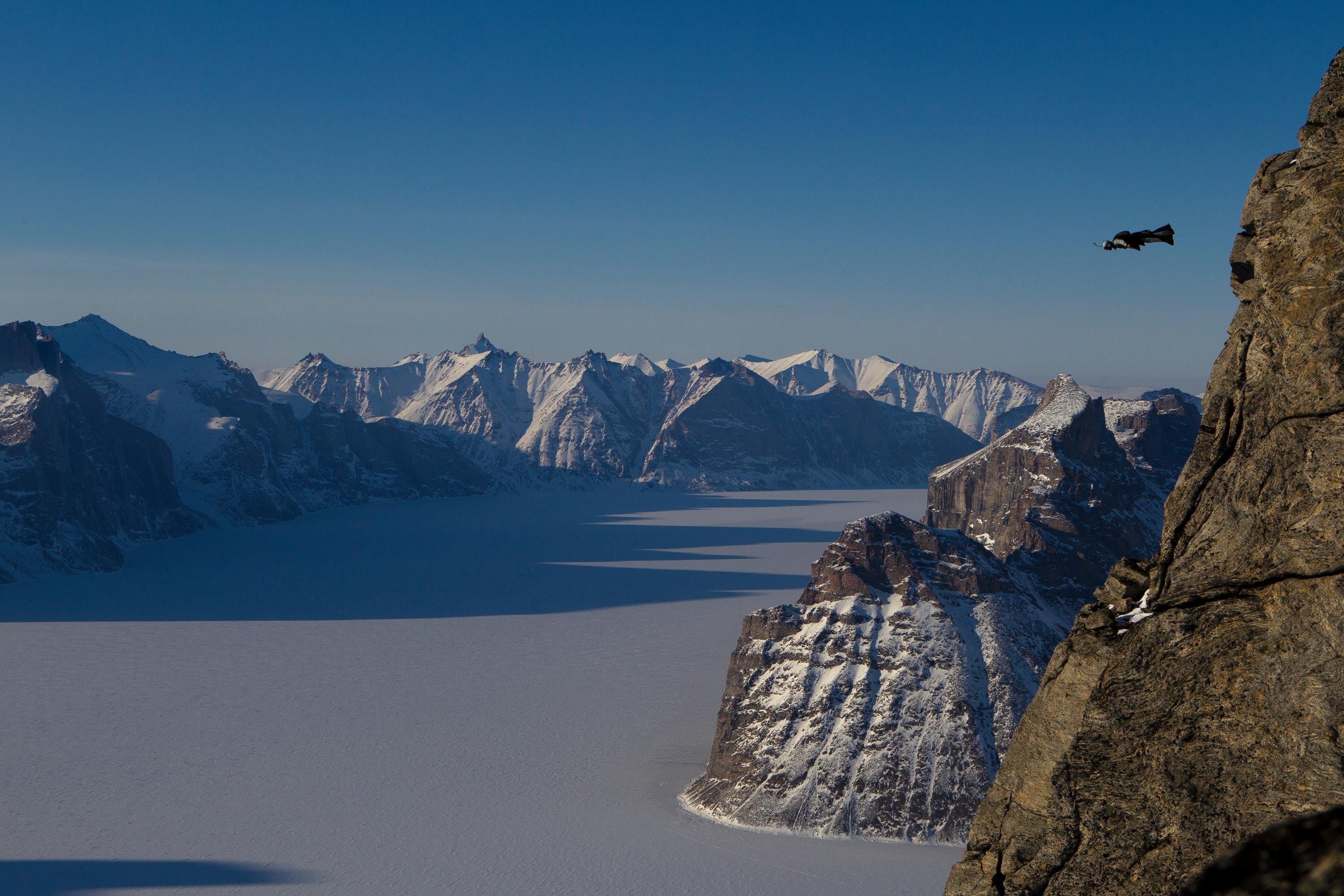 Jim Mitchell leaps from Ottawa Peak (1,500m) overlooking Sam Ford Fjord on Baffin Island.