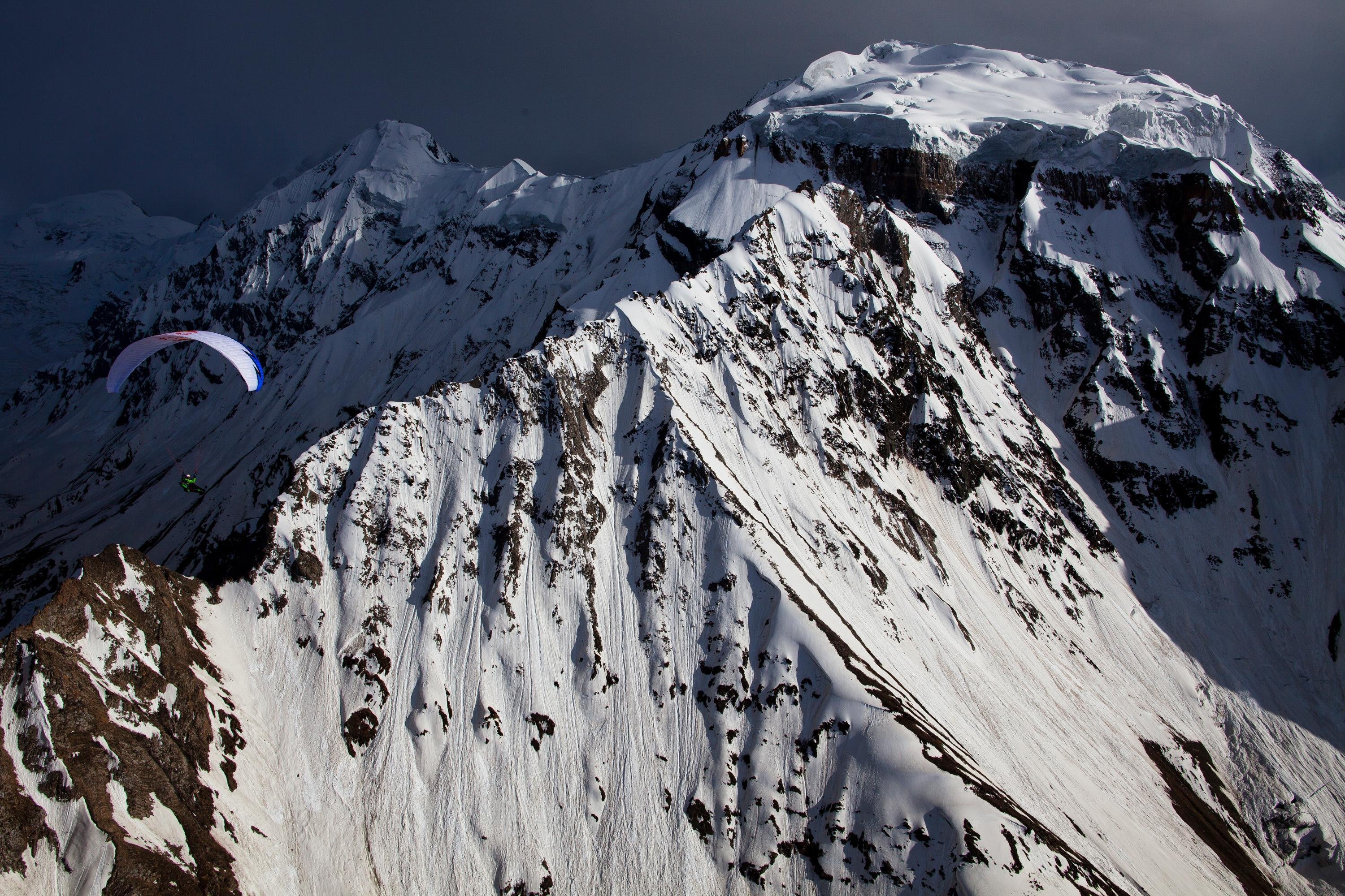 Horacio Llorens flies high above Rakapohsi (7,788m) in the Hunza Valley in northern Pakistan.