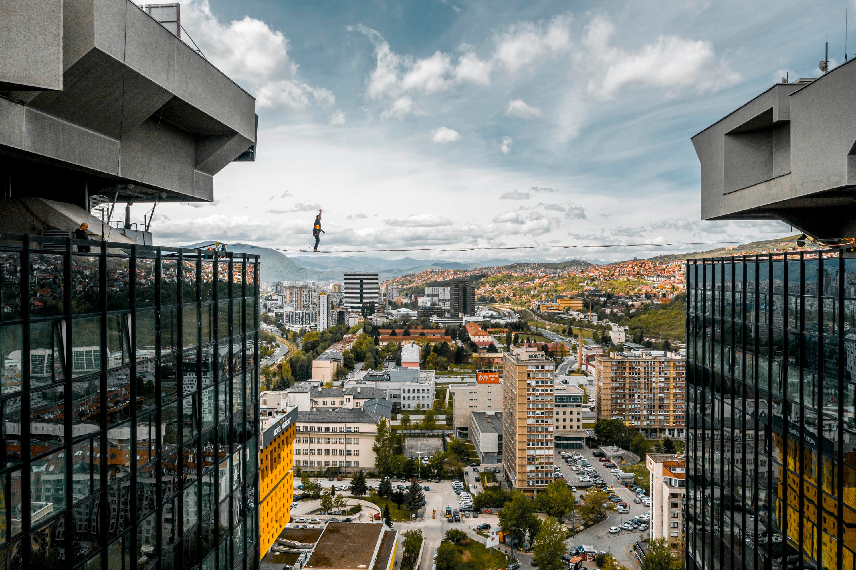 The project – somersaults between Sarajevo's Unitic skyscrapers at sunset.