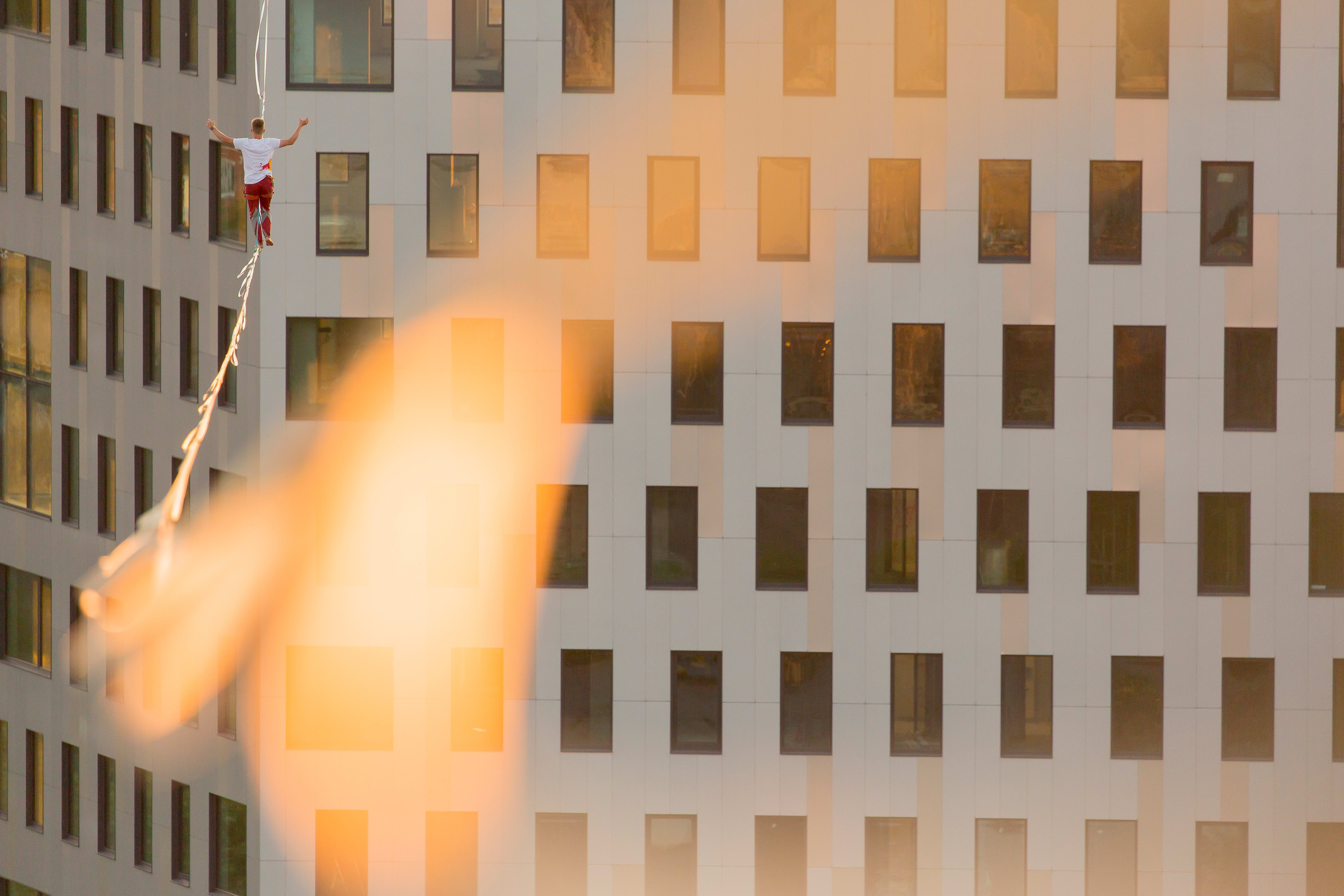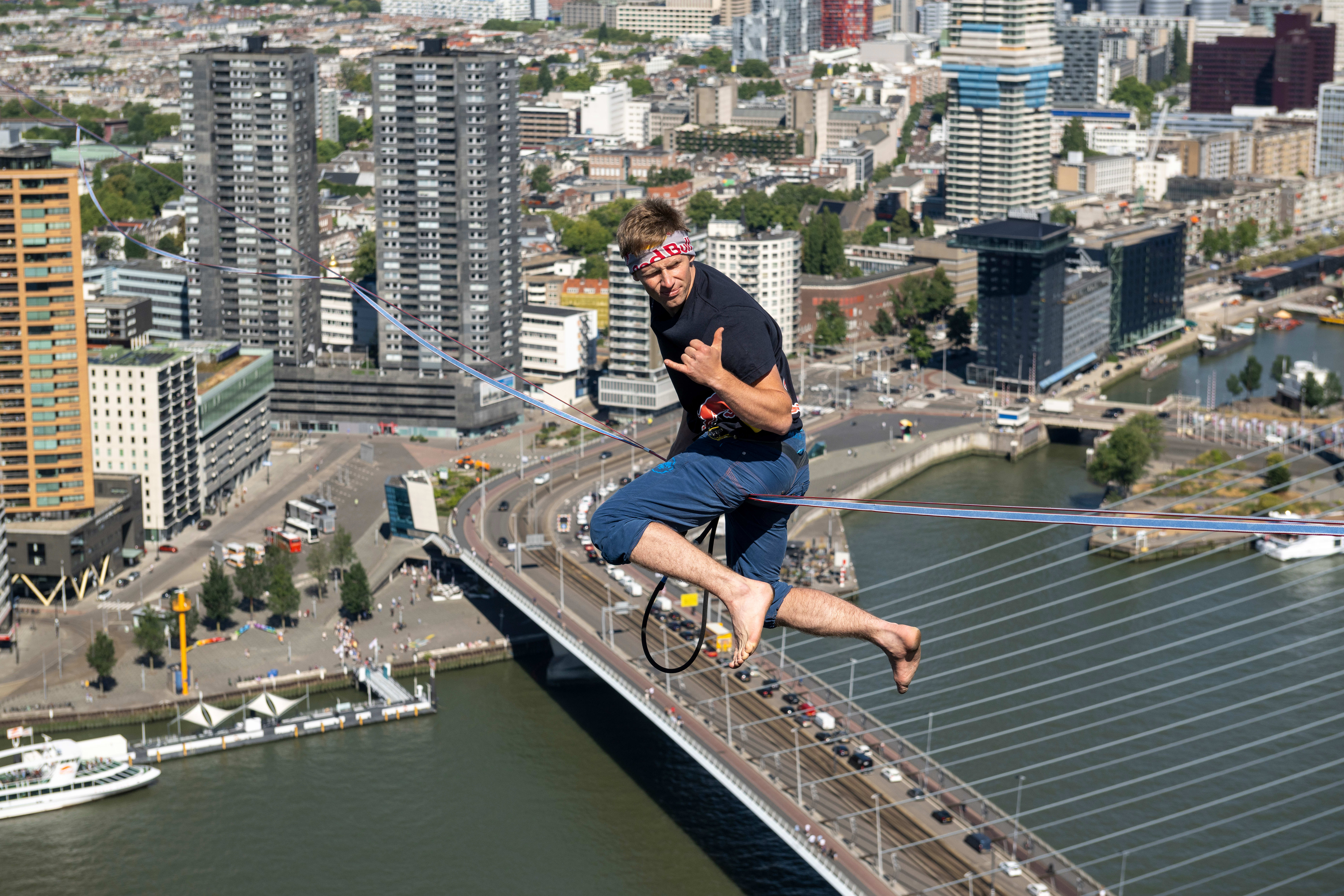 In City Highline in Rotterdam, Roose attempted one of his longest line walking attempts, a crossing over the city's River Mass by going from one building to another. The line he'd been walking over was extremely narrow, and at some points, Roose had to tackle the line going upwards with a steep gradient.