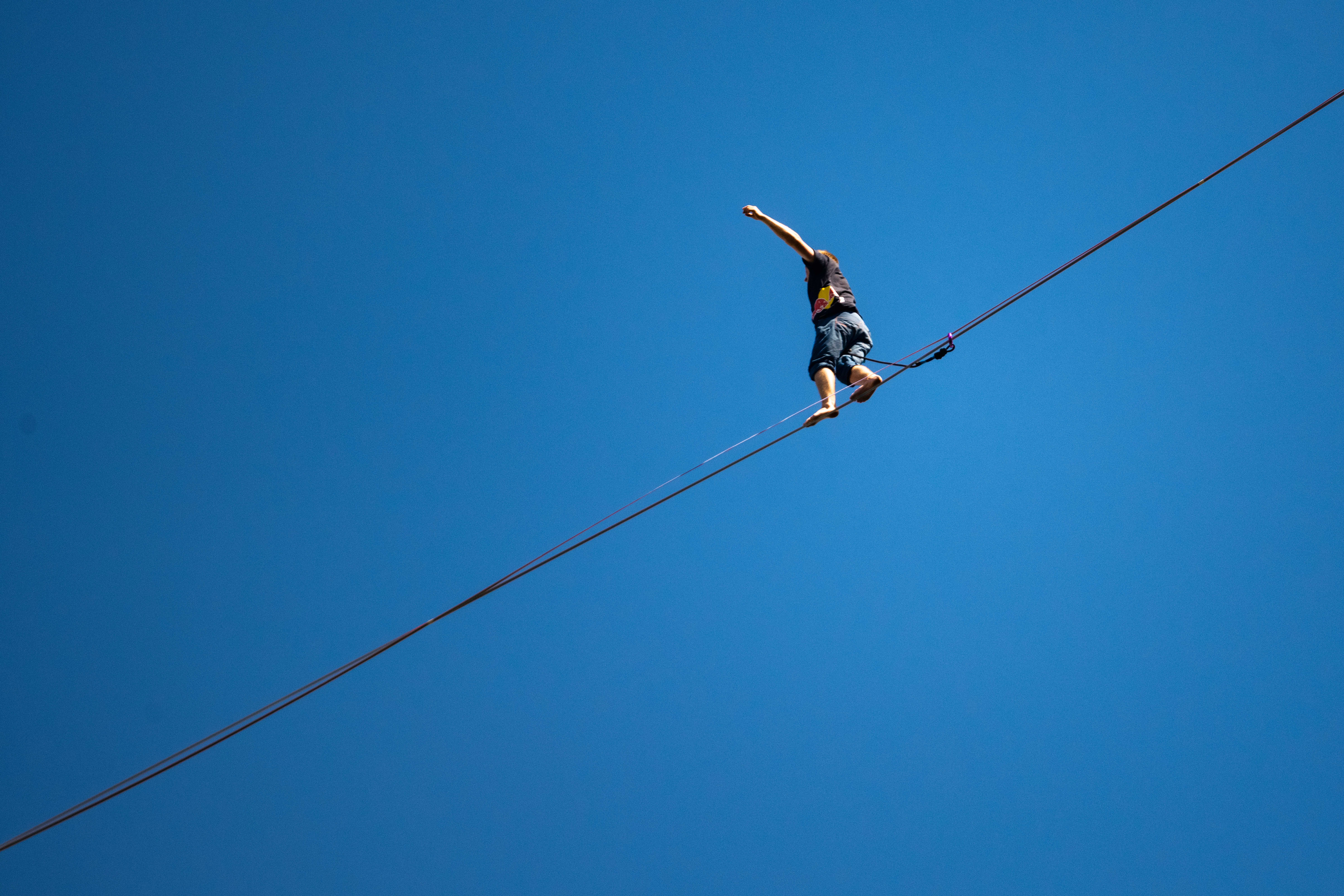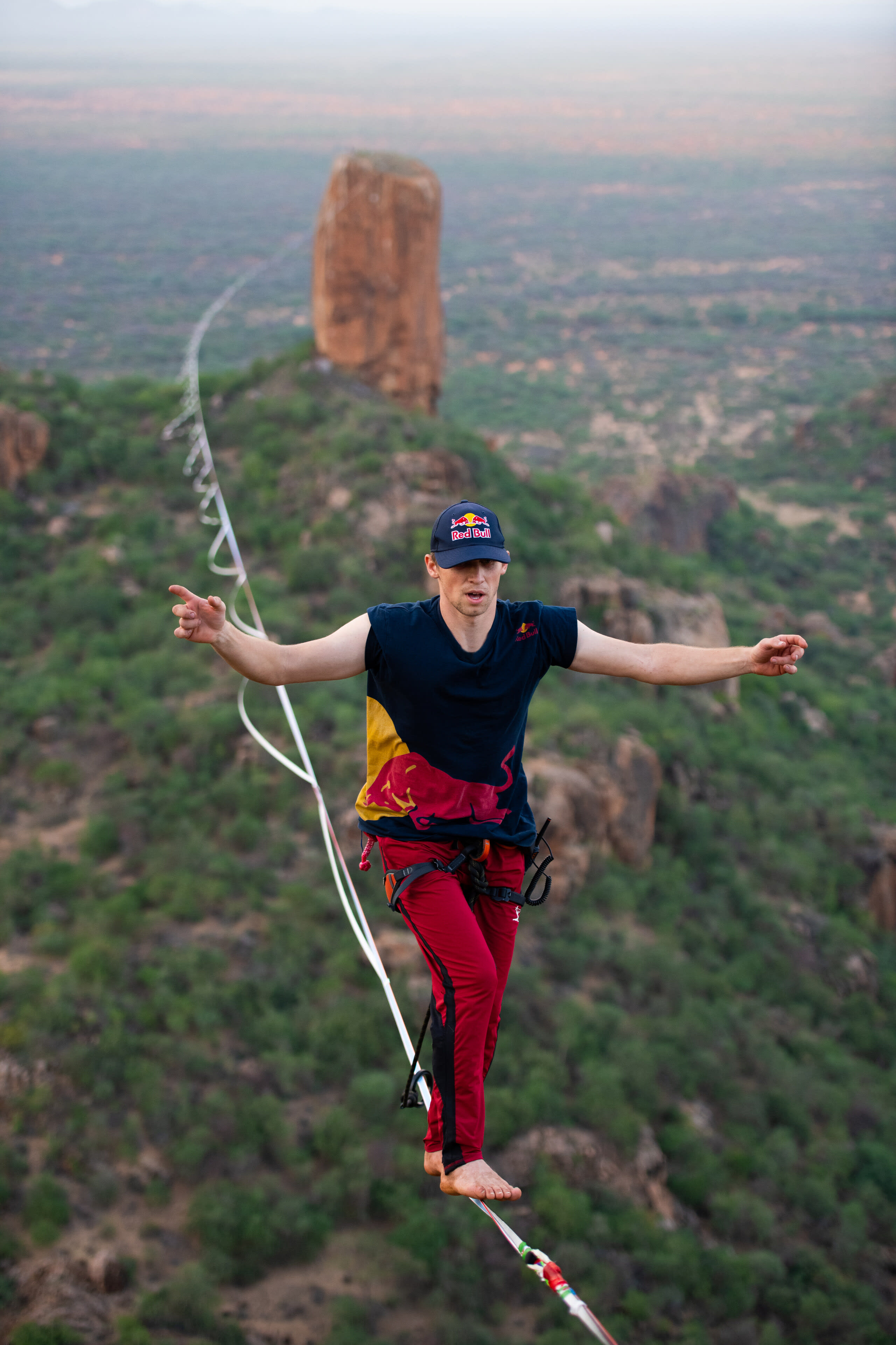 "The difference in height was about 35 metres, which is very steep considering the sinking of the line. I had to experiment and practise walking the slackline at a very sharp angle at home."