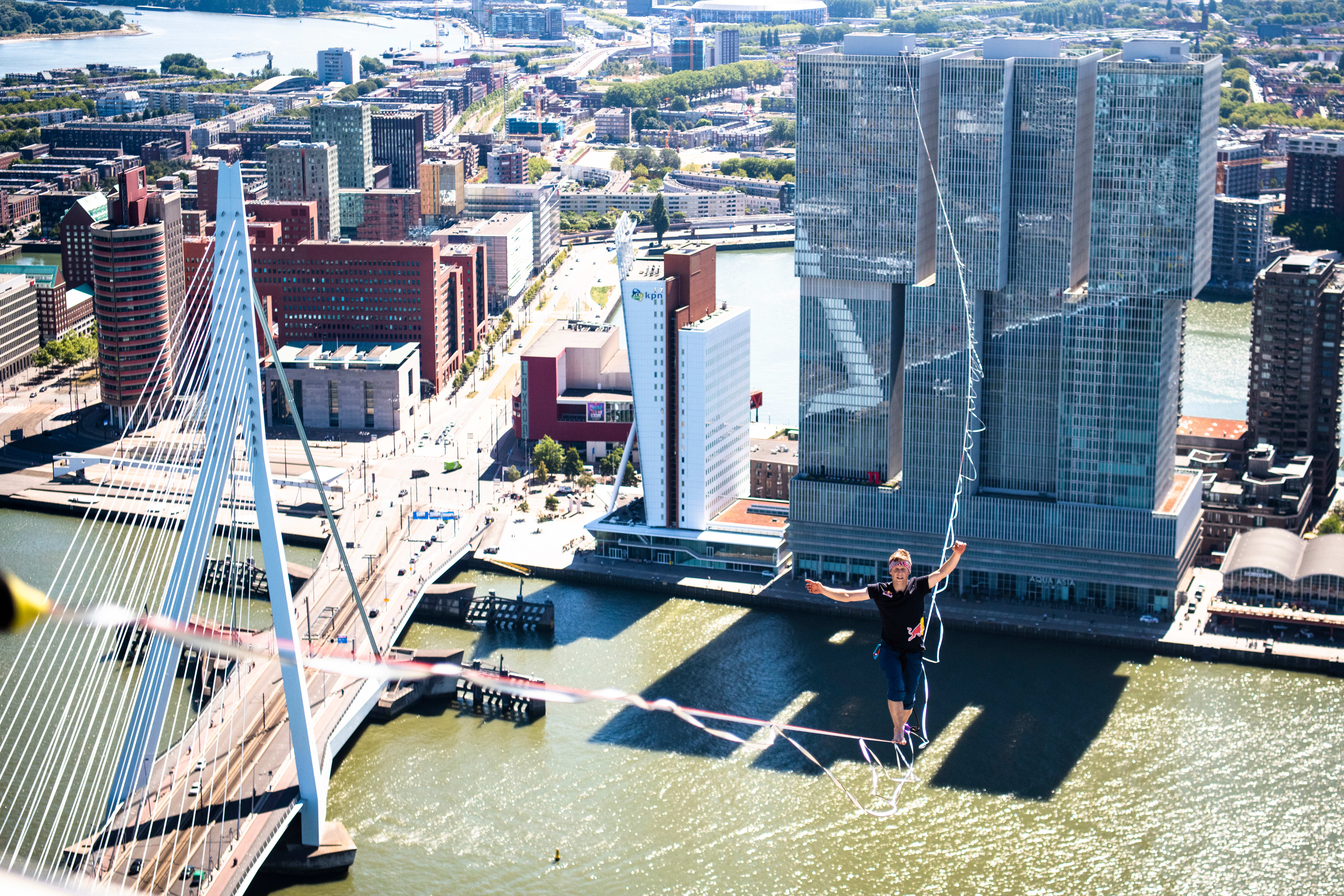 Watch as Jaan Roose attempts to cross over Rotterdam’s River Mass by going from one building to another.