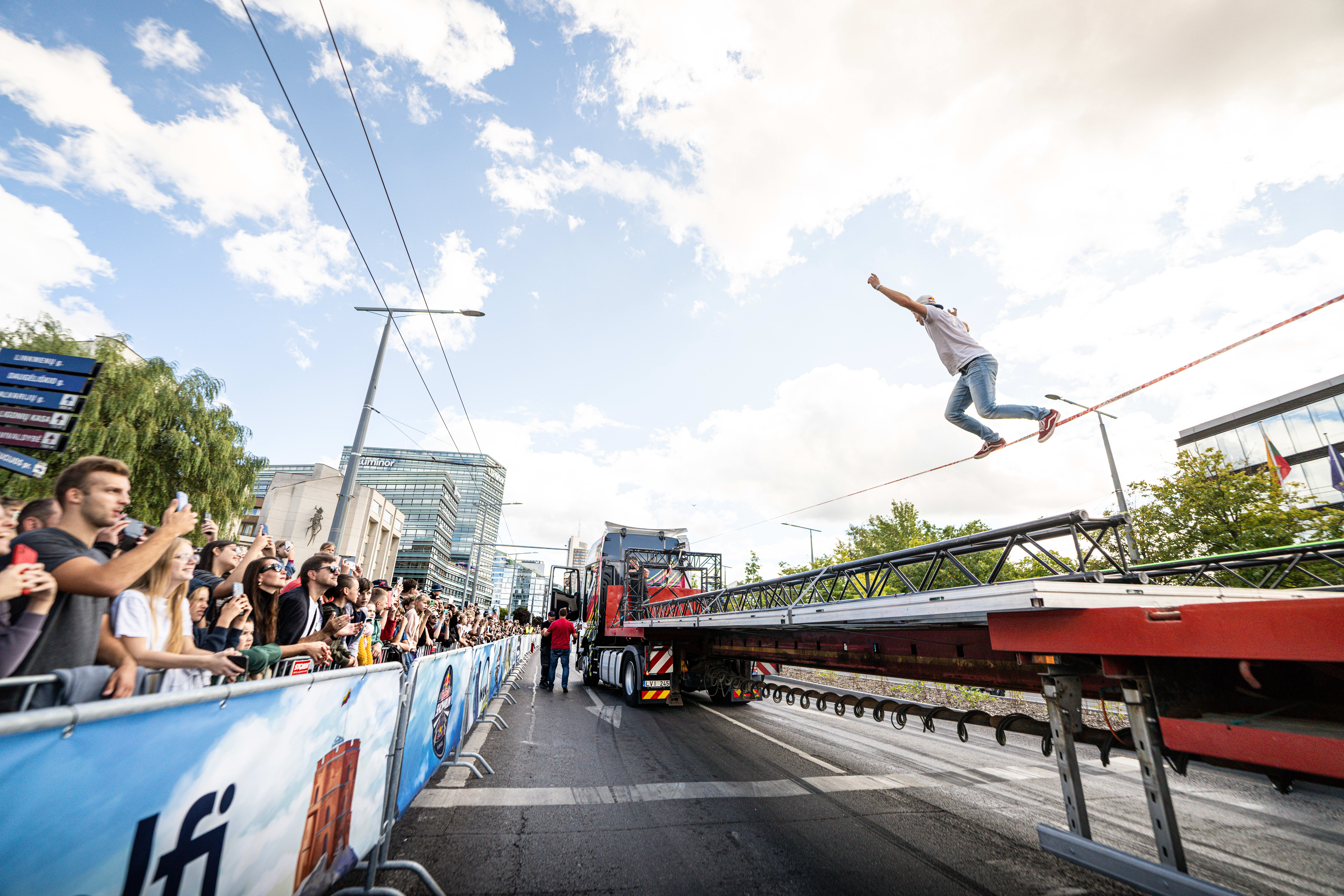 "We found a trailer that was longer than usual size. We somehow found a way to install the slackline on it, but we were unsure if would all work while moving. There was little time. At night, the streets for Showrun were closed and we did some test attempts. During the actual performance, the truck and its trailer moved in one direction and back for 800 metres, and I didn't lose my balance."