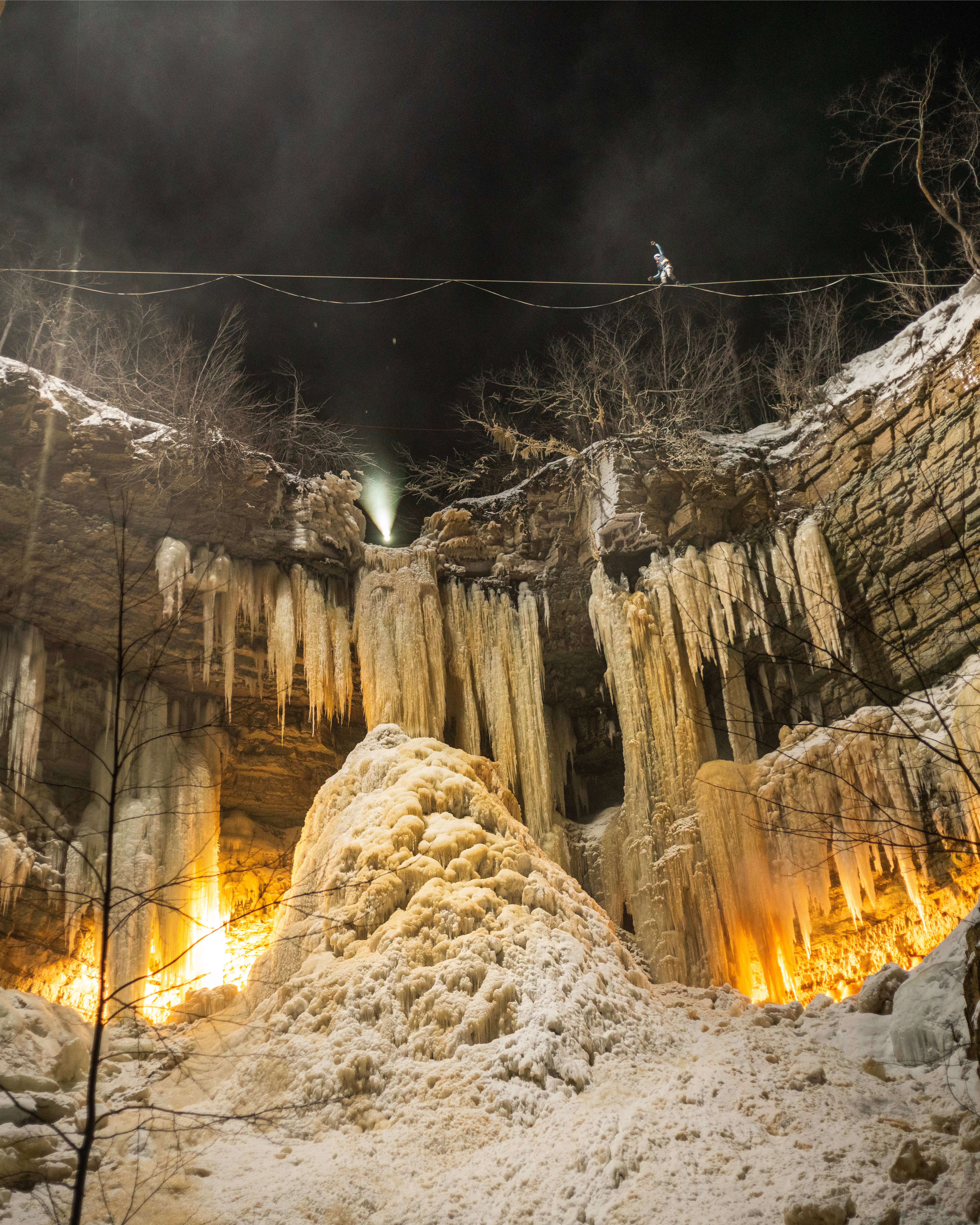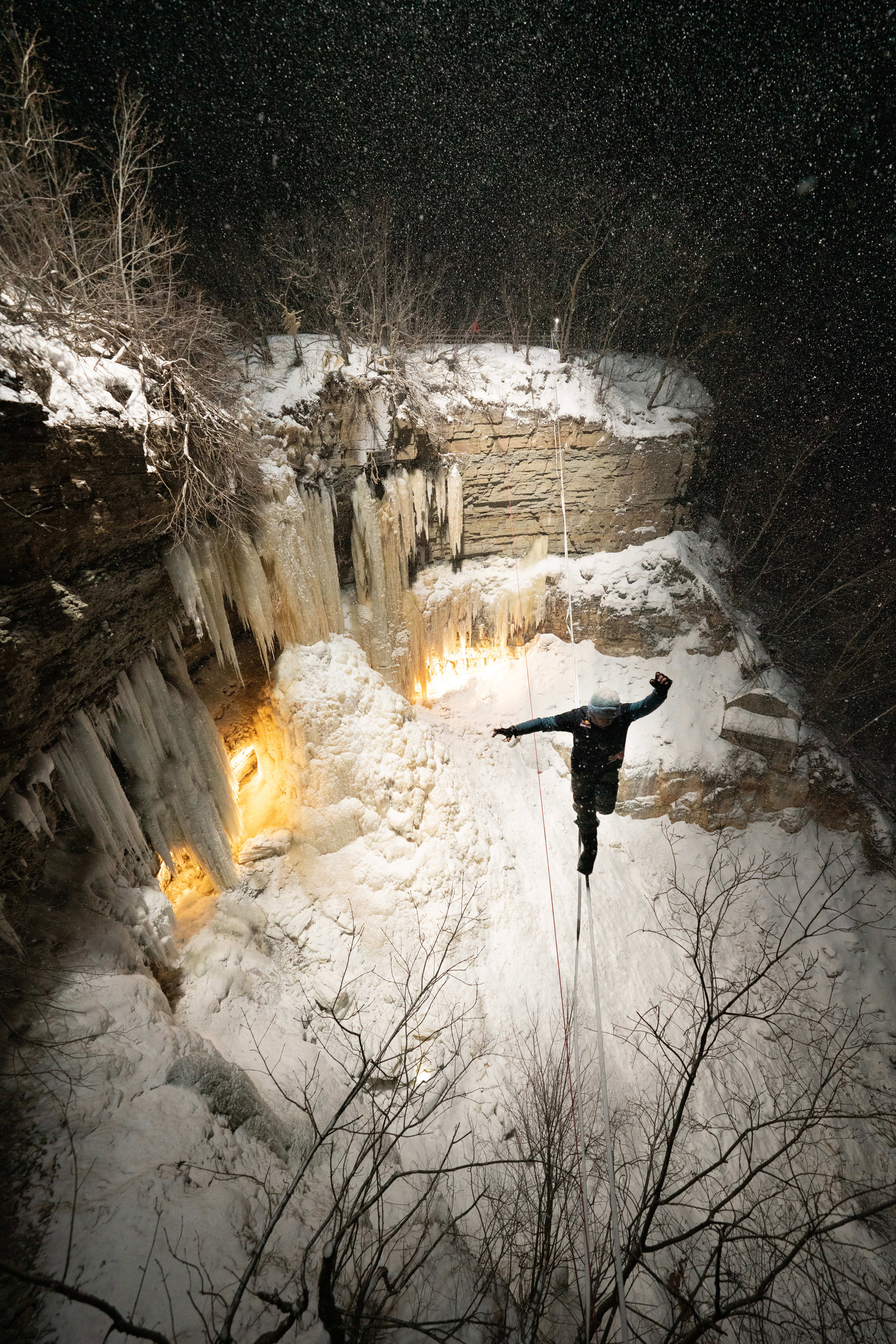 Roose and his team rigged a highline across the Valaste waterfall before sliding, in his socks, across the frozen falls. The feat is the latest in Roose’s series of record-breaking slackline achievements.