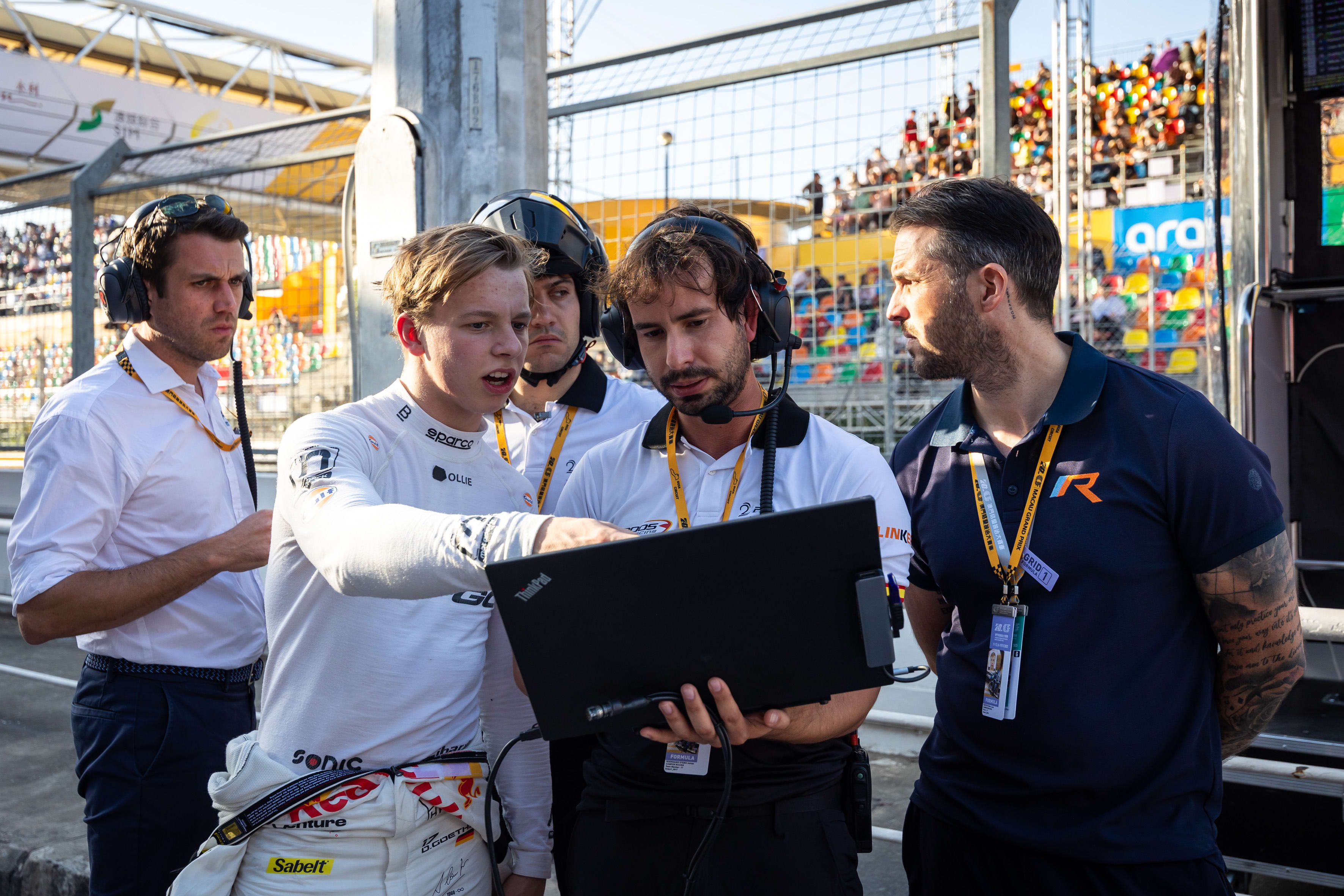 Oliver Goethe talking to his race engineer at the Macau GP 2023