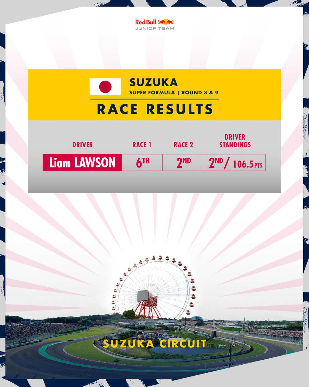 A very impressive rookie season in Super Formula by Red Bull Junior Liam Lawson concluded at Suzuka with pole for Sunday's final race. After 31 tough laps, he took second place and that gave the 21-year-old New Zealander 2nd in the prestigious championship.