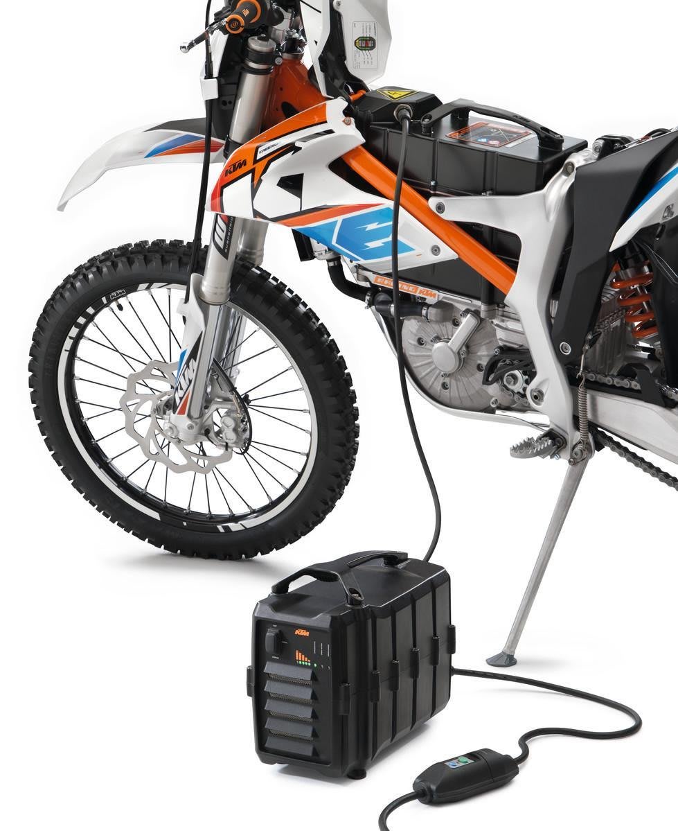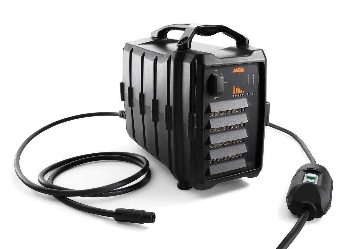 - The external charger can be connected to any regular 230V socket fused at 10A or 13A and is connected to the KTM PowerPack by flipping up the seat.
