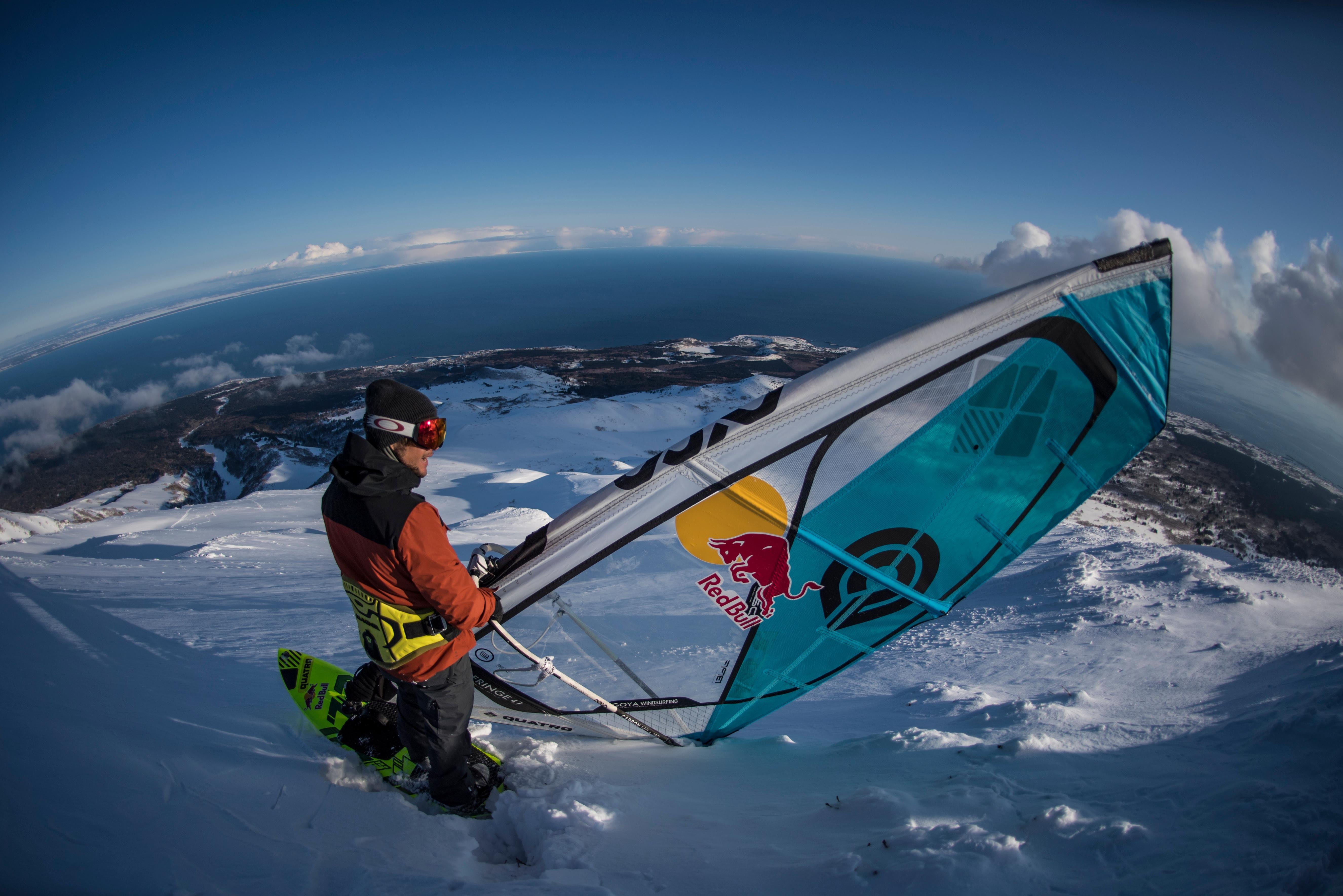 As you probably know, windsurfing is exactly what it sounds like. It's a sport in which the surfer rides a board equipped with a sail and uses the force (lift) of the wind to move over the water. Why would anyone do this on a snow-covered mountain? Of course, this was to be the first attempt in the world.