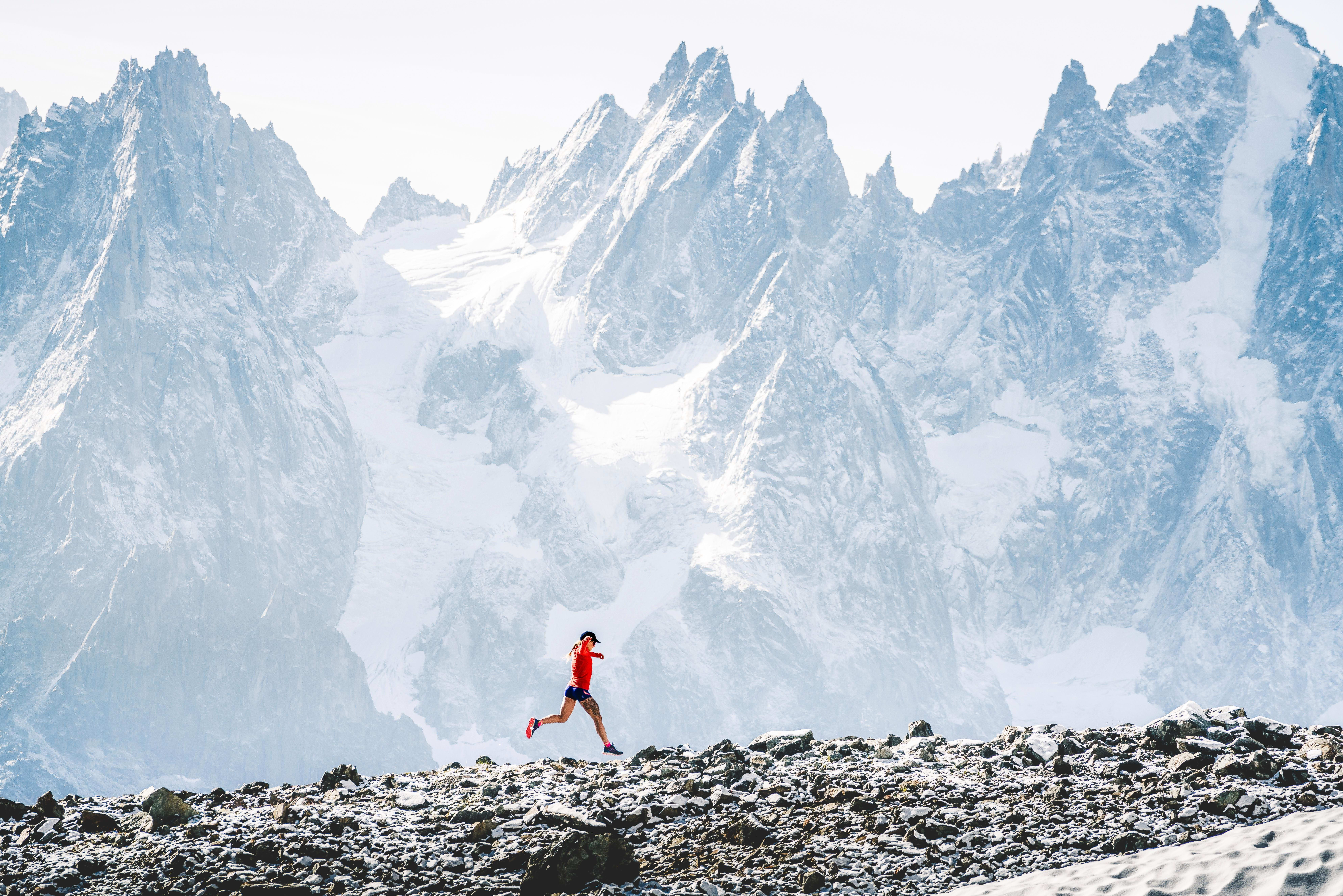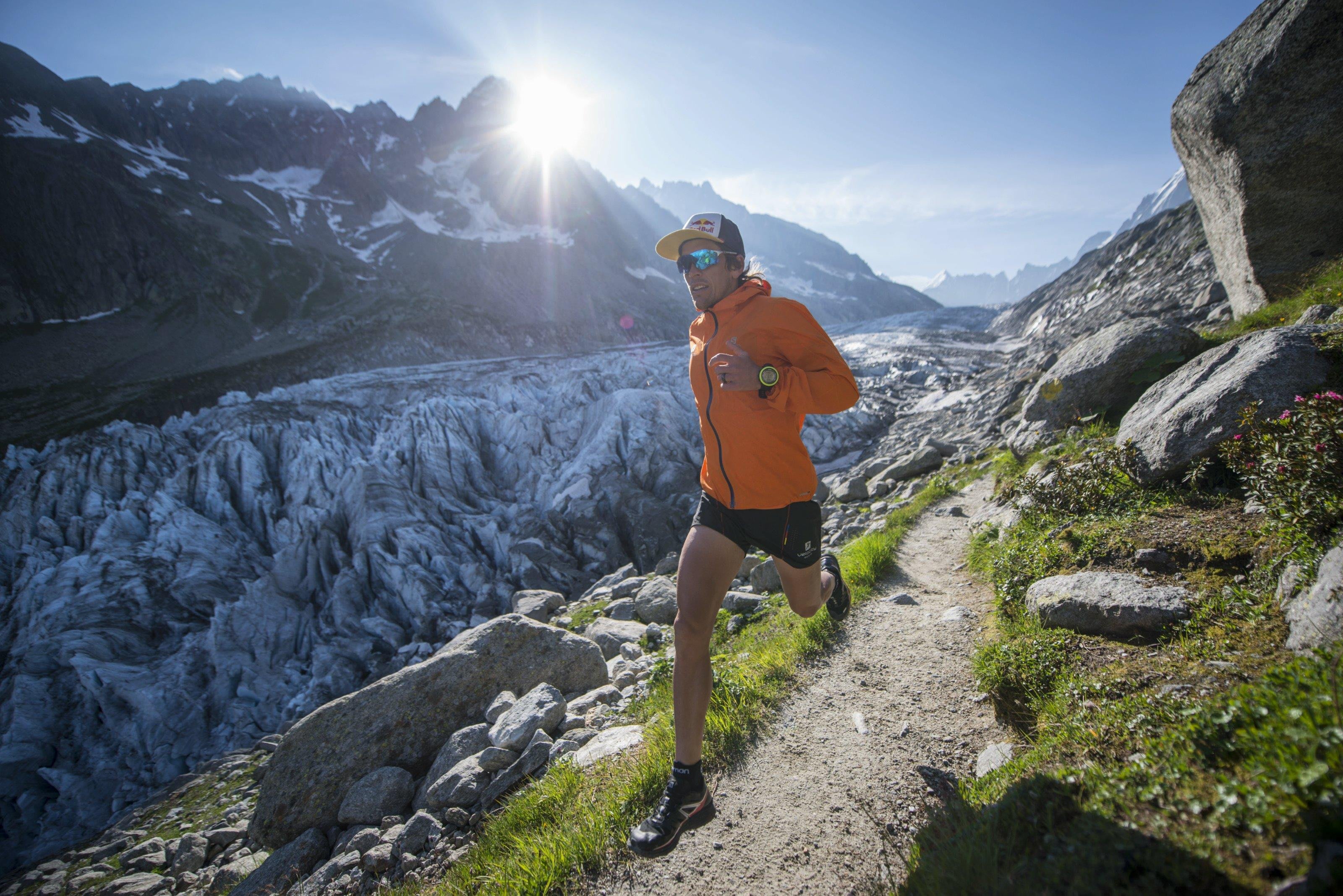 The mountains around Chamonix contain some of the world’s best trail runs and here ultra runner Ryan Sandes is running alongside the mighty Glacier d’Argentière, training for the Ultra Trail Mont Blanc.