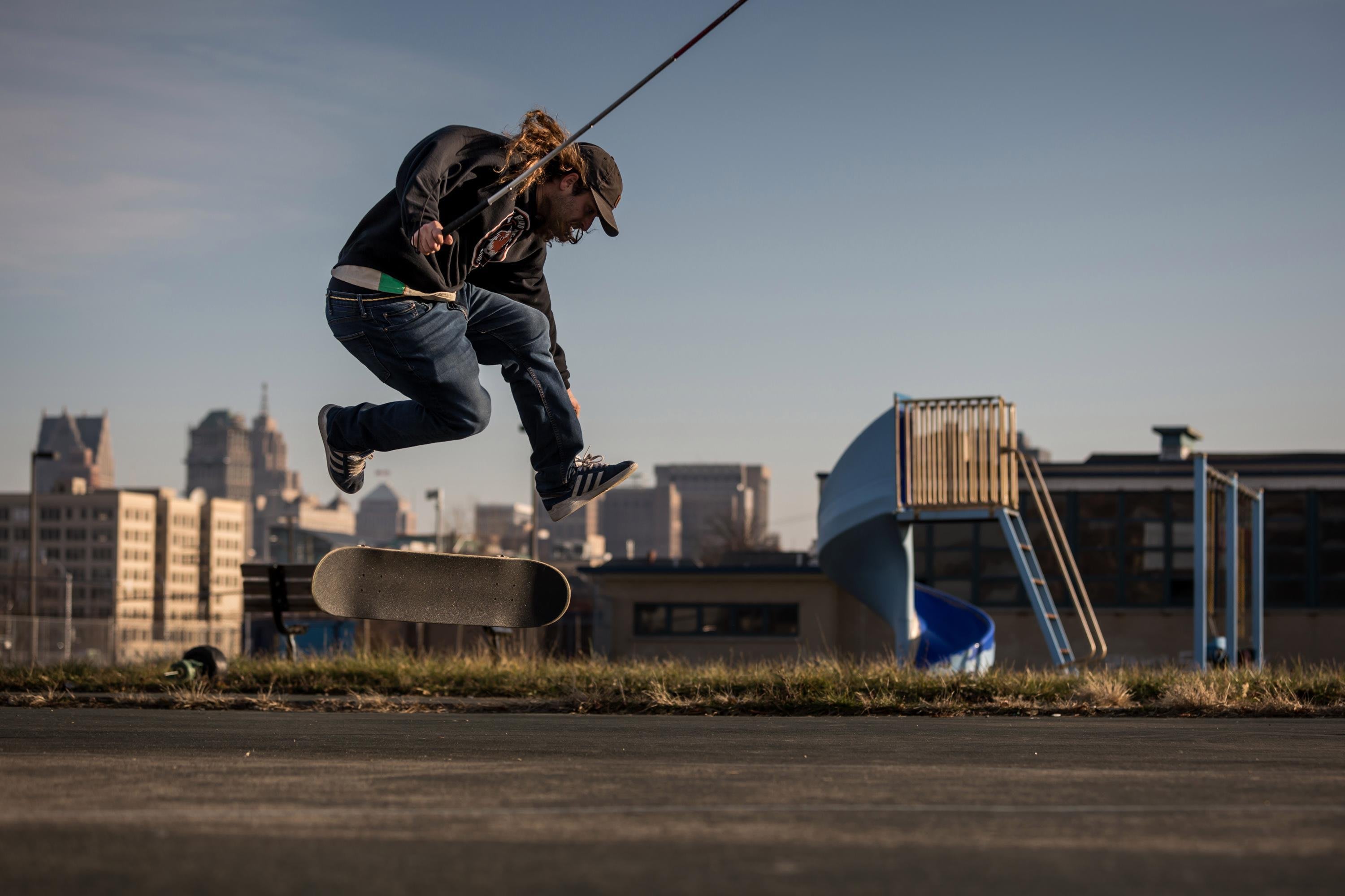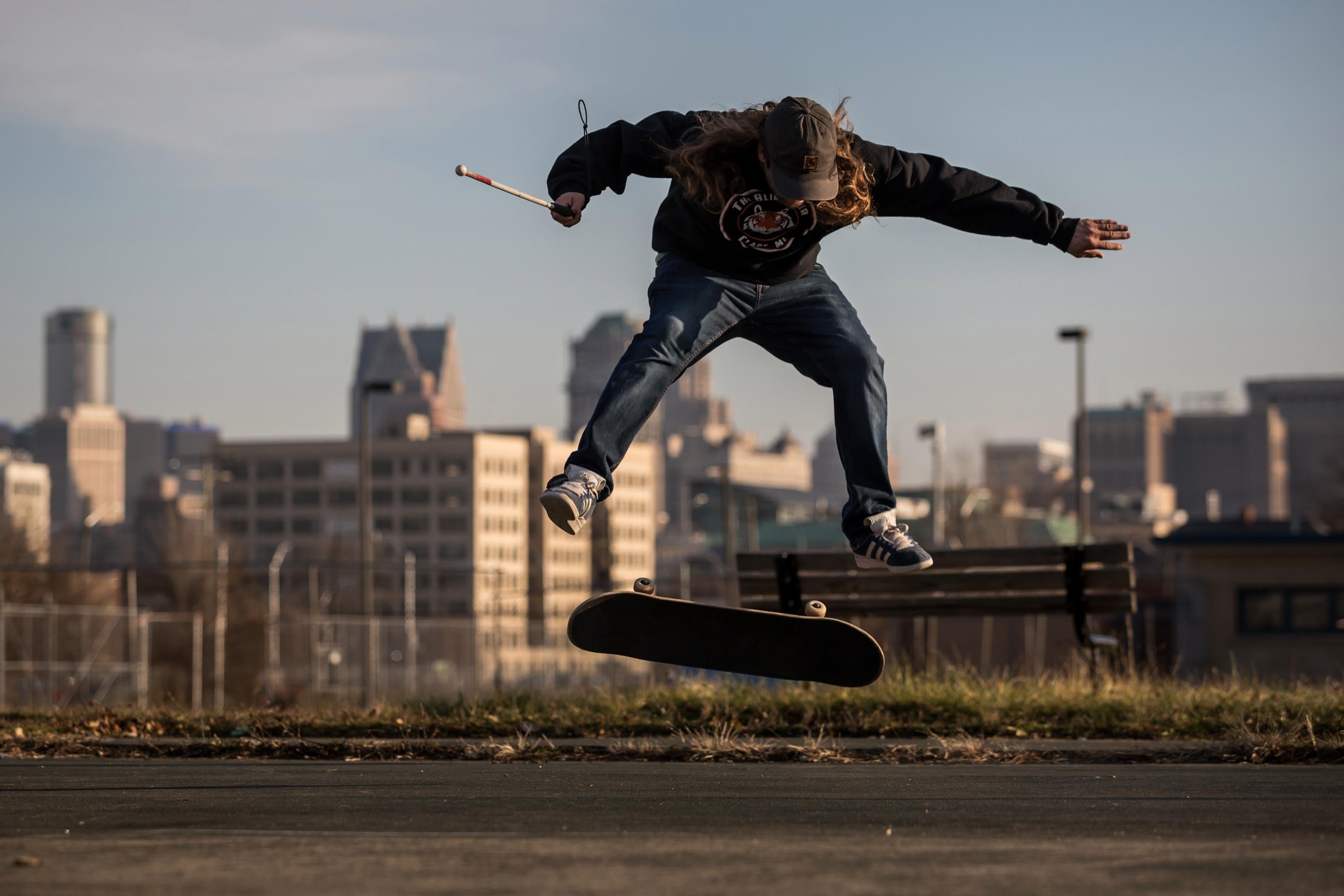 It's weird, you know. I can't see how tall ledges are, I don't have any depth perception so that's when the cane comes in handy. Just following those little things I can pick up the shadows, the dark to light – that helps guide me to the object or whatever I'm skating, but as far as once I pop, I can't see anything. I'm just moving too fast.