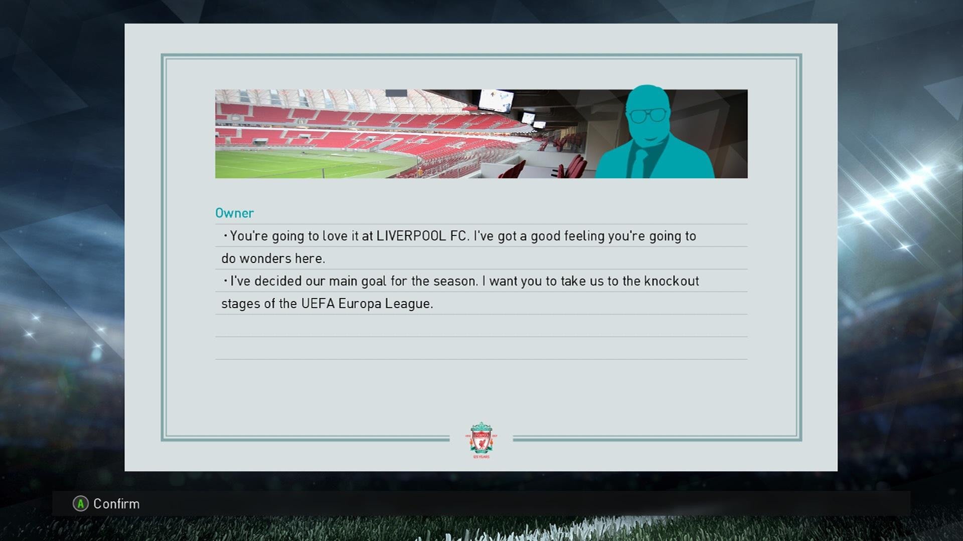 PES 2018's Master League mode features club owners this year. Ahead of the season, your team's owner will message you to provide set goals such as finishing above a certain position, and they'll also provide status updates in key scenarios – for example, when you're facing a rival team in an upcoming match.