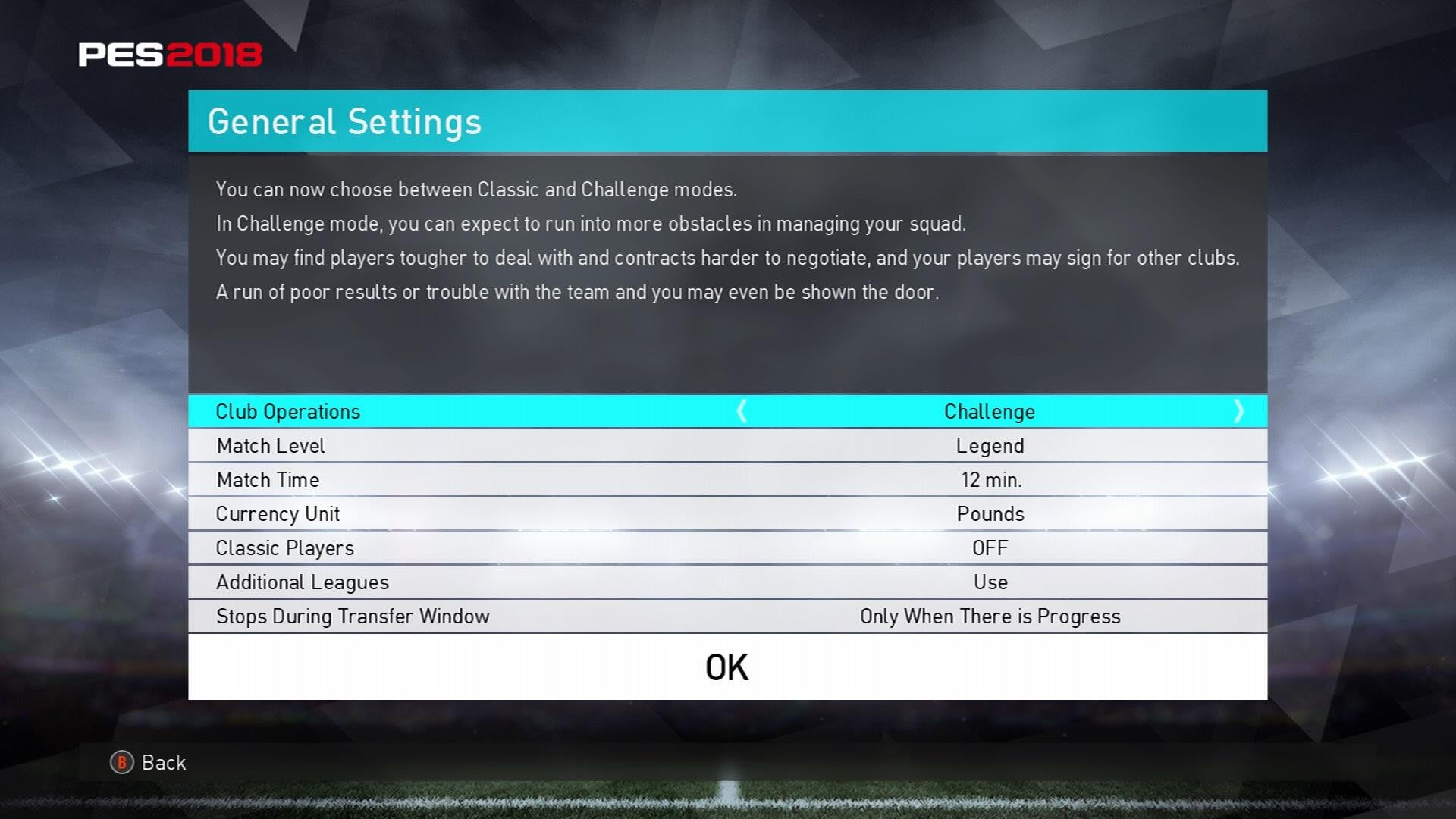 For dedicated series veterans, Master League's standard format can prove a little too easy. PES 2018 heightens the mode's difficulty by introducing an optional Challenge feature, with far tougher negotiation procedures for both squad members and transfer targets, as well as the possibility of being sacked if your performances aren't up to scratch.