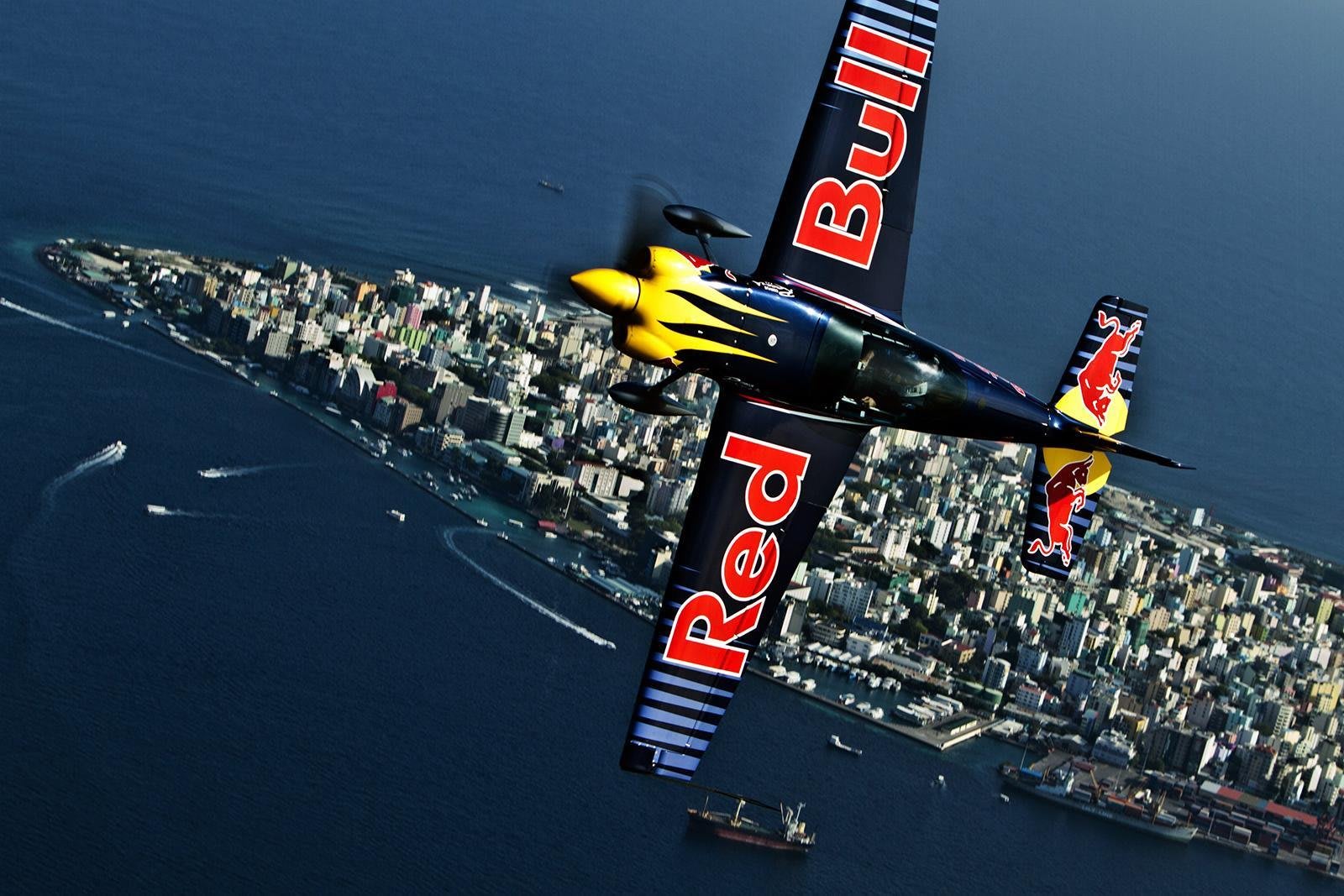 Close up of the top of Péter Besenyei's plane as he flies over Malé, Maldives, with the city and sea in the background in 2011.