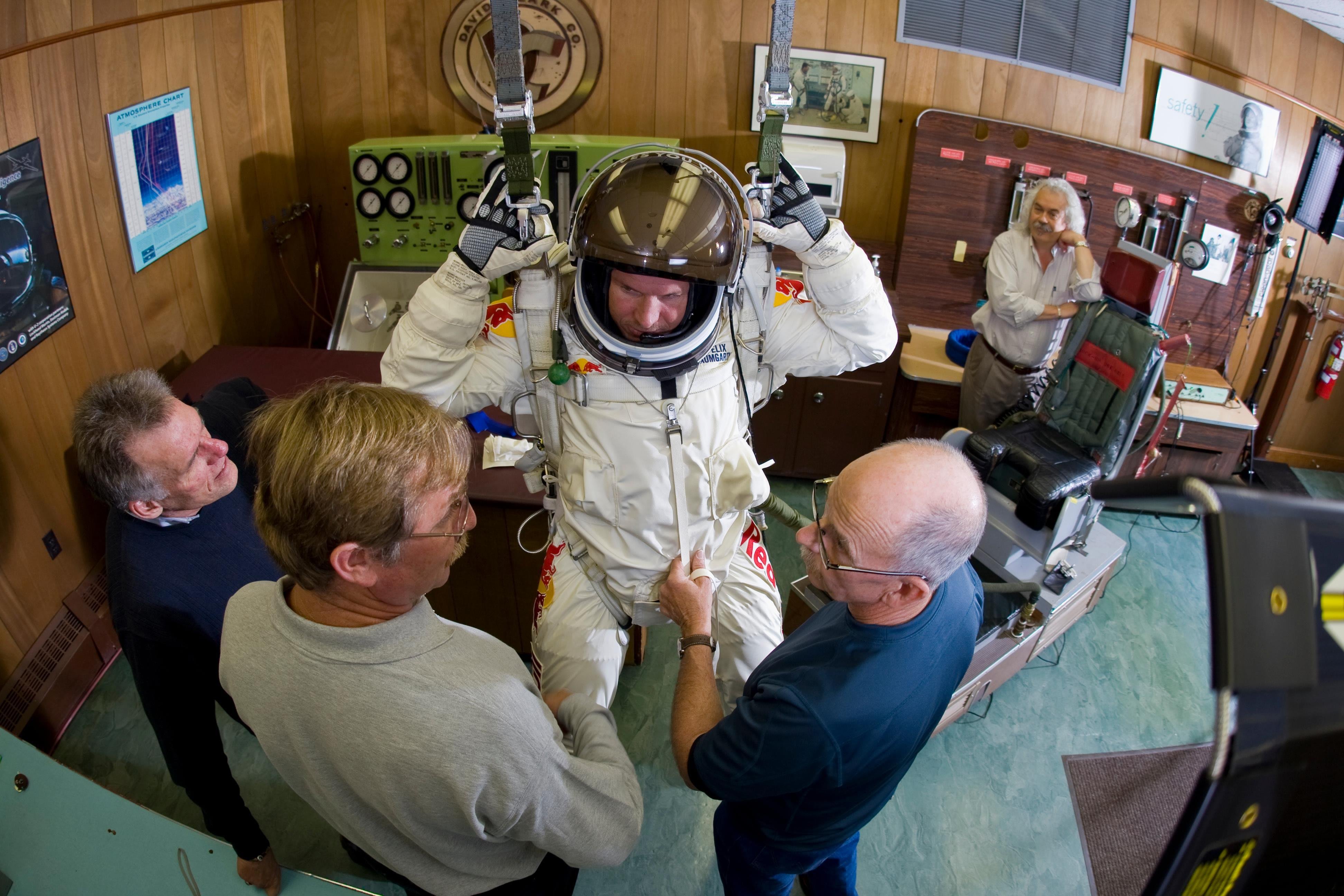 Speaking of sharing stories, we have some pictures we wanted to show you: Let’s start with this one, which was taken at the suit manufacturer, David Clark Company. Mike, you were responsible for maintaining the pressure suit that kept Felix alive in the stratosphere. Do you remember this moment?