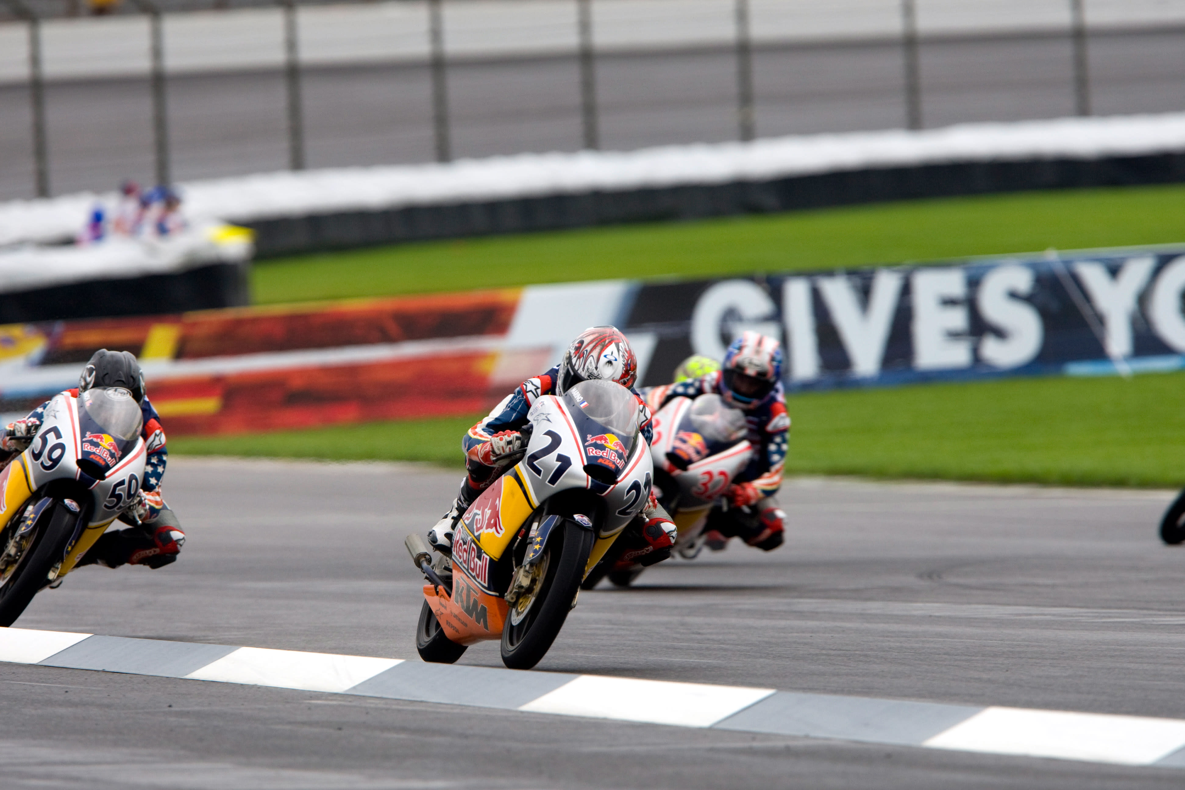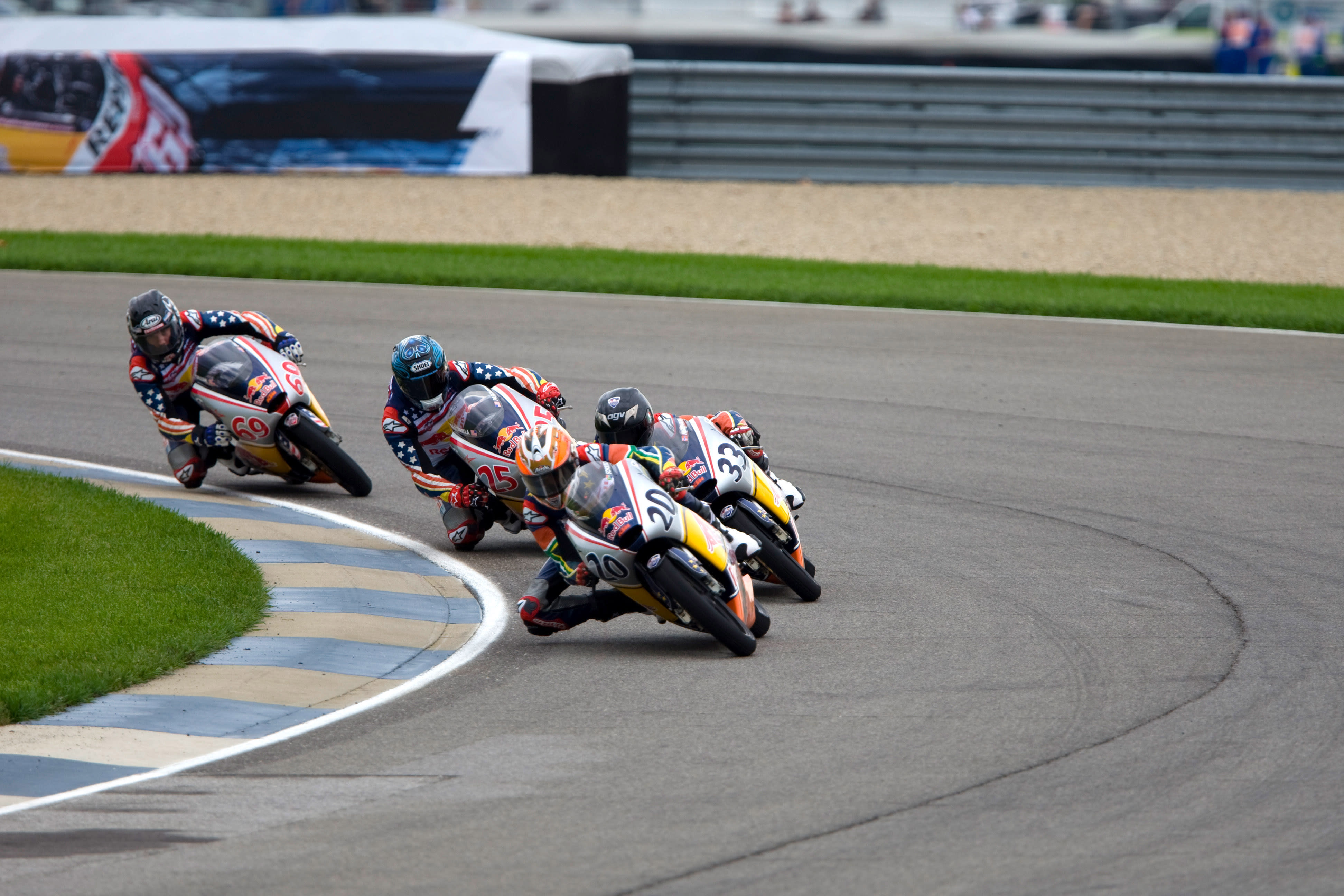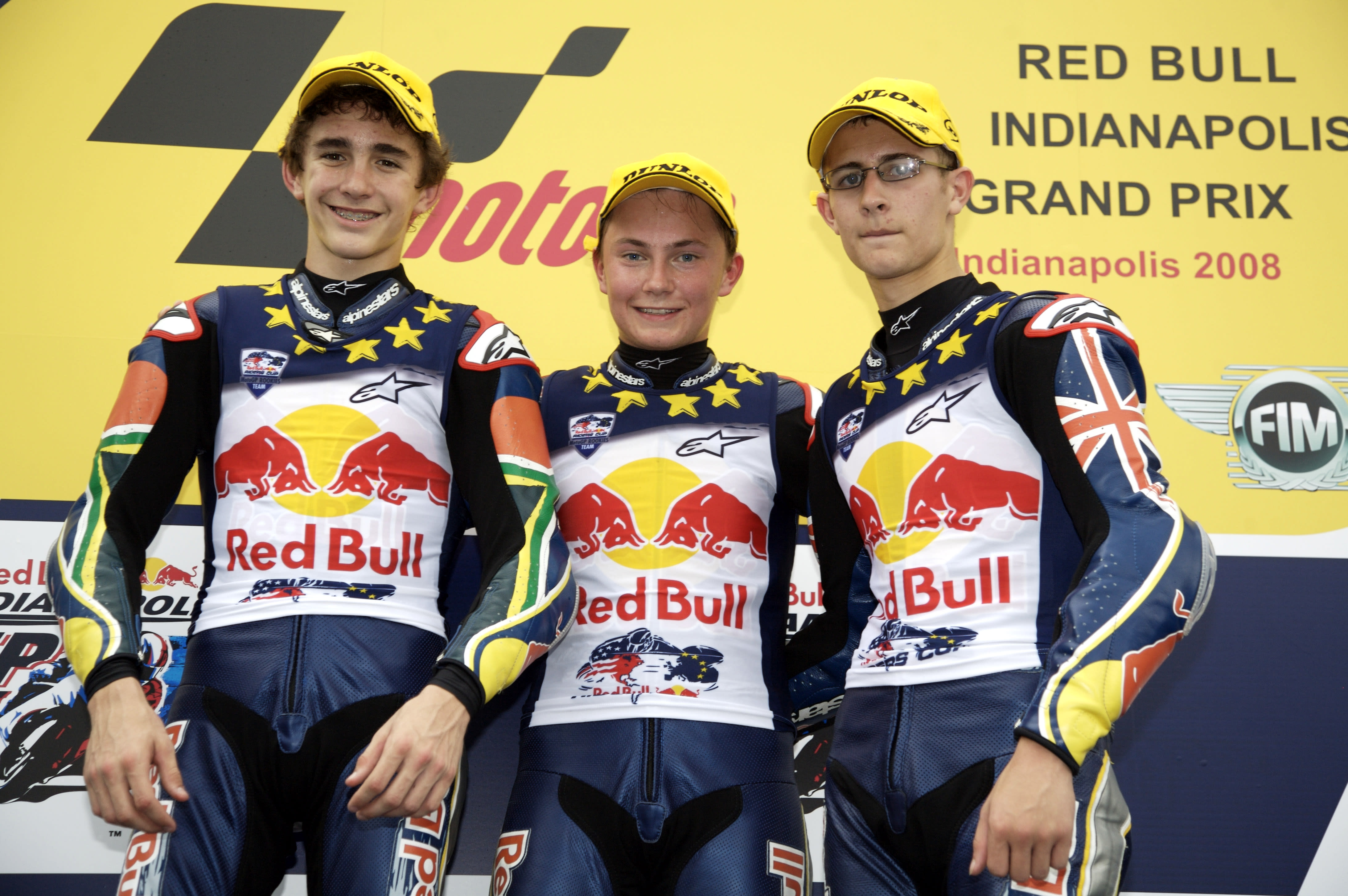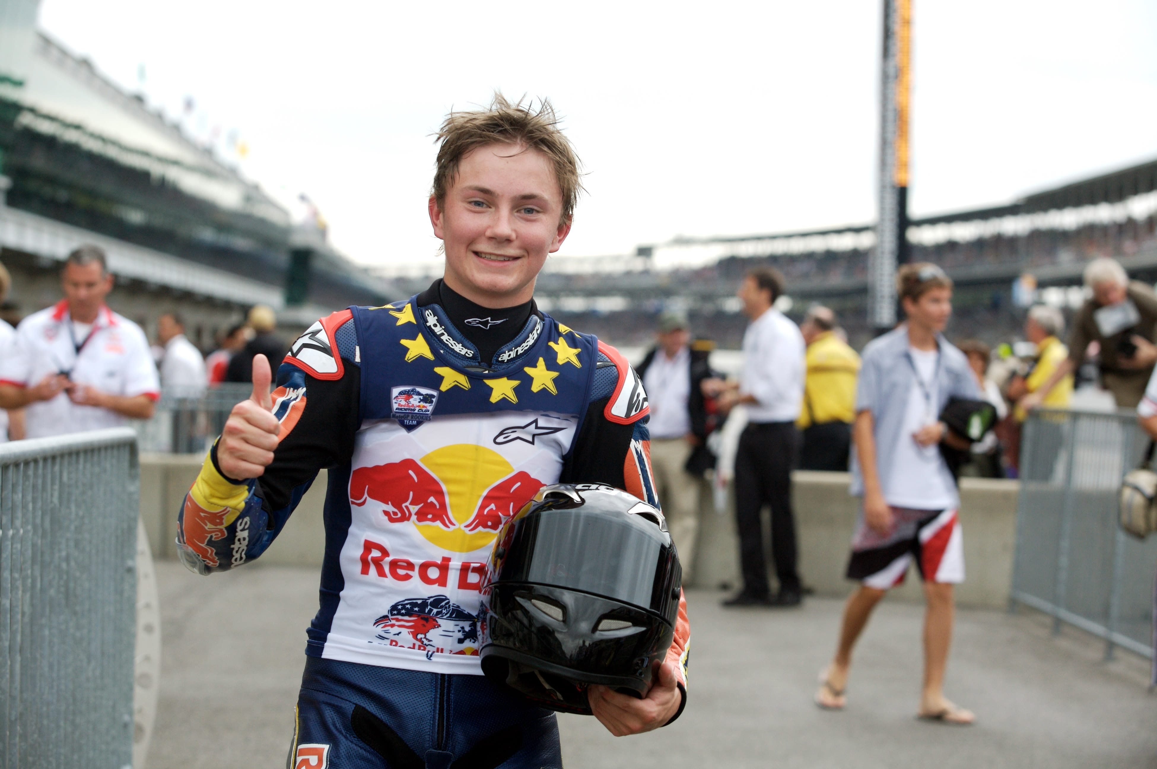 The Red Bull Riders Cup was seized by the visiting MotoGP Rookies Team as they swept the leaderboard at the Indianapolis Motor Speedway. In tricky damp to wet conditions 16 year old Norwegian Sturla Fagerhaug rode superbly to head home 16 year old South African Mathew Scholtz and 17 year old Briton Matthew Hoyle.
