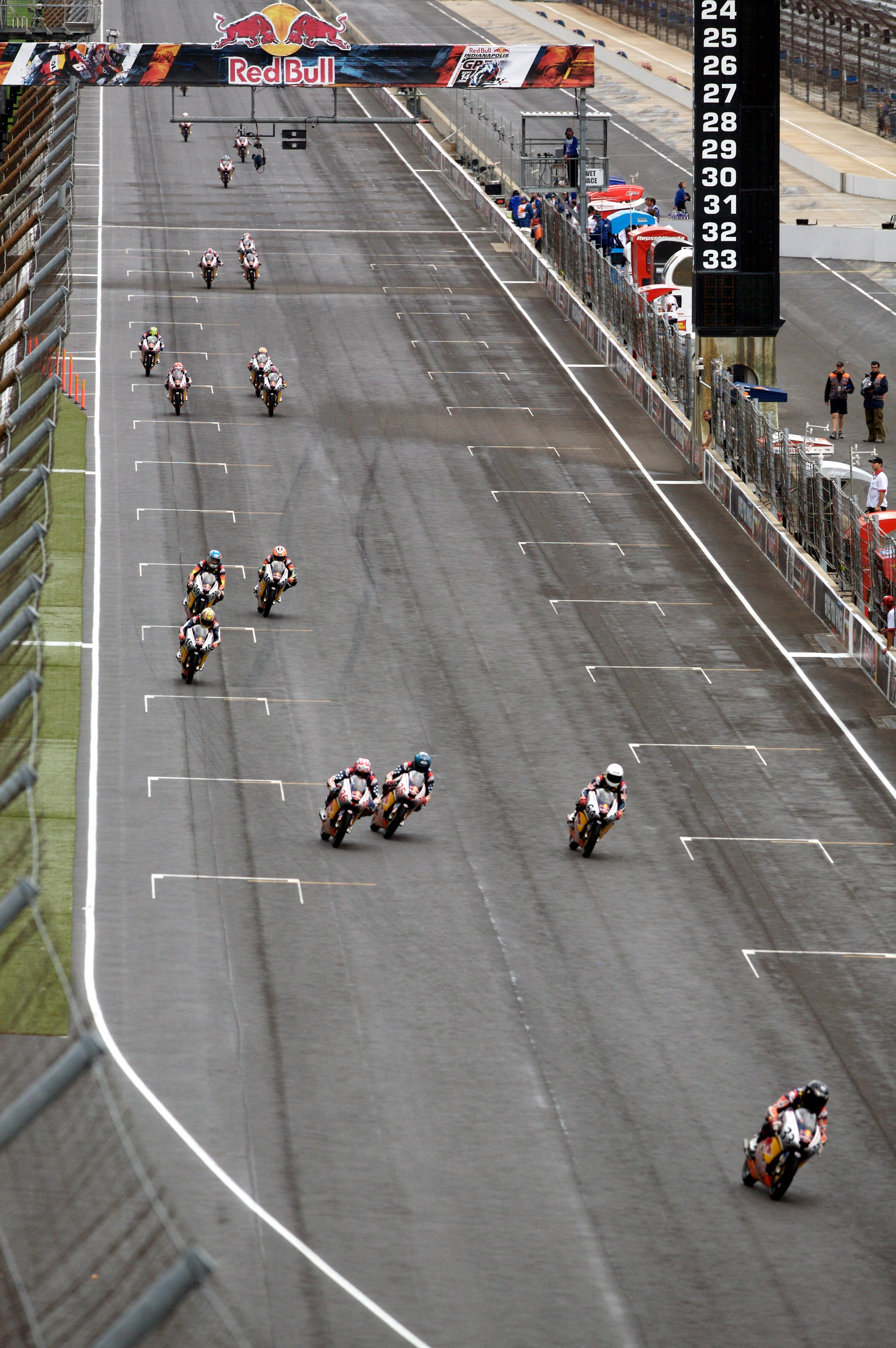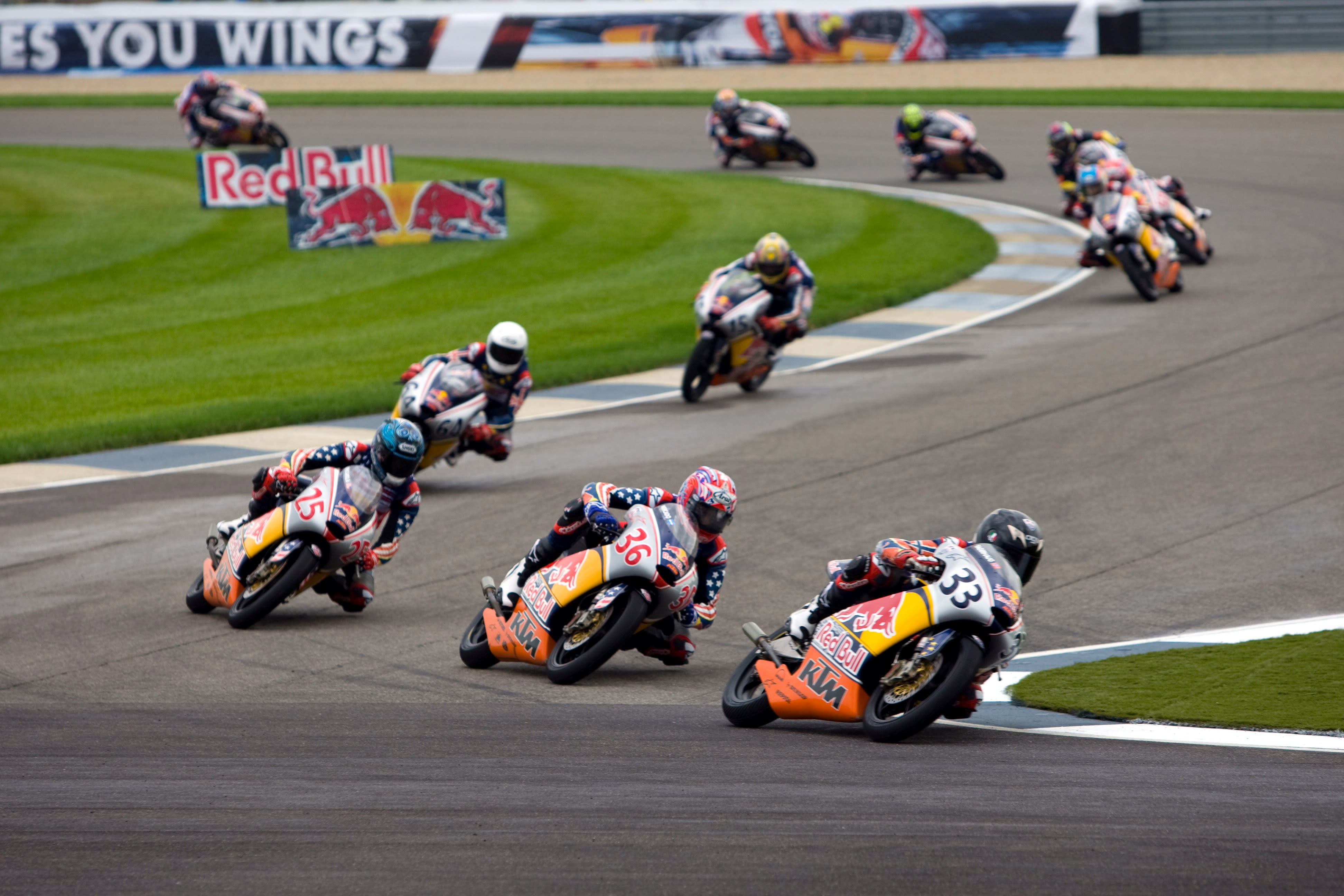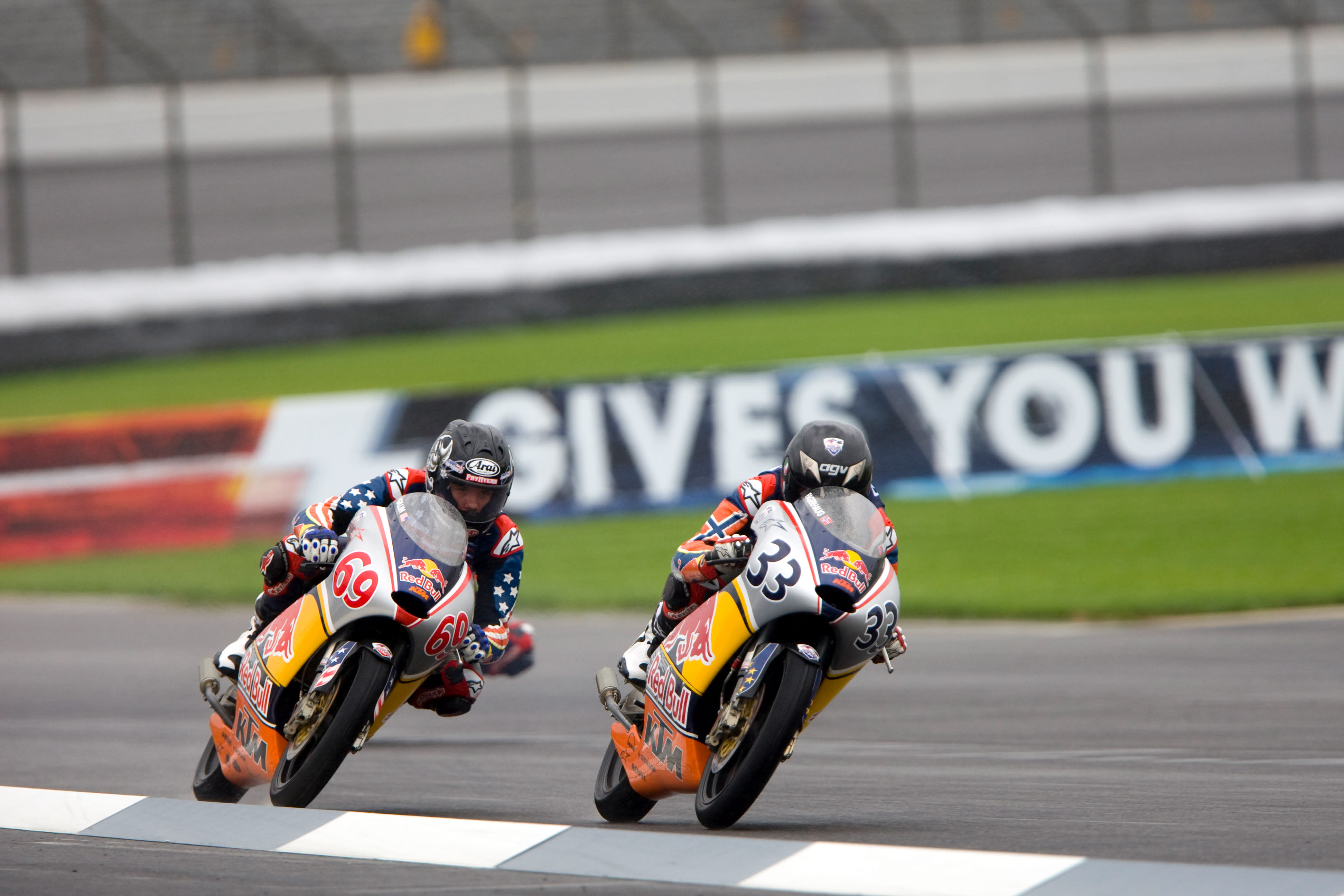 The Red Bull Riders Cup was seized by the visiting MotoGP Rookies Team as they swept the leaderboard at the Indianapolis Motor Speedway. In tricky damp to wet conditions 16 year old Norwegian Sturla Fagerhaug rode superbly to head home 16 year old South African Mathew Scholtz and 17 year old Briton Matthew Hoyle.