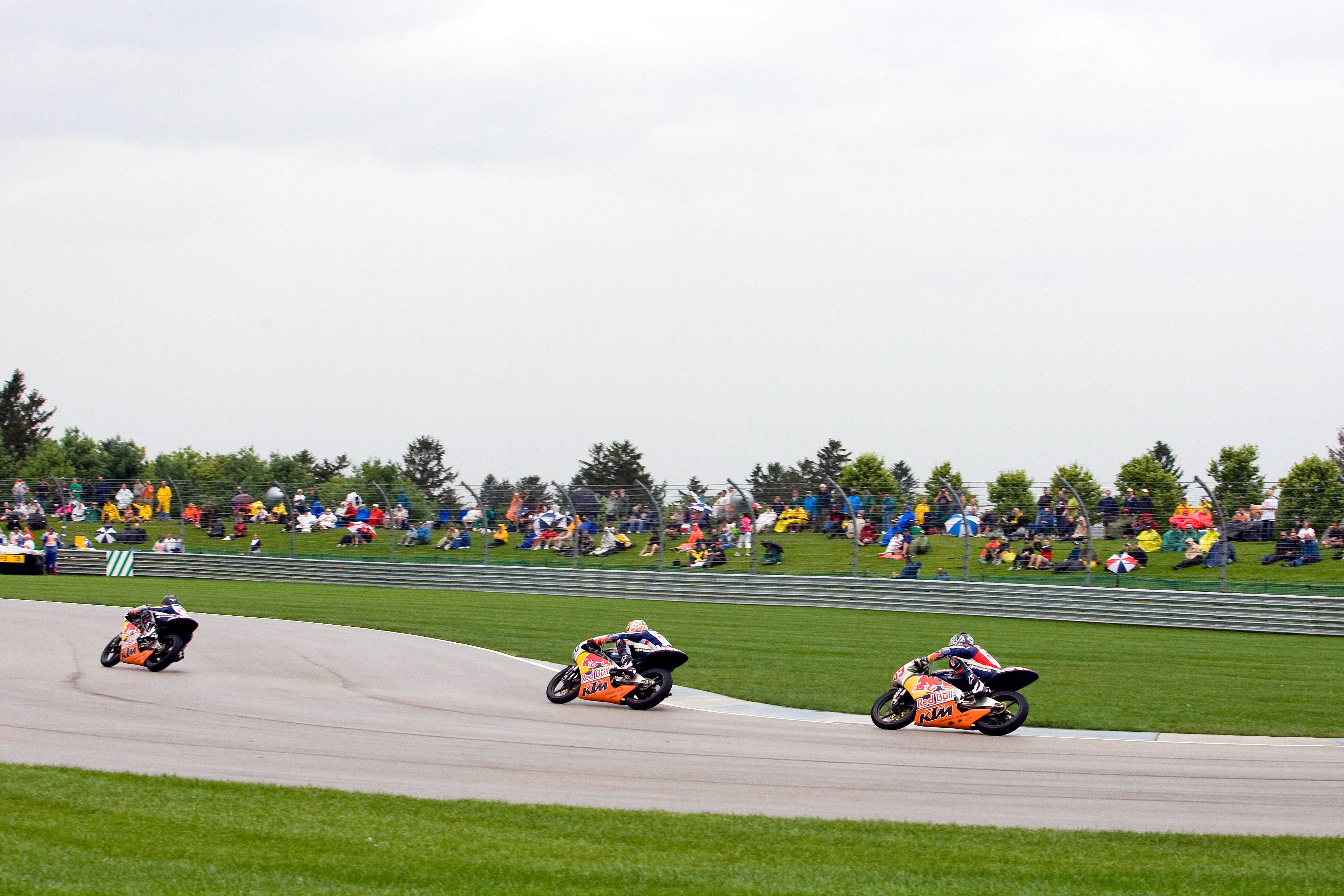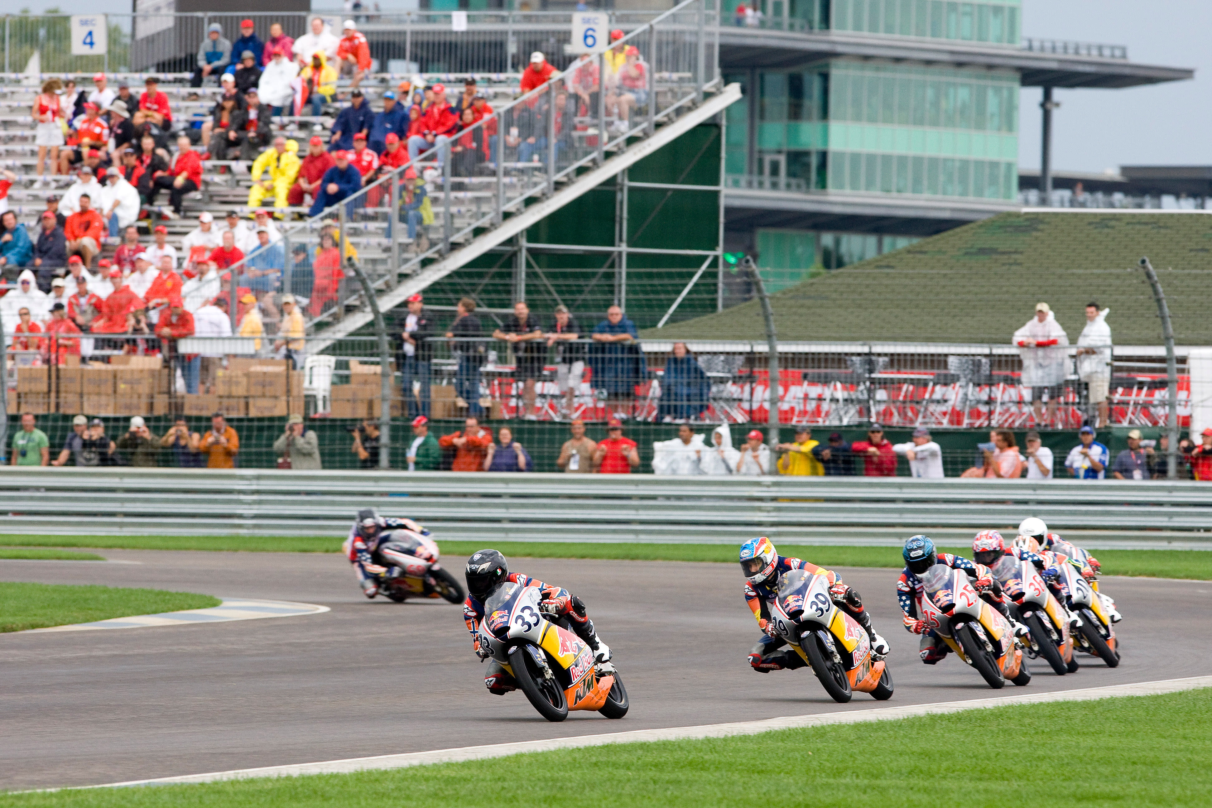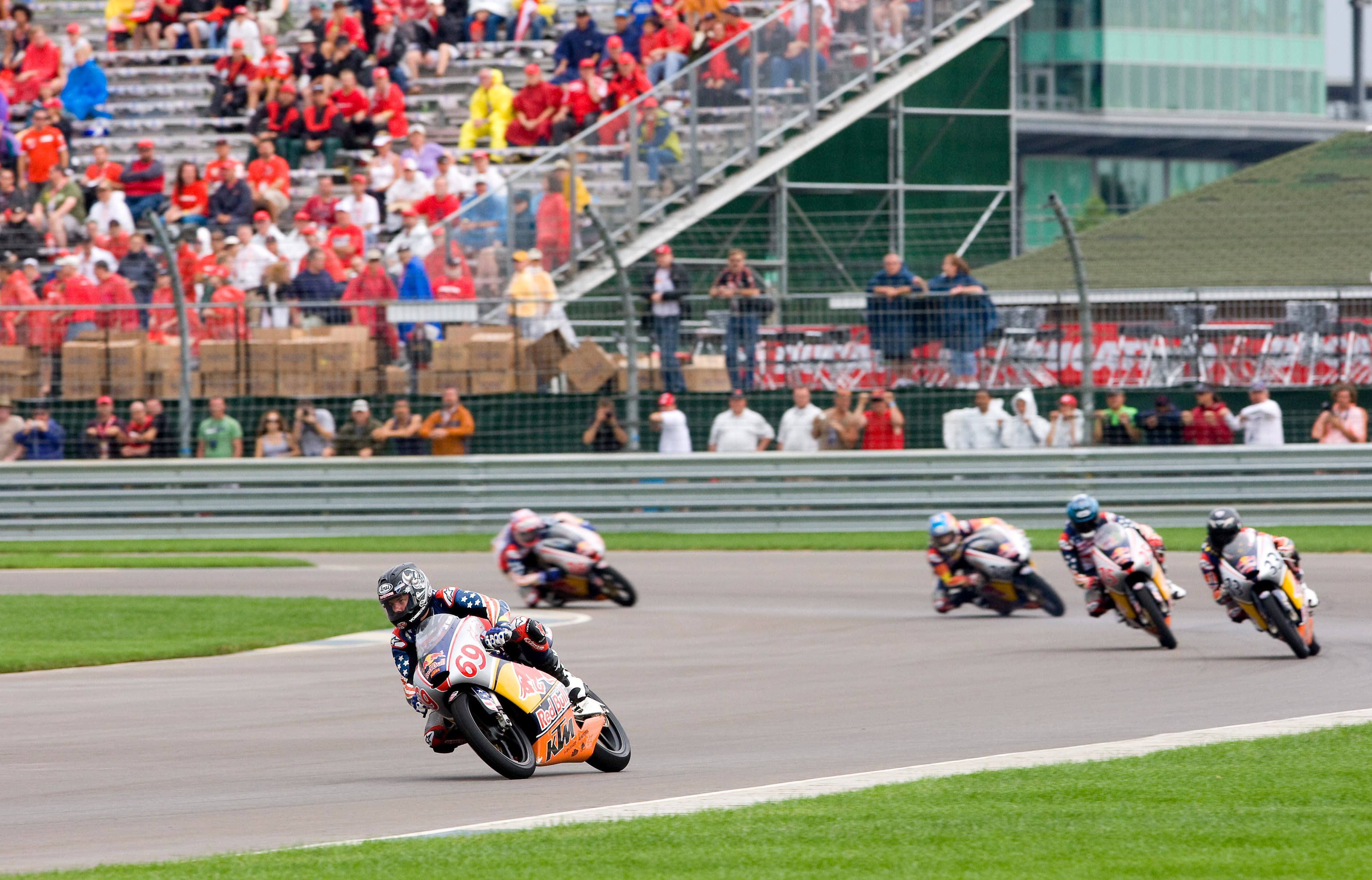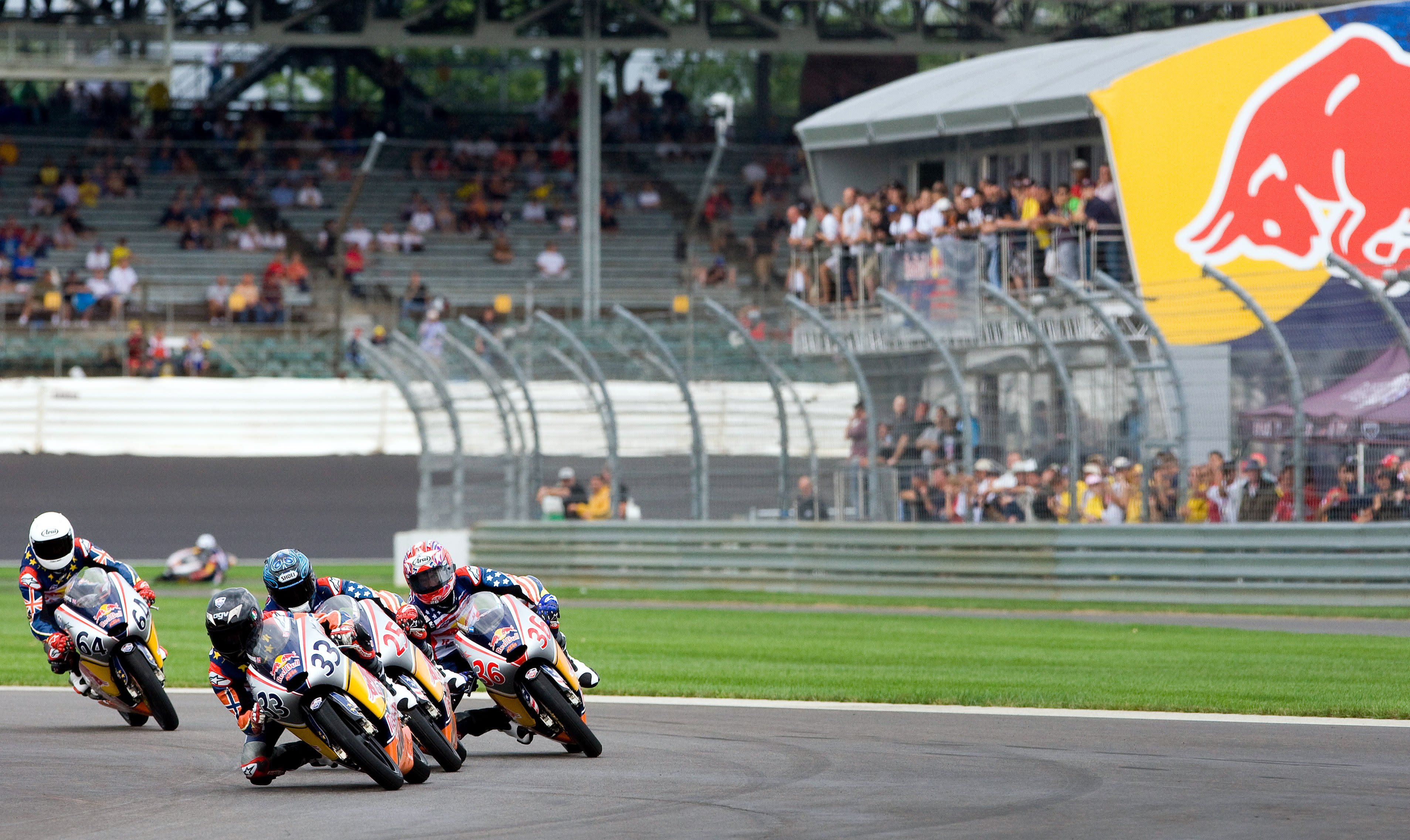 The Red Bull Riders Cup was seized by the visiting MotoGP Rookies Team as they swept the leaderboard at the Indianapolis Motor Speedway. In tricky damp to wet conditions 16 year old Norwegian Sturla Fagerhaug rode superbly to head home 16 year old South African Mathew Scholtz and 17 year old Briton Matthew Hoyle.