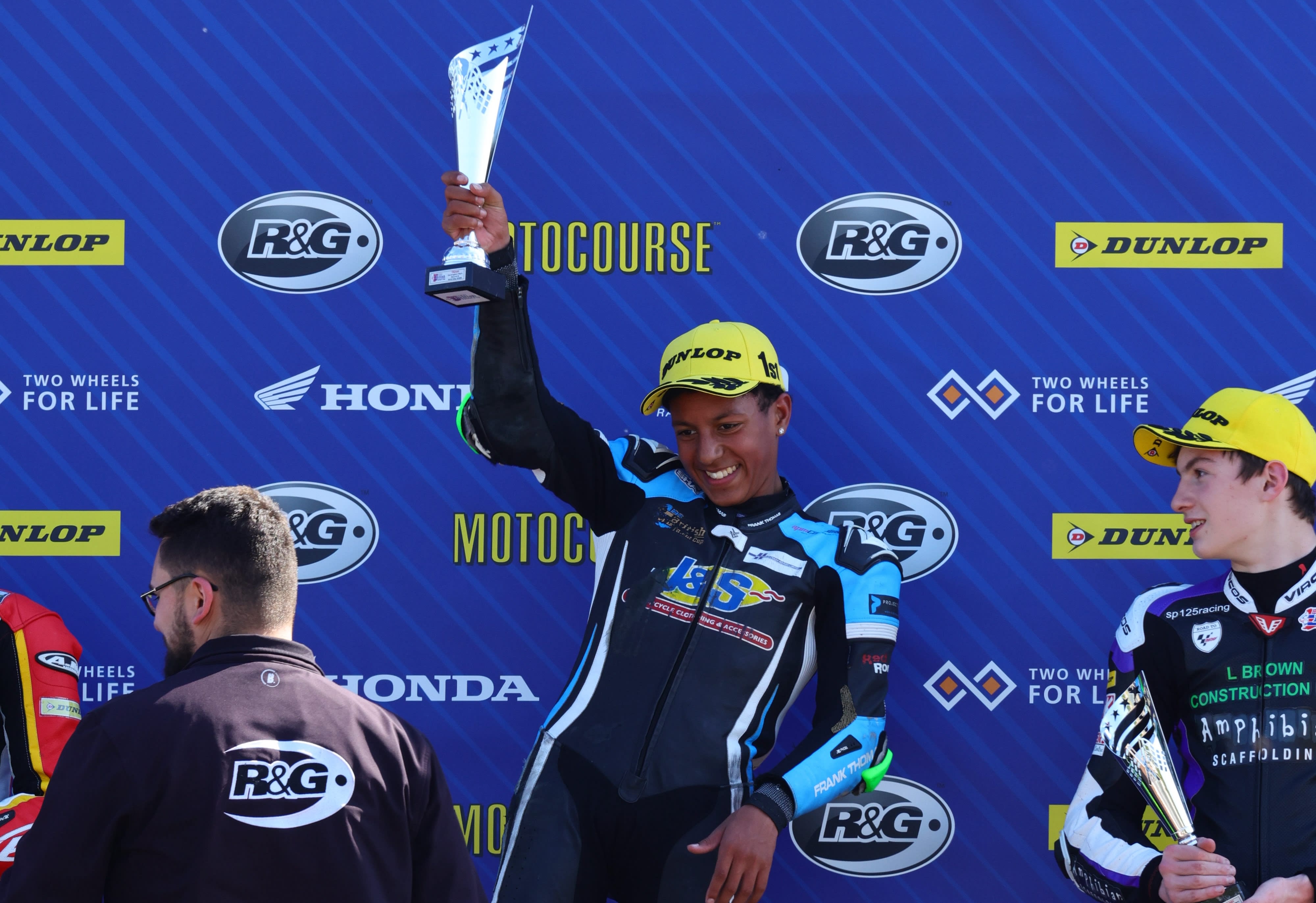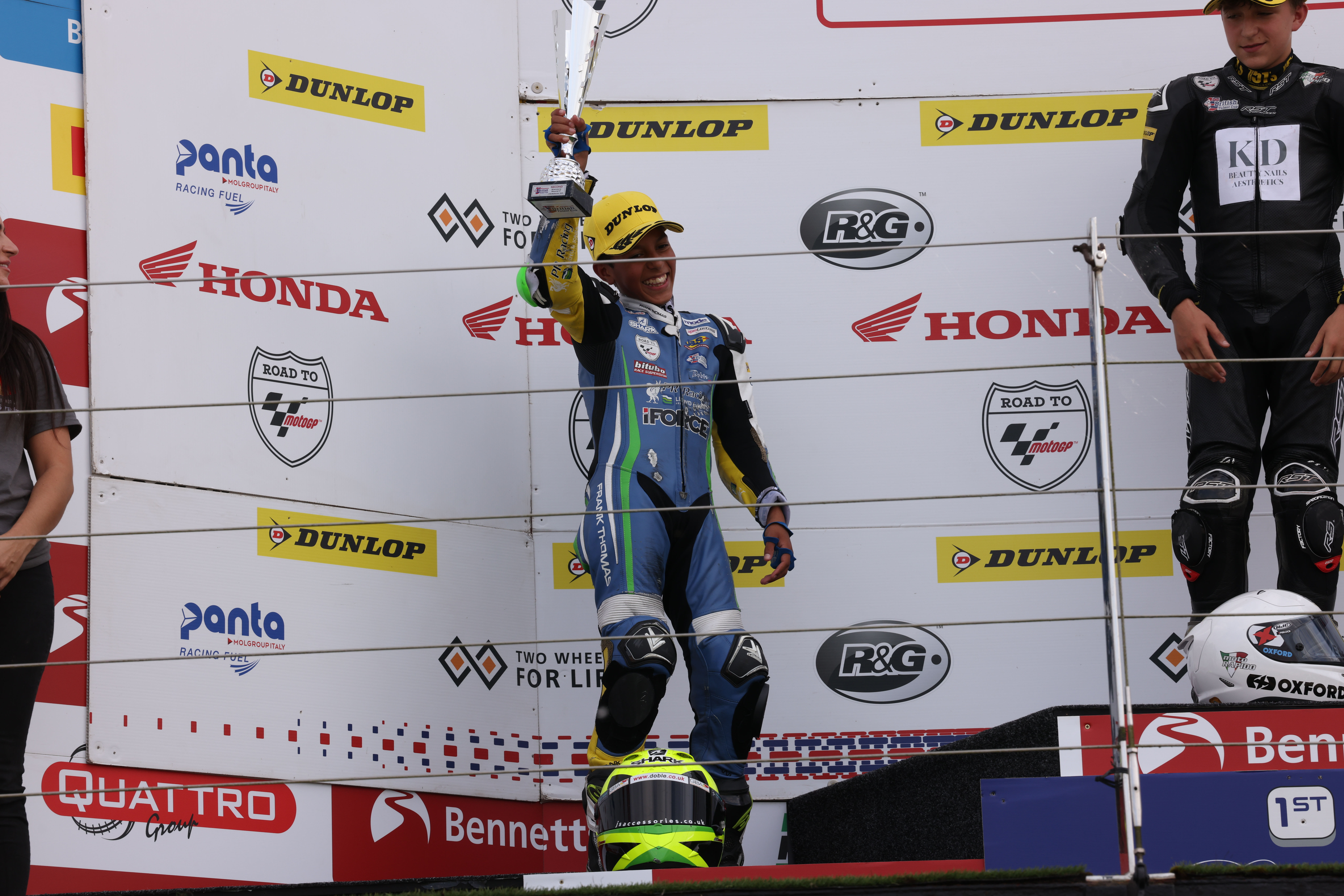 "By Race 2 I was pacing myself but then missed the last lap board which was annoying as I was swapping positions with ease. My Dad got my pit board painted dayglow yellow after that! At round two I qualified in P2 but unlike Silverstone I was not the fastest, but I still got my first win which was just the best feeling ever, plus it taught me that you don’t always need to be the fastest to win. That was a key moment. I got overzealous in Race 2 and rather than settle for 2nd when another rider got me on the last corner I got a bit keen on the gas going for the cutback and highsided out of it. Another lesson in patience, keep an eye on the long game. 2nd would’ve worked but it’s so hard to think and calculate and race at the same time when all you want to do is win again. We had a solid finish in Scotland, a bit of a difficult Snetterton but came back strong and I won at tracks I’d struggled at before or not seen due to previous season's complications, so the momentum picked up. I had a great win at MotoGP Silverstone, winning with a 23sec gap even after saving a highside that ran me off the track and cost a fair few seconds."