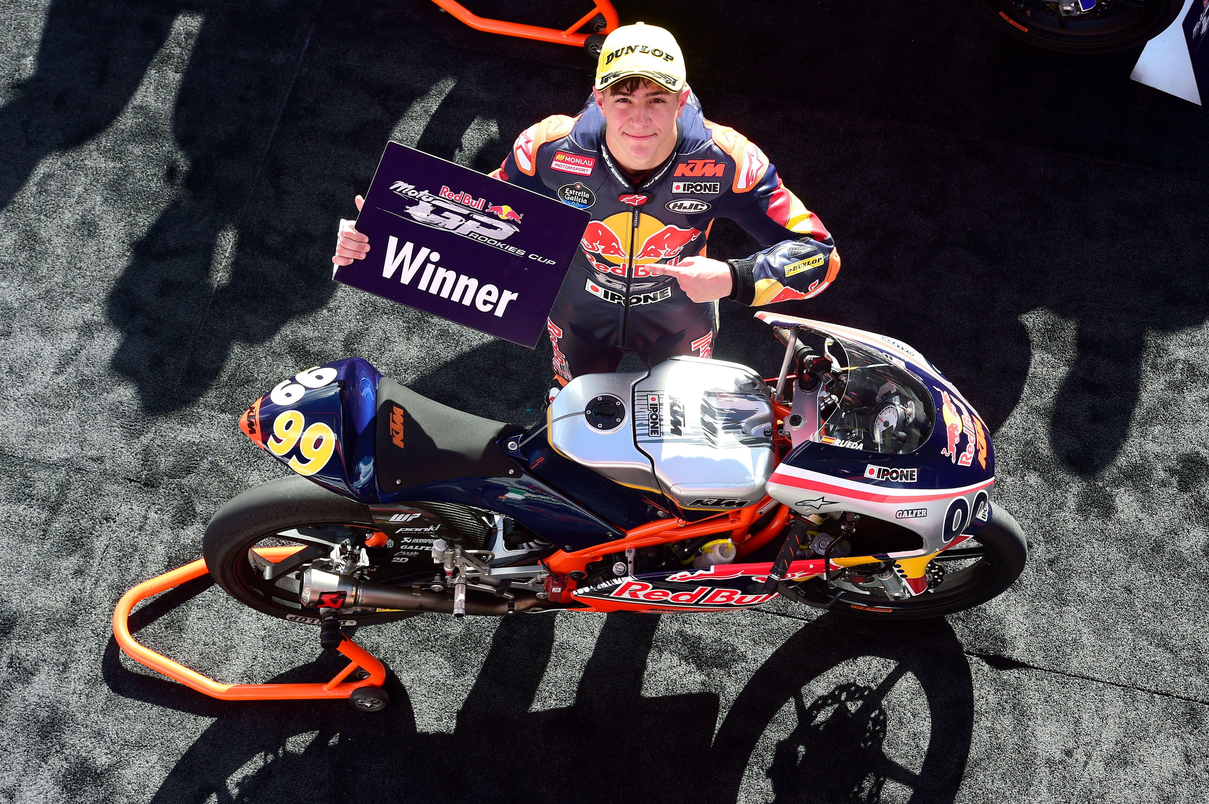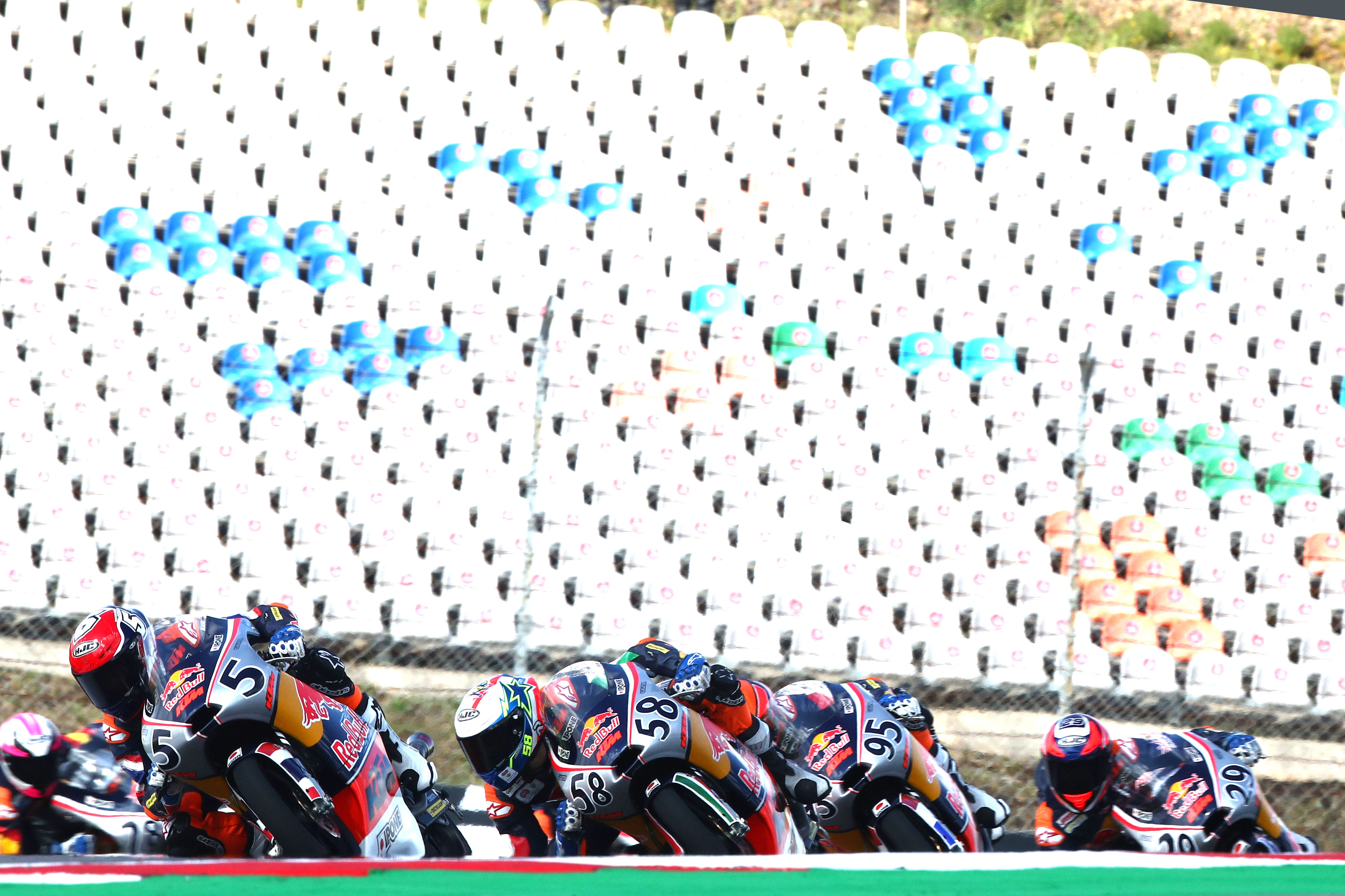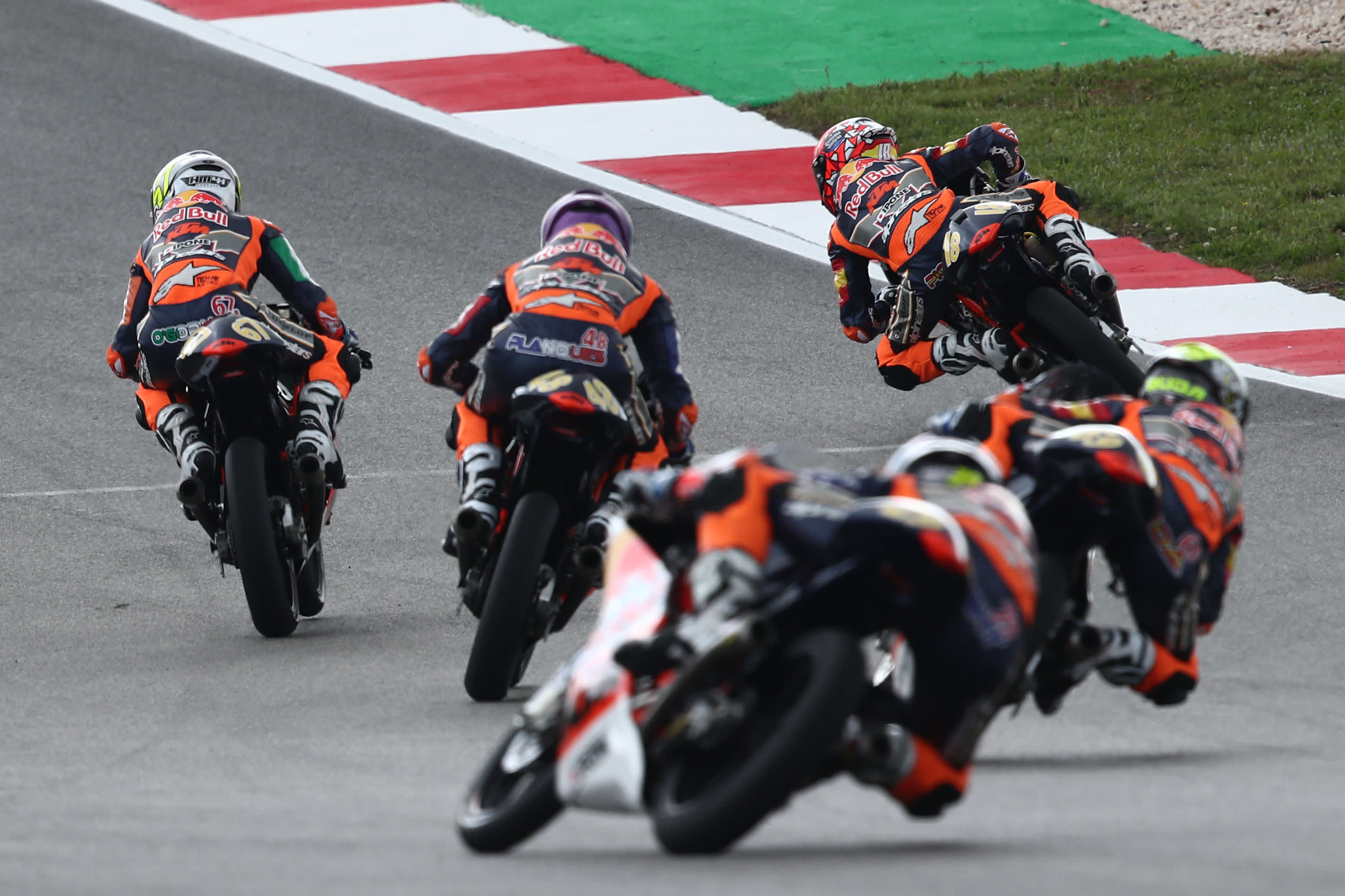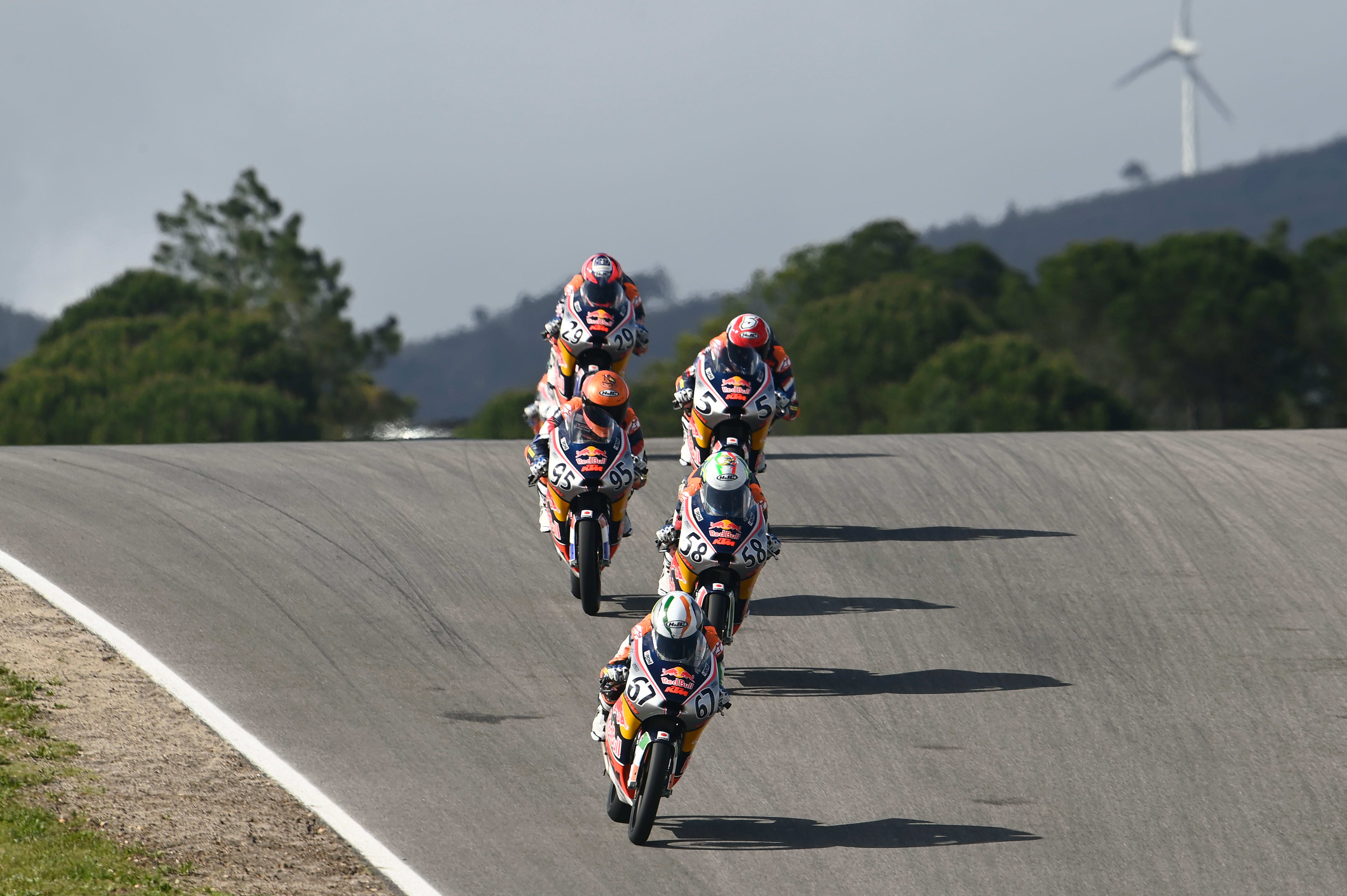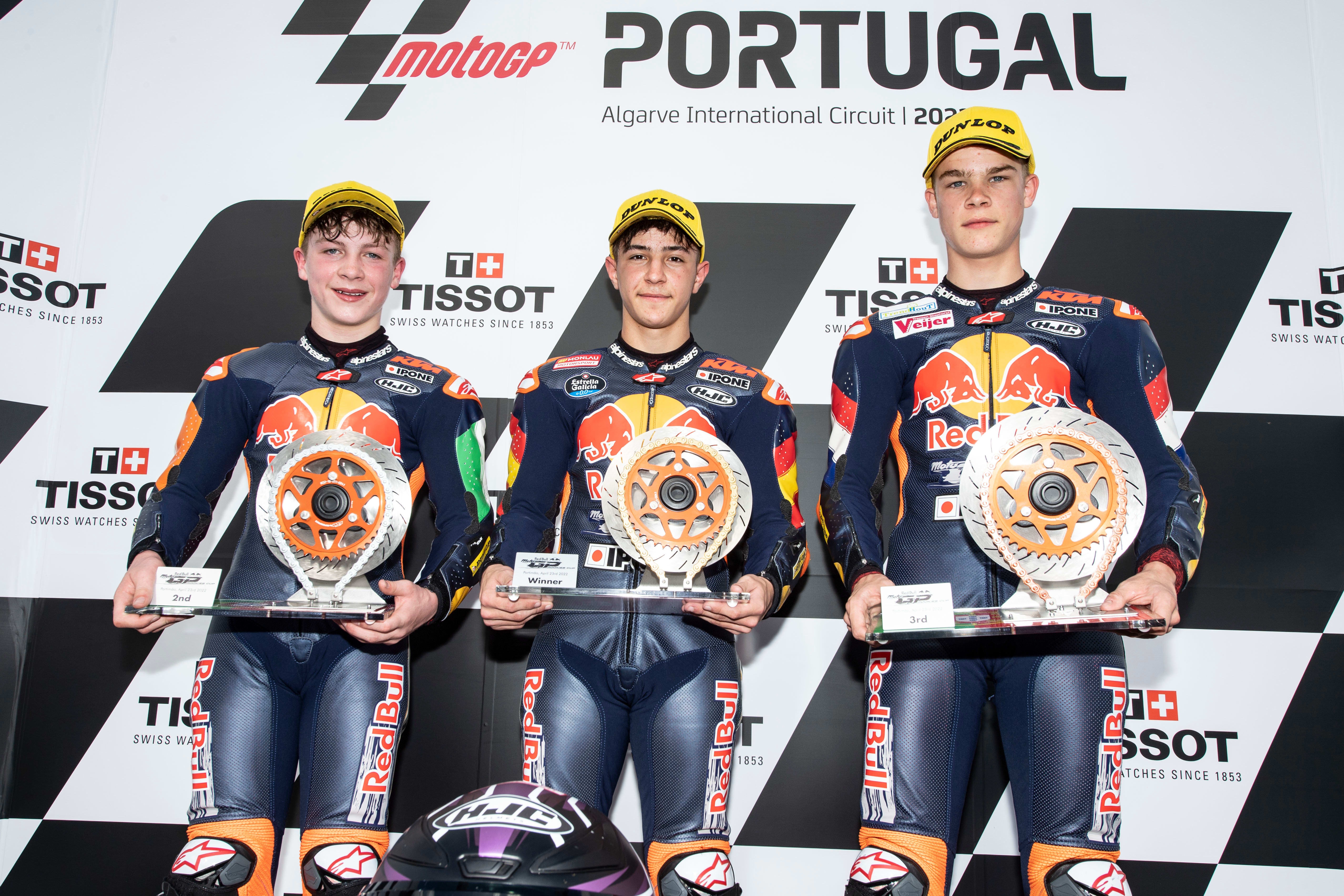 José Rueda rode a brilliant debut race to claim victory in the Red Bull MotoGP Rookies Cup at Portimão. The 16-year-old Spaniard seized an early lead and put in a near perfect ride. Fellow countryman Angel Piqueras hunted him down and the 15-year-old pole man was on his tail by the penultimate lap.