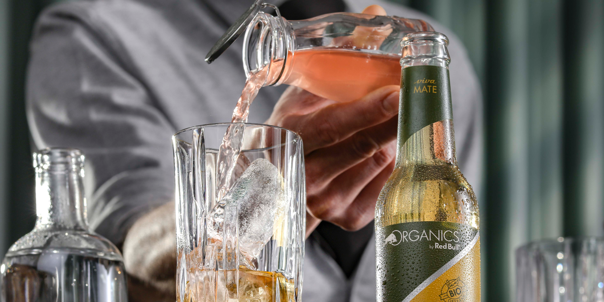 Mate Rub - a special cocktail with rhubarb and lemon juice, herbal liqueur, vodka and ORGANICS Viva Mate. Discover the recipe now and mix your cocktail!