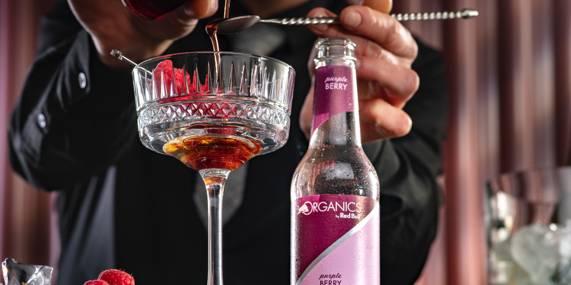 Springtime - a bubbly cocktail with raspberries, apple liquor, prosecco and ORGANICS Purple Berry. Discover the recipe and mix your drink now!