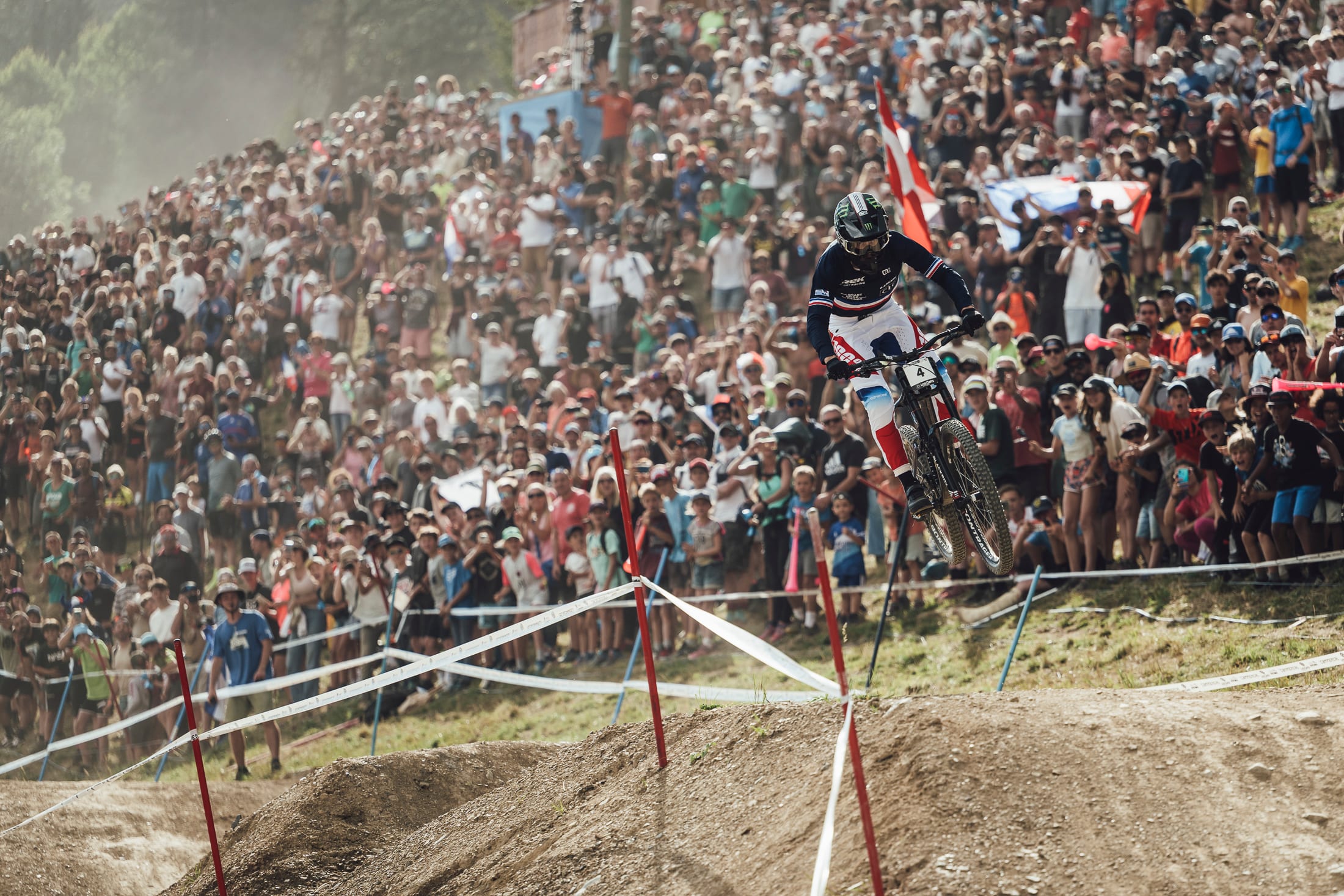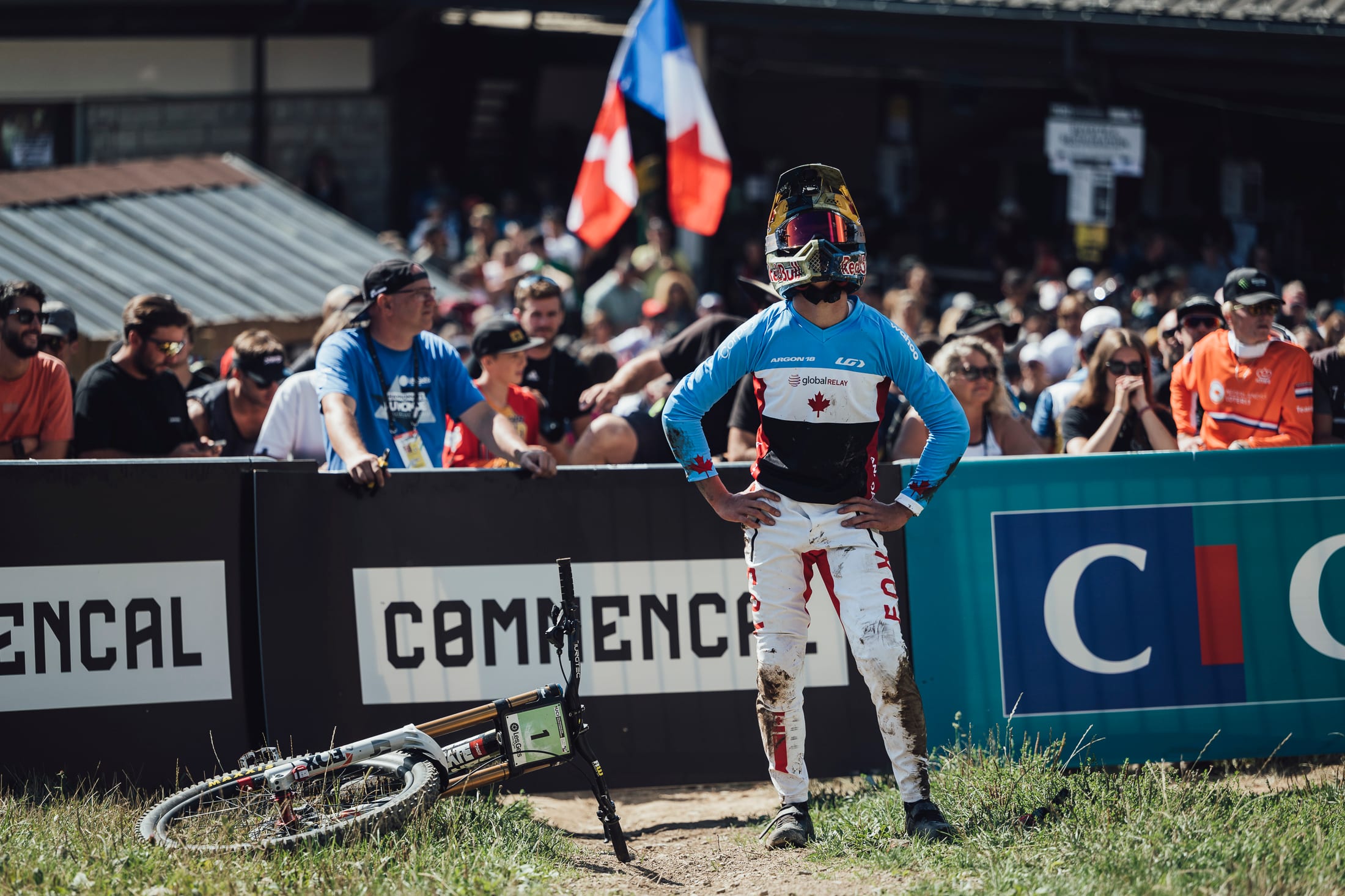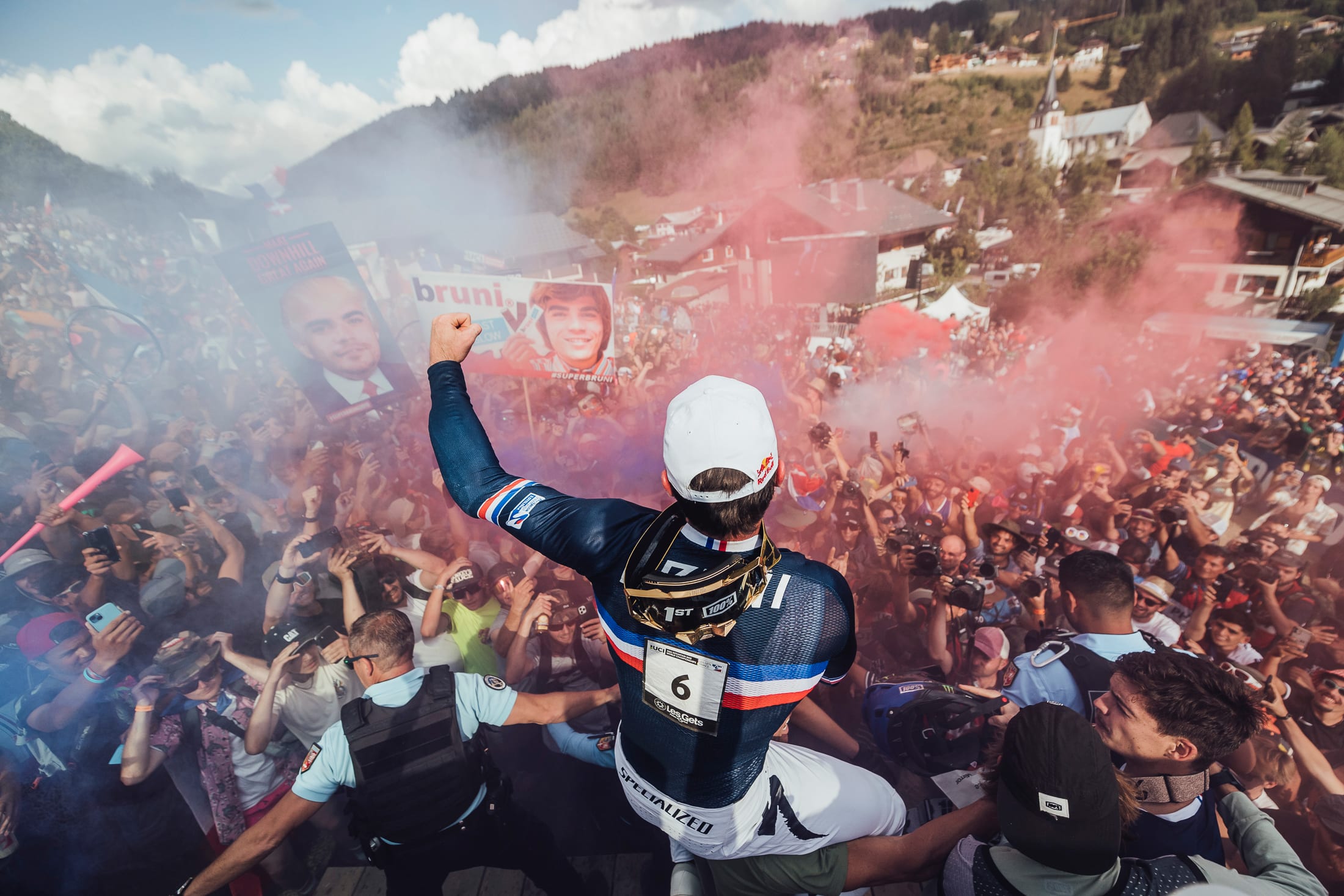 Bruni then had to wait on the hotseat for three more French riders to go down. These men were Benoît Coulanges, Loris Vergier and, last man down, Amaury Pierron. Vergier and Pierron couldn't quite match Bruni's pace, but they did slide into the medal positions with both of them beating Brosnan's time. Vergier finished third, taking the bronze, while Pierron slotted into silver after going nearly a second faster than Vergier. Pierron was, however, 2.5s back on Bruni's winning time. The scenes at the end of the race were truly epic with the French fans descending on the finish area and Bruni having to be protected by the French police from fans eager to get close to their hero.